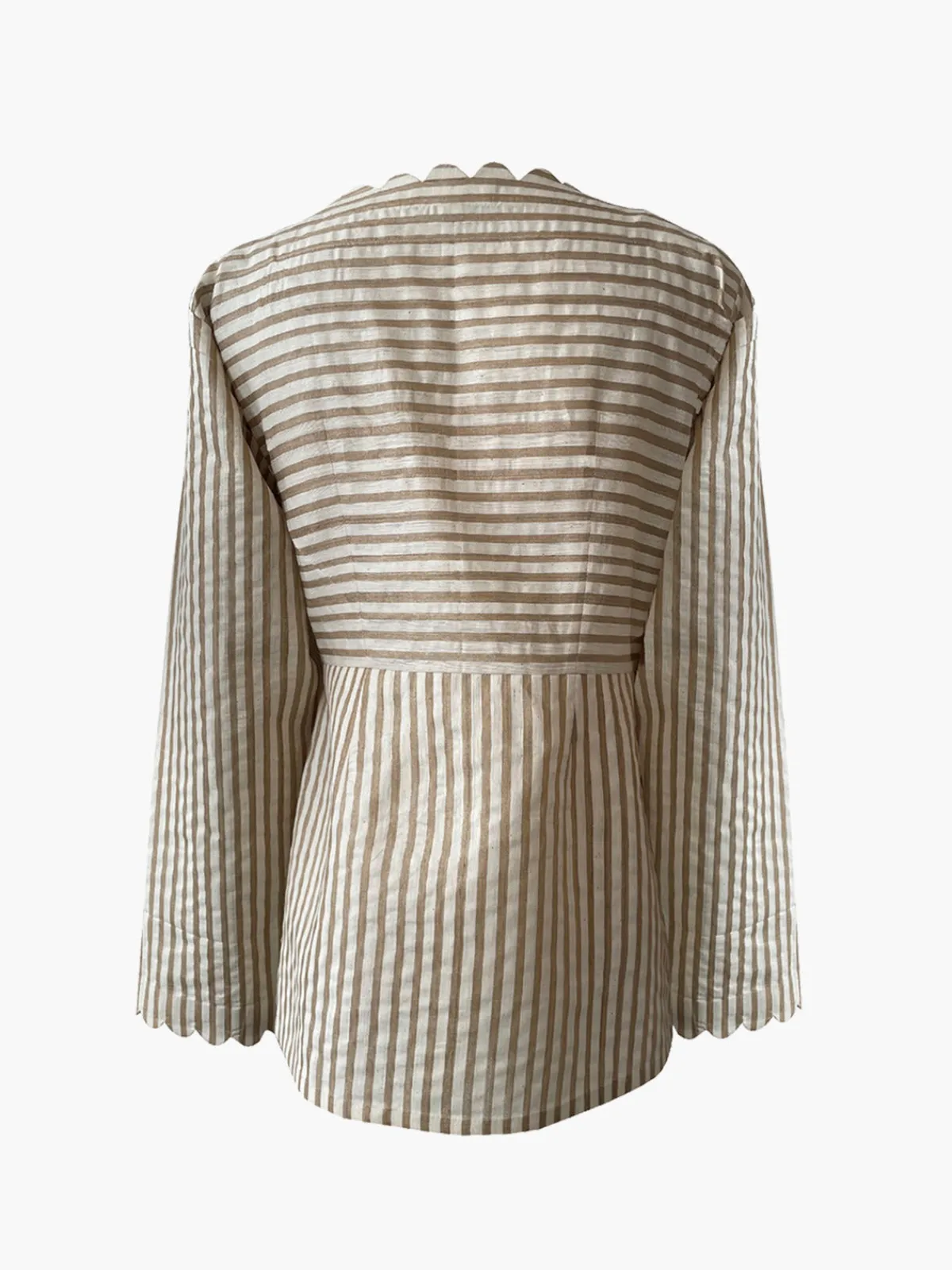 Our De Castro Caramel Top features a wrap silhouette with long sleeves, a V-neckline with scalloped trim, a slender tie that knots at the waist, and opposing horizontal and vertical stripes. Handcrafted by artisans in India.