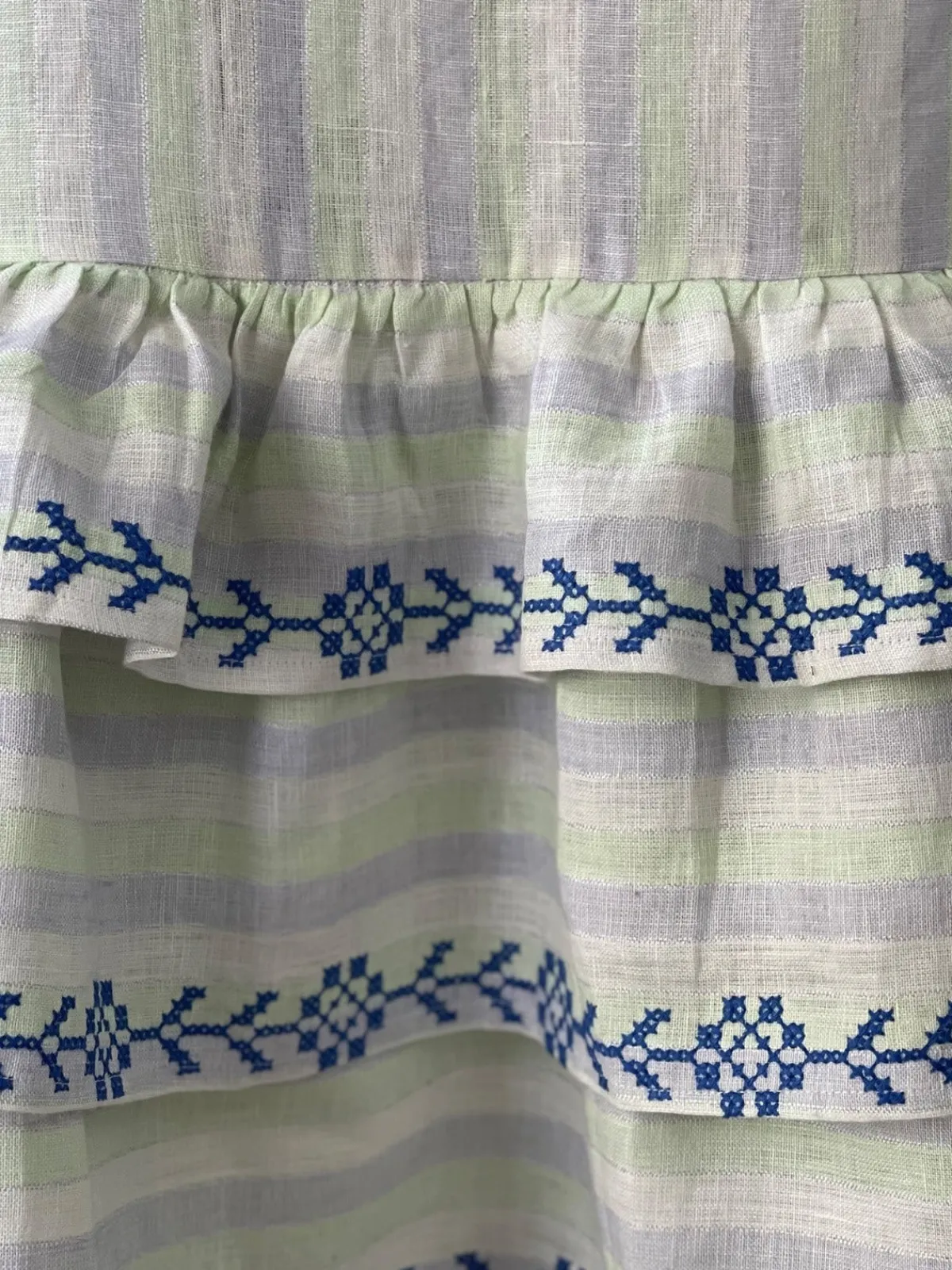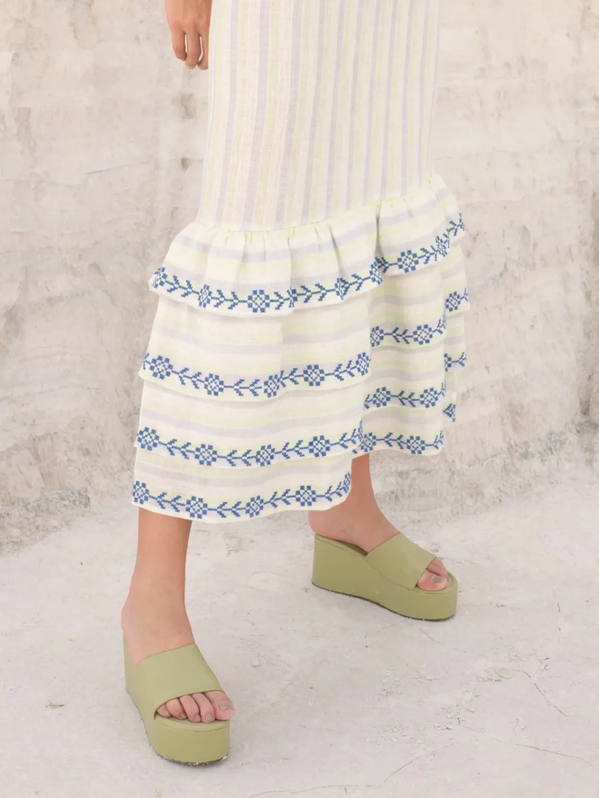 Our De Castro Chicory Skirt is a high waisted tube skirt with embroidered frills. Back zip closure.Handcrafted by artisans in India.