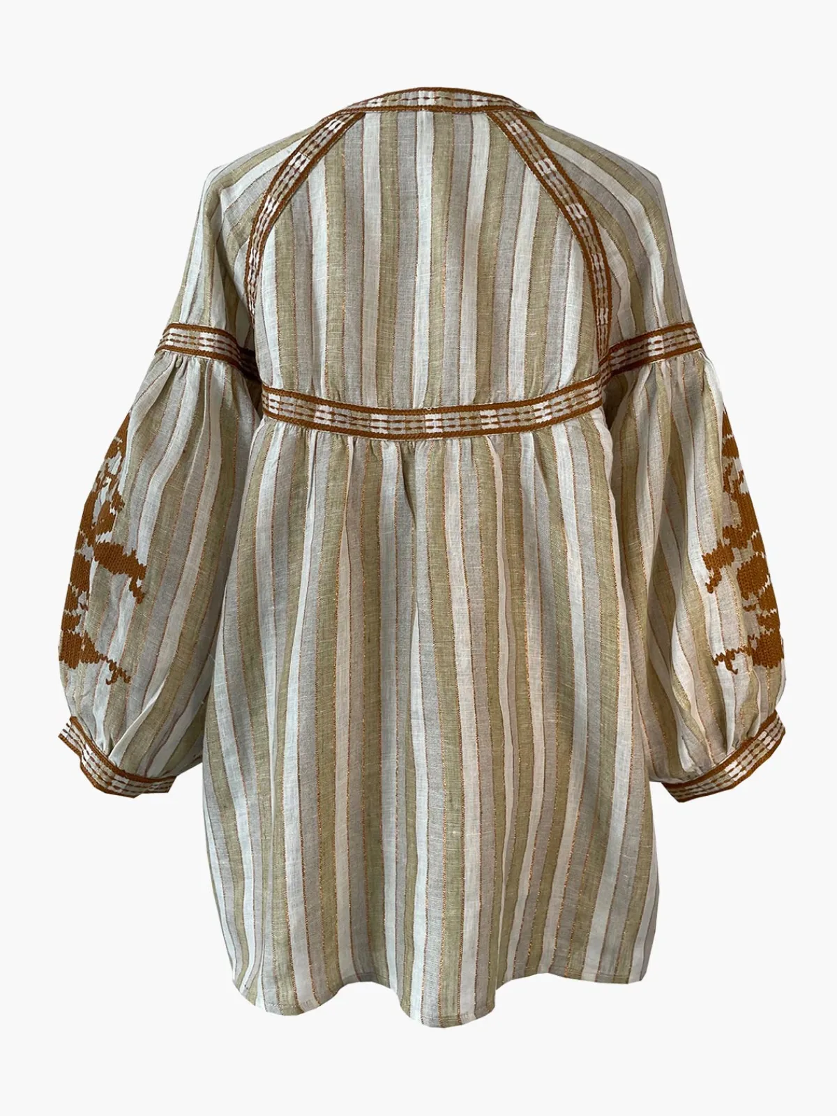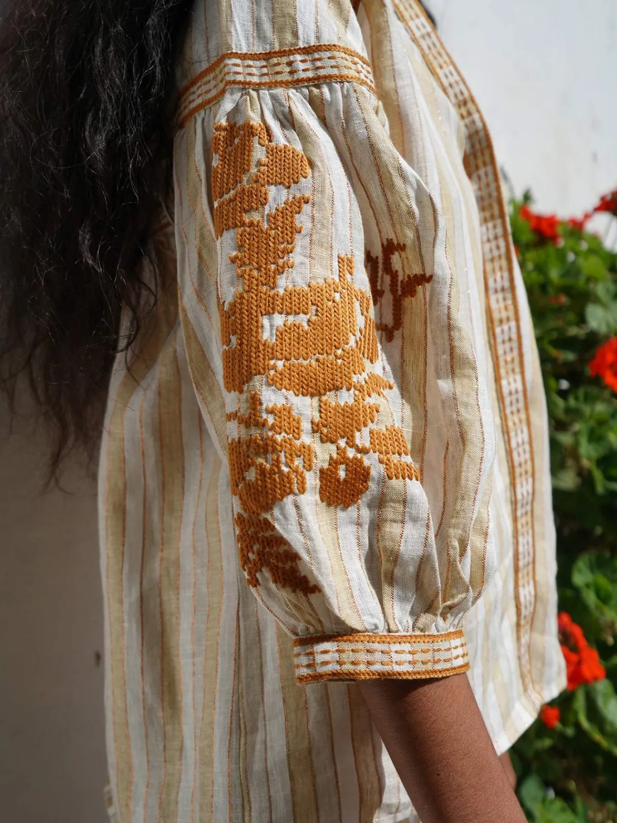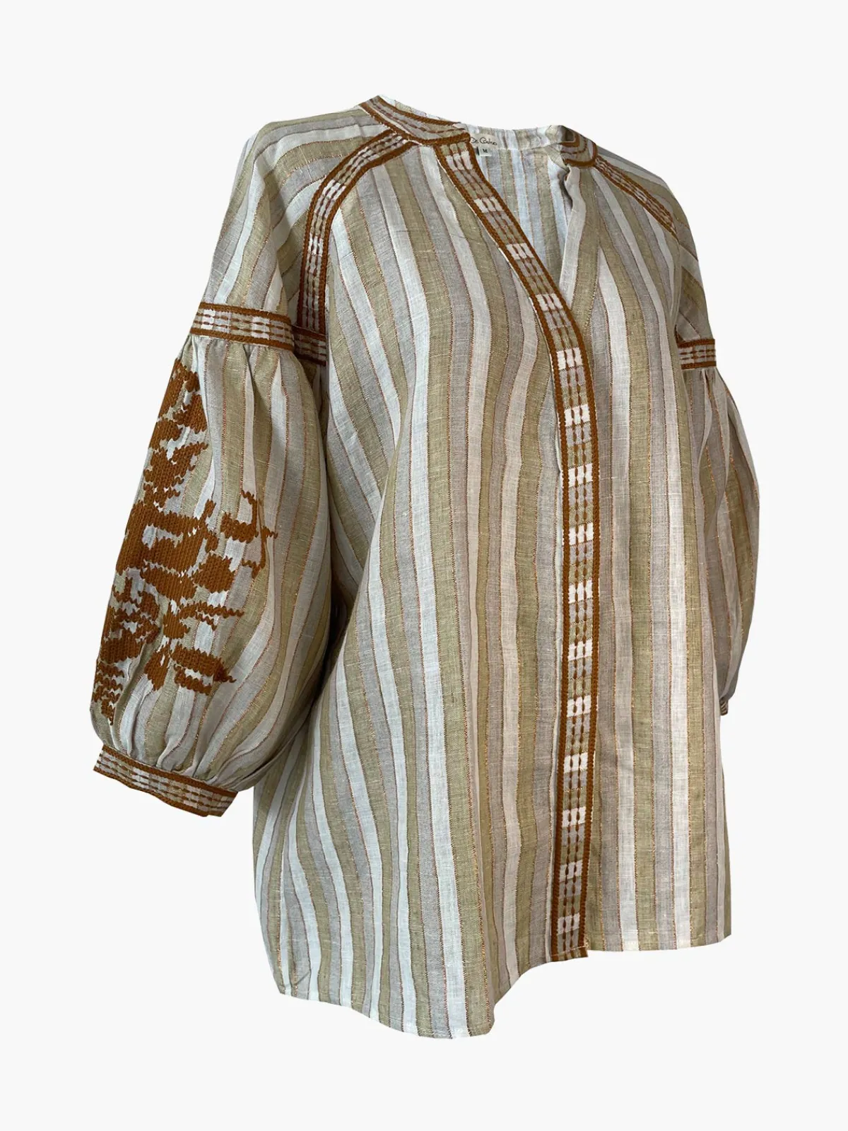 Our De CastroDorado Blouse is effortless in a relaxed silhouette with puffed sleeves, a V-neckline, a button front placket, and hand embroidered accents. Handcrafted by artisans in India.