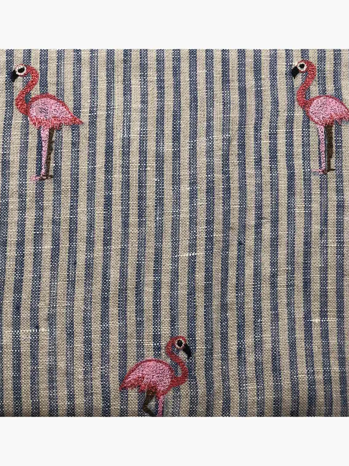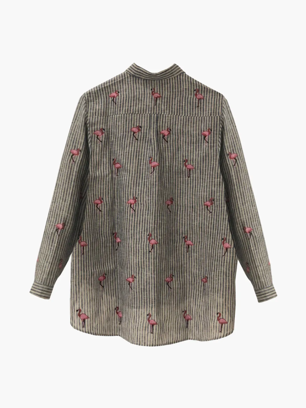 Our De Castro Flamingo Blouse features a long sleeve silhouette with a button closure, a collar, and embroidered flamingos. Handcrafted by artisans in India.