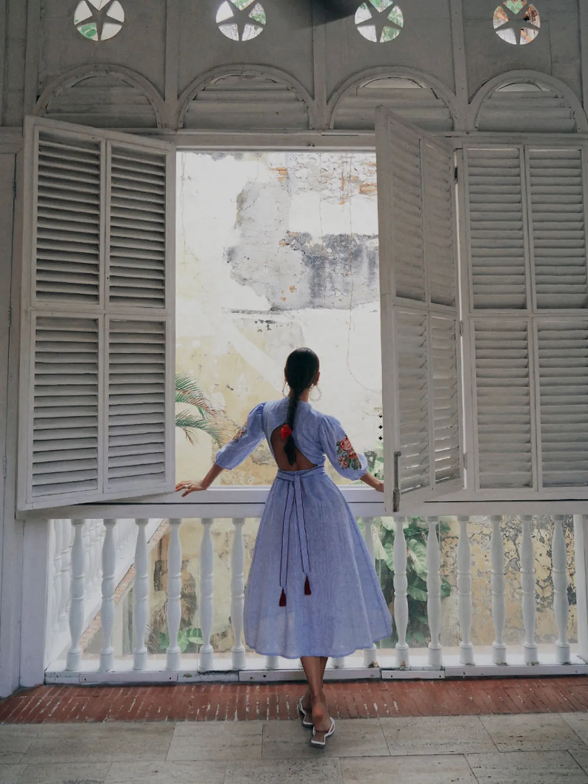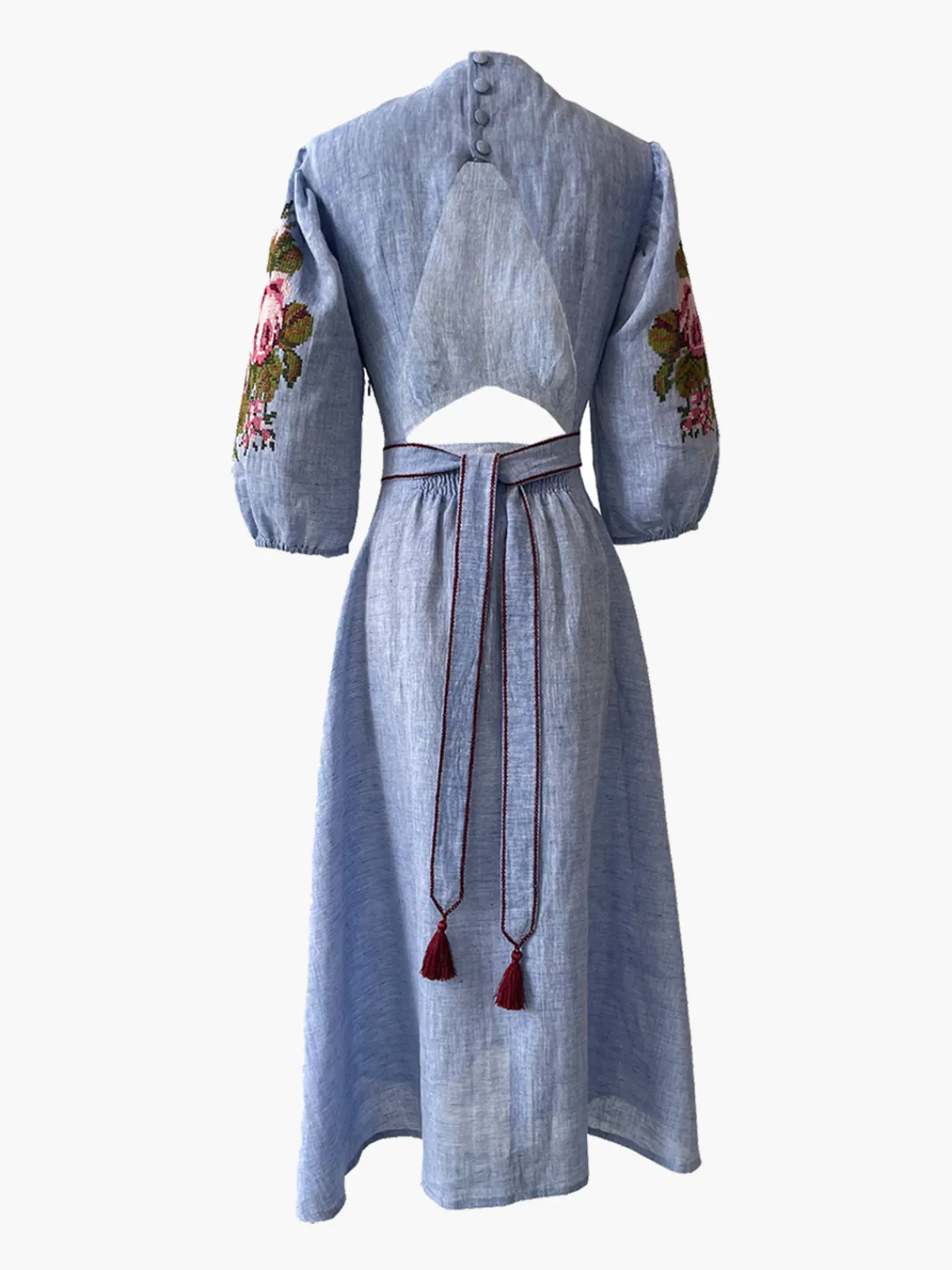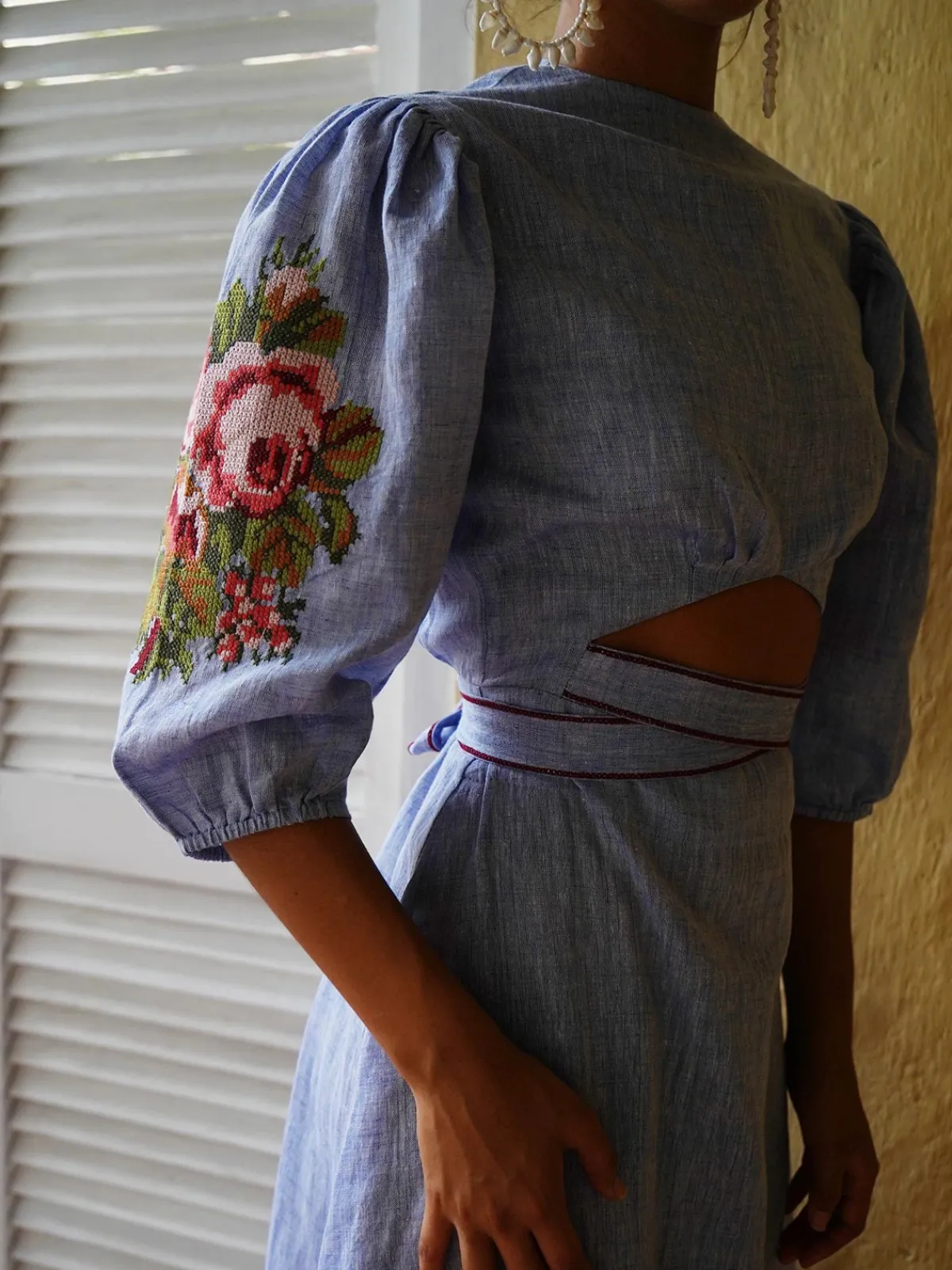 Our De Castro Forget Me Not Dress features an A-line silhouette in a maxi length with a round neckline, puffed sleeves with embroidery, and cut outs at the waist and back. It’s detailed with a hidden side zipper and a tassel belt that wraps at the waist. Handcrafted by artisans in India.