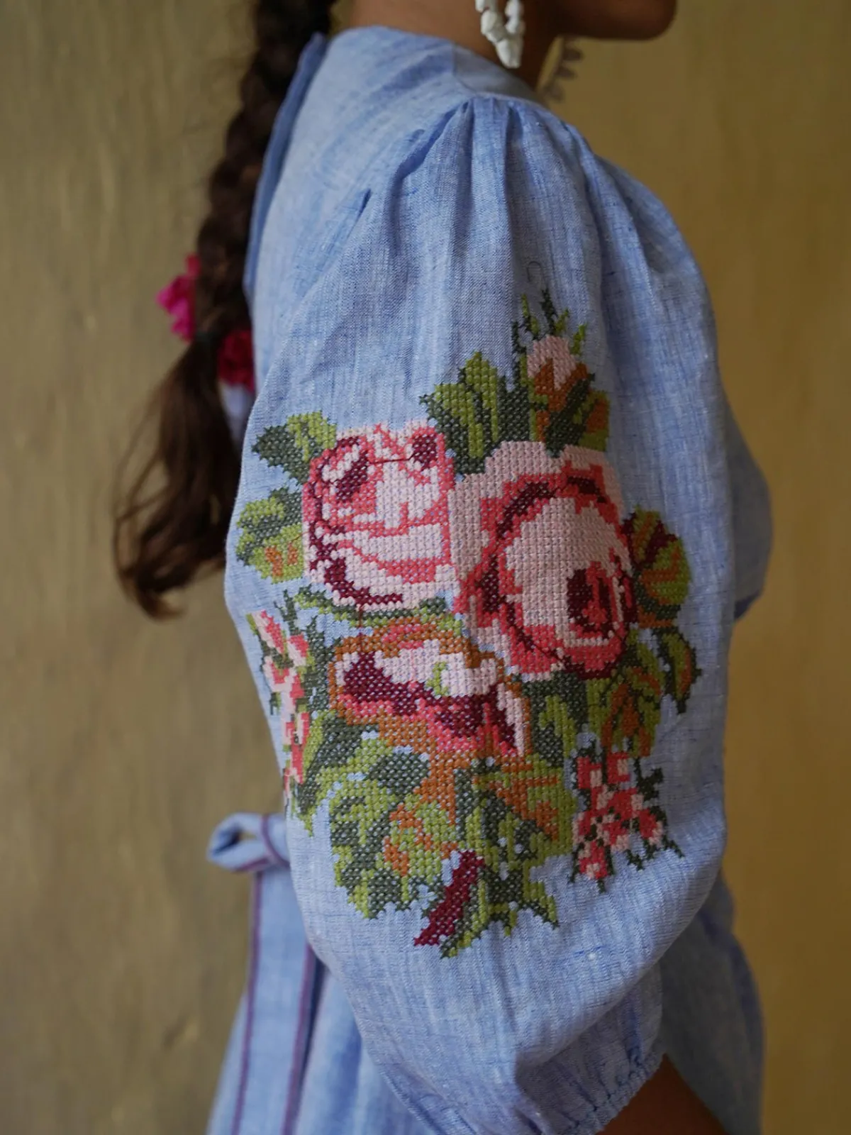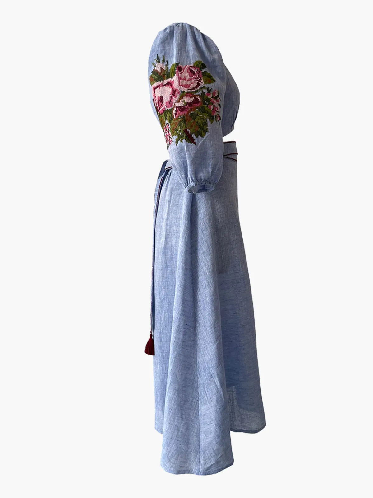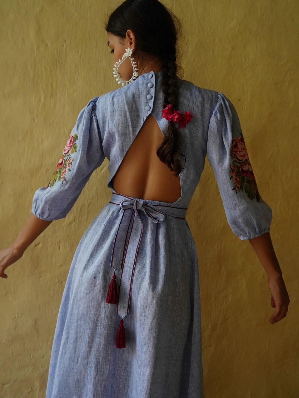 Our De Castro Forget Me Not Dress features an A-line silhouette in a maxi length with a round neckline, puffed sleeves with embroidery, and cut outs at the waist and back. It’s detailed with a hidden side zipper and a tassel belt that wraps at the waist. Handcrafted by artisans in India.