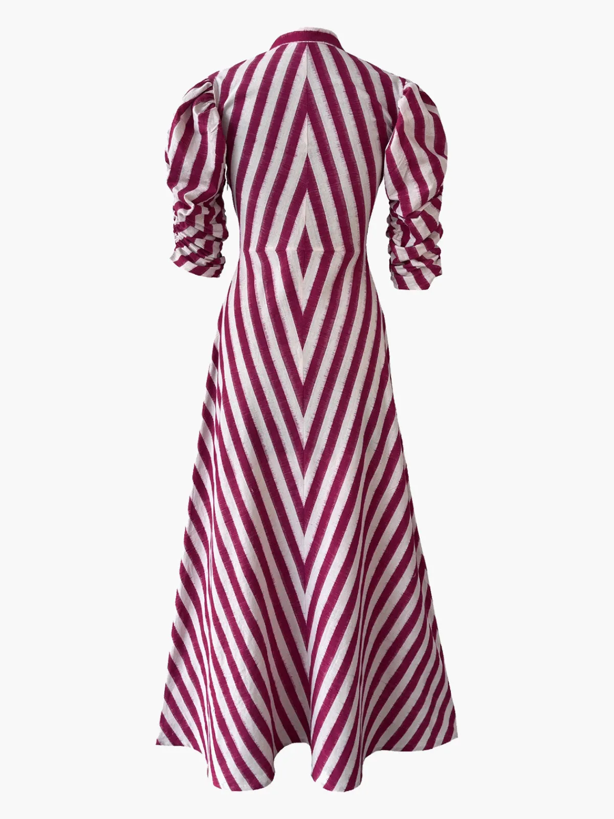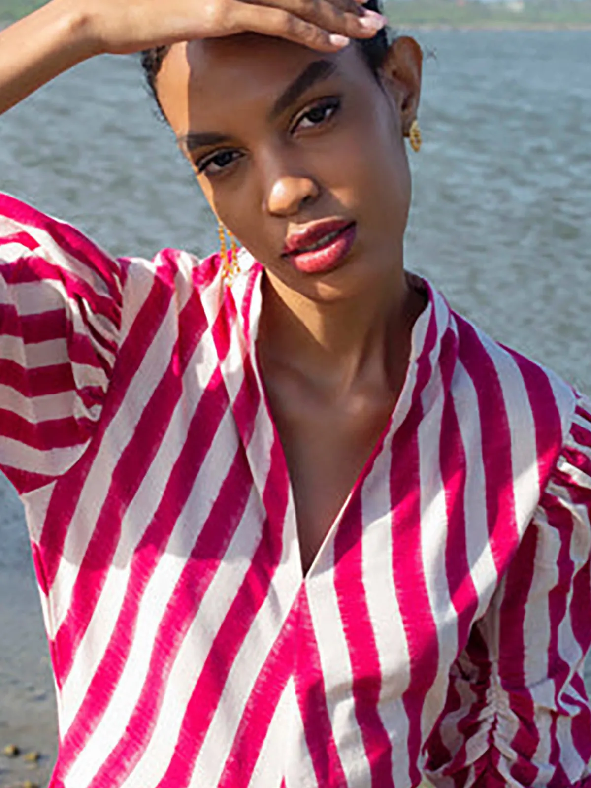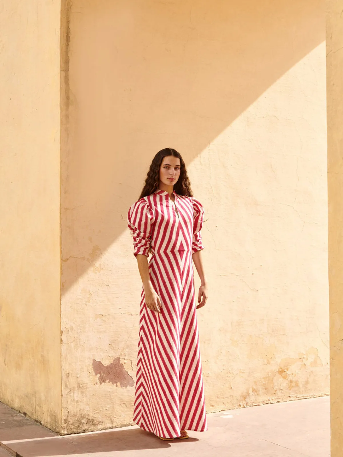 Our De Castro Illusion Dress in Rose features an A-line silhouette in a maxi length with ruched short sleeves and a high neckline. It secures with a zipper on the side. Handcrafted by artisans in India.