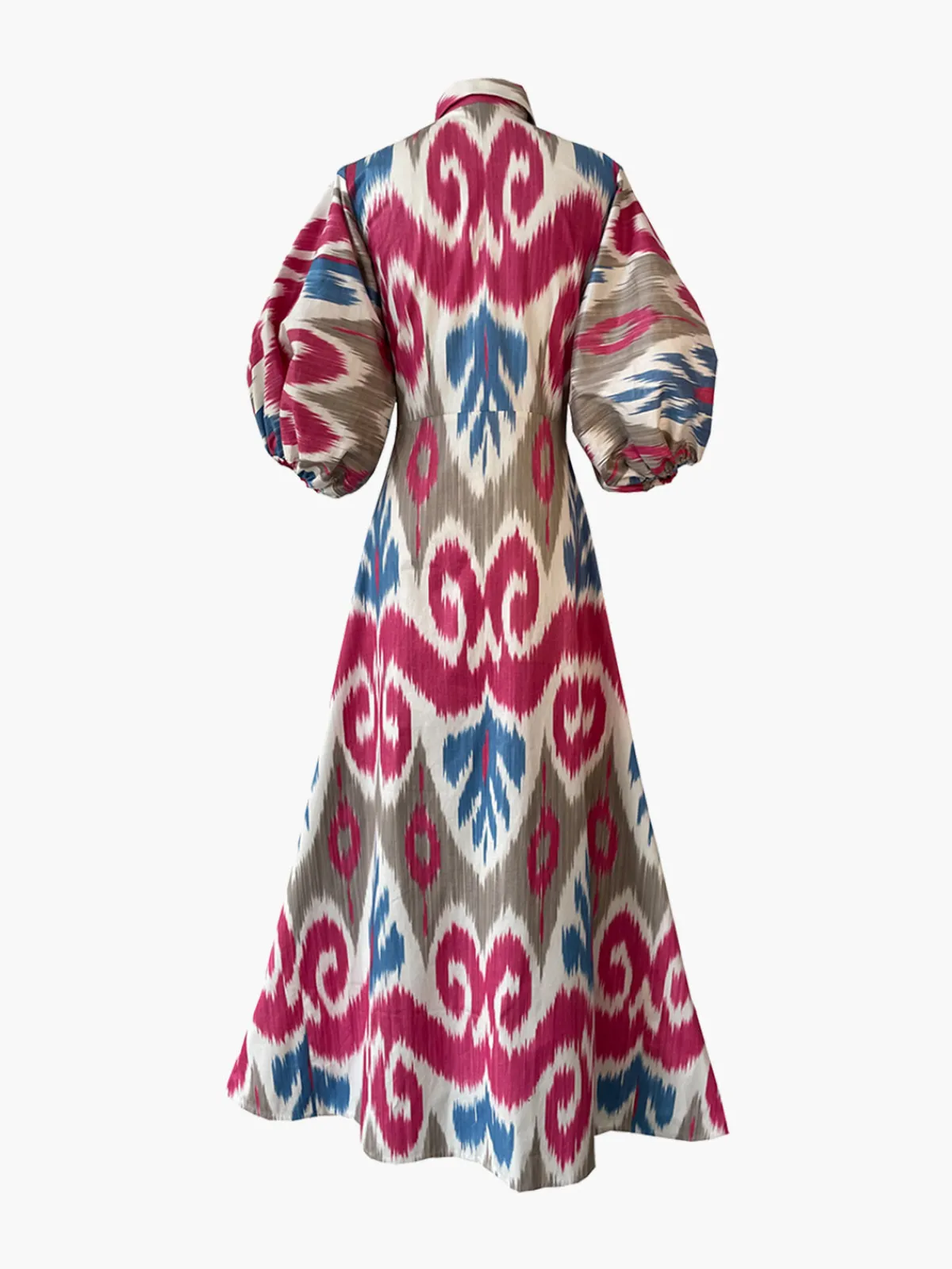 Our De Castro Jaisalmer Dress features an A-line silhouette with a striking allover print, long balloon sleeves, and a button front bodice with a high neckline and collar. Finished with a seam at the natural waist and a concealed zipper closure on the side. Handcrafted by artisans in India.