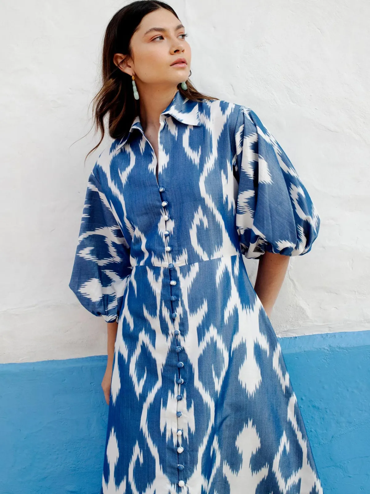 Our De Castro Jodhpur Dress boasts a maxi length silhouette with a bold allover print, long balloon sleeves, a high neckline with a collar, and covered buttons down the front. It’s finished with a concealed zipper closure down the side. Handcrafted by artisans in India.