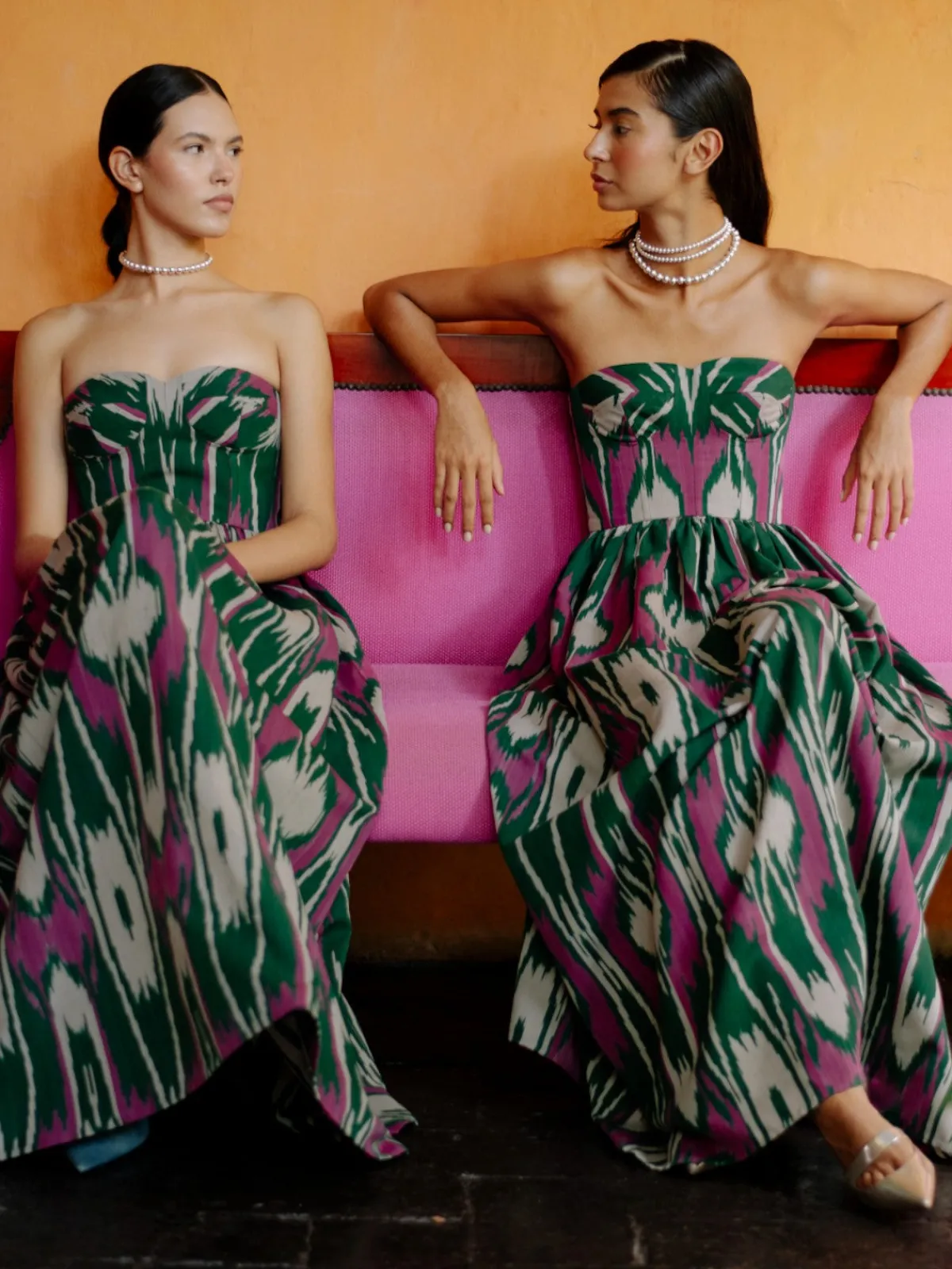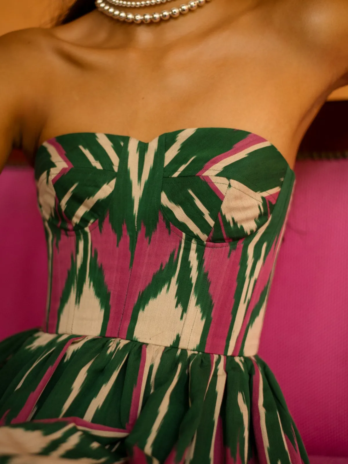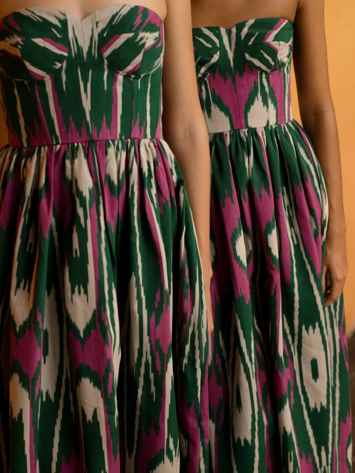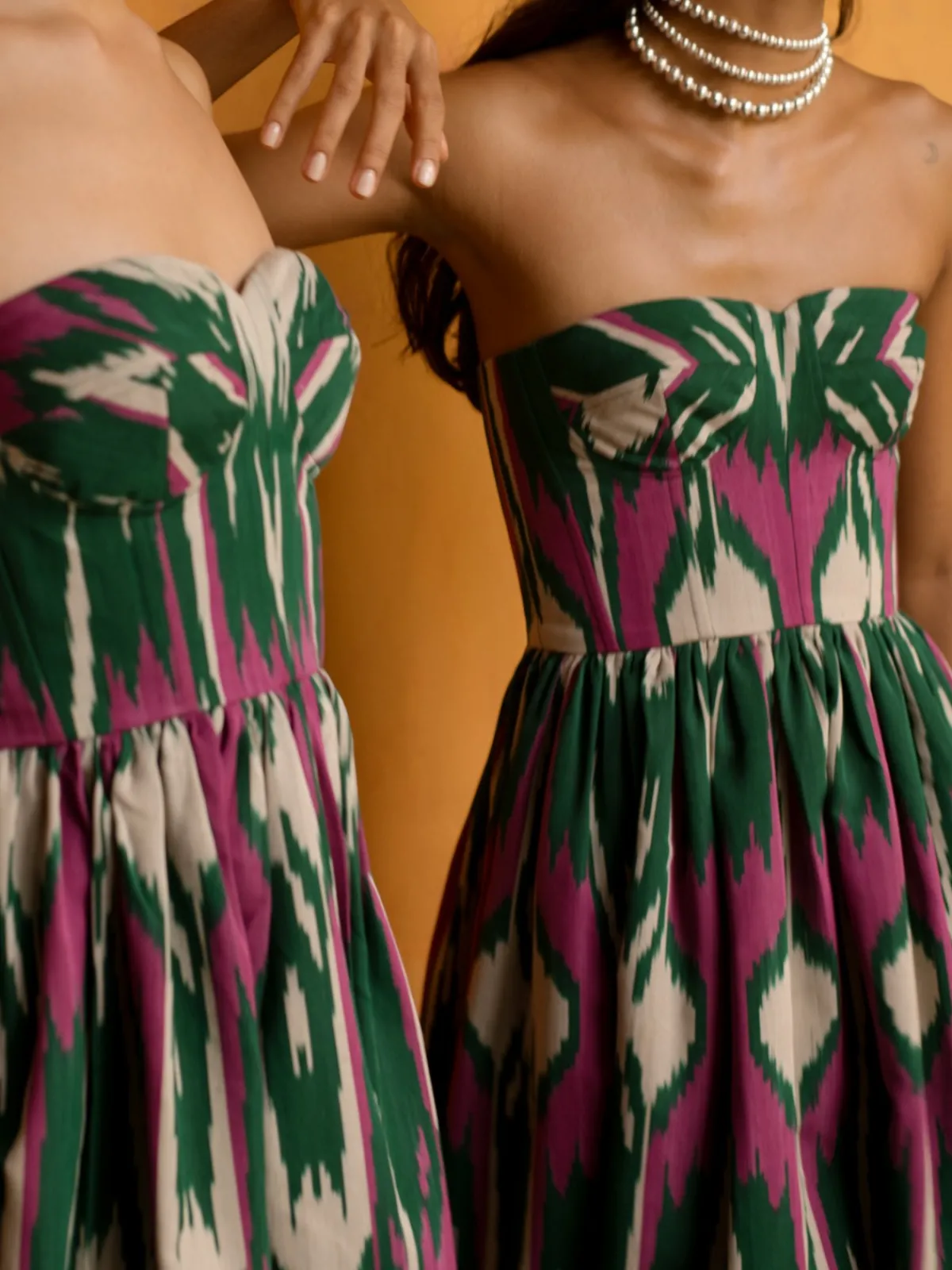 Our De Castro Jungle Dress in Orchid is an elegant maxi dress in a bold Ikat print that features a corset bodice with a sweetheart neckline. Hand-loomed and handcrafted by artisans in India.