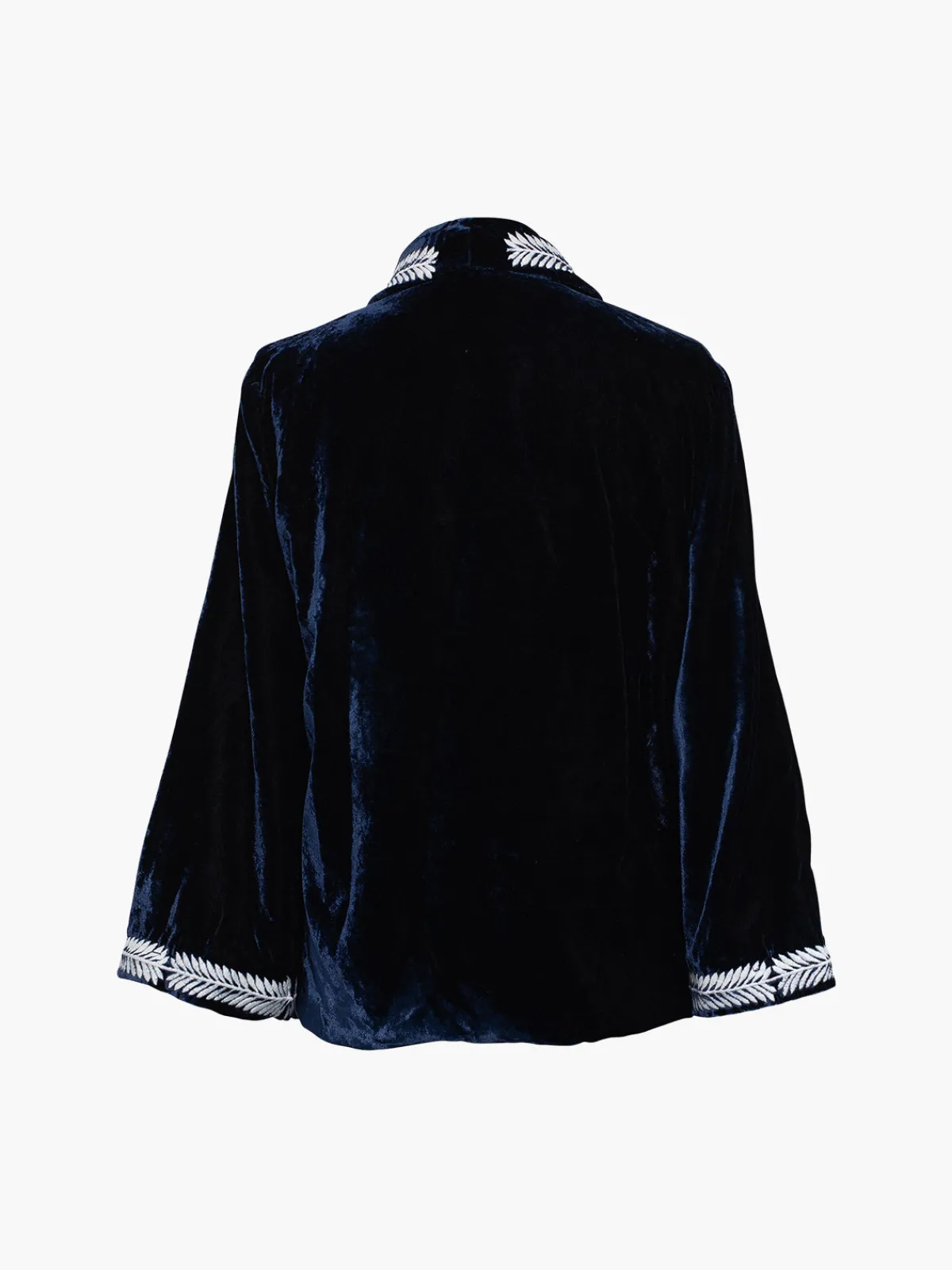 Our De Castro Kimono Jacket in Navy features a relaxed silhouette with long, wide sleeves, an open front, and embroidered details. Handcrafted by artisans in India.