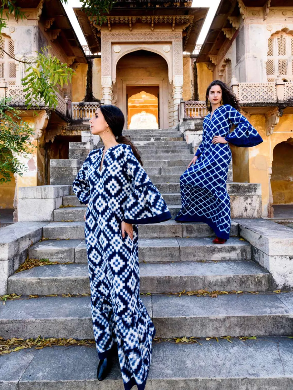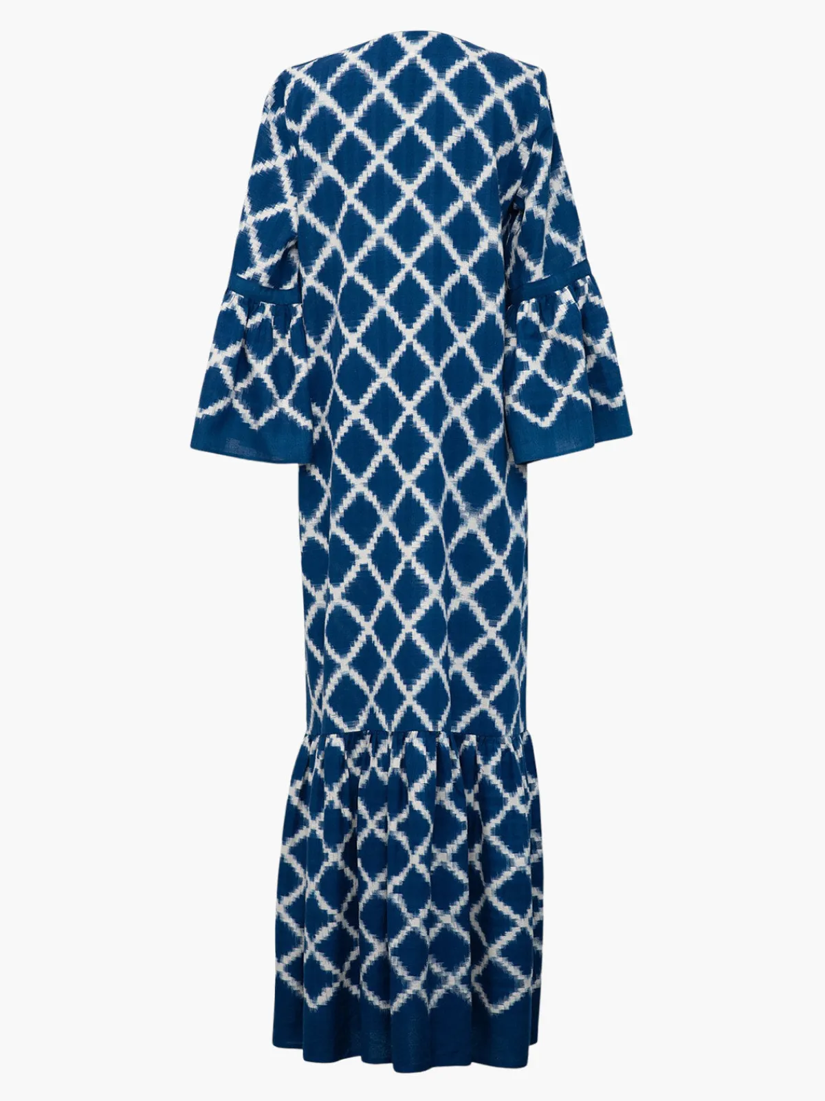 Our De Castro Long Viento Dress in Santorini features long sleeves with flared cuffs, a V-neckline, a bold allover print, and a ruffle at the hem. Handcrafted by artisans in India.
