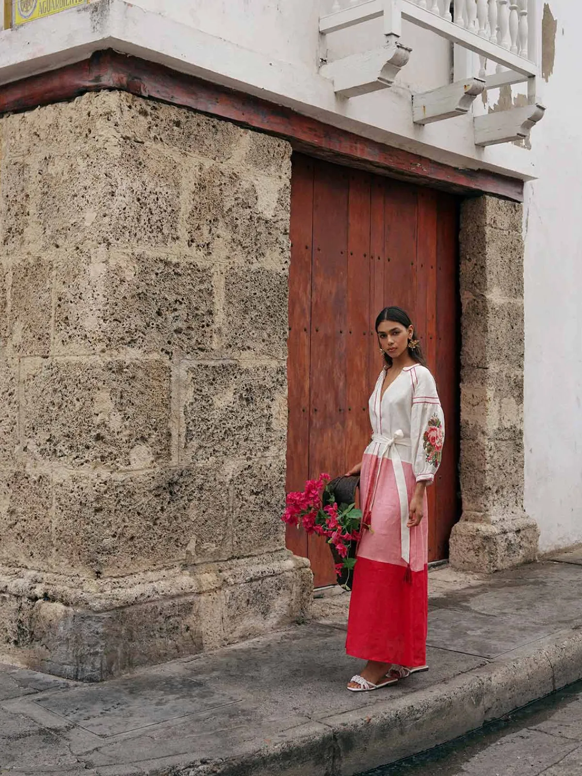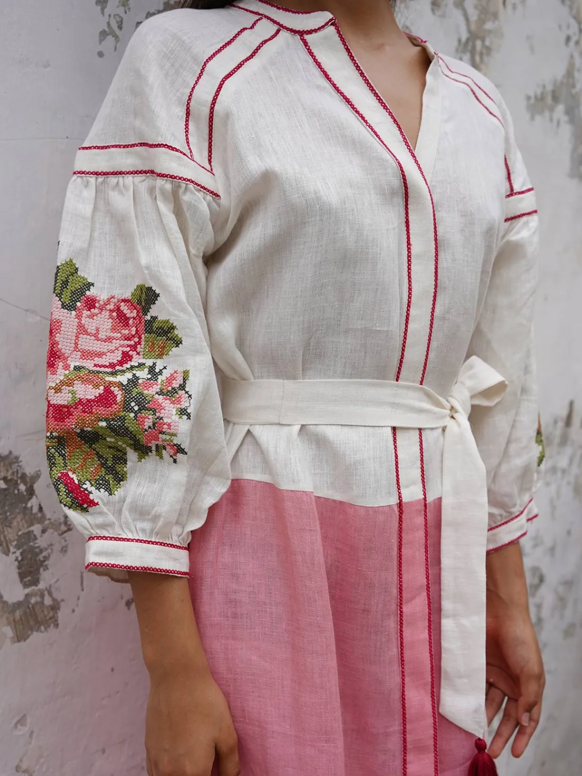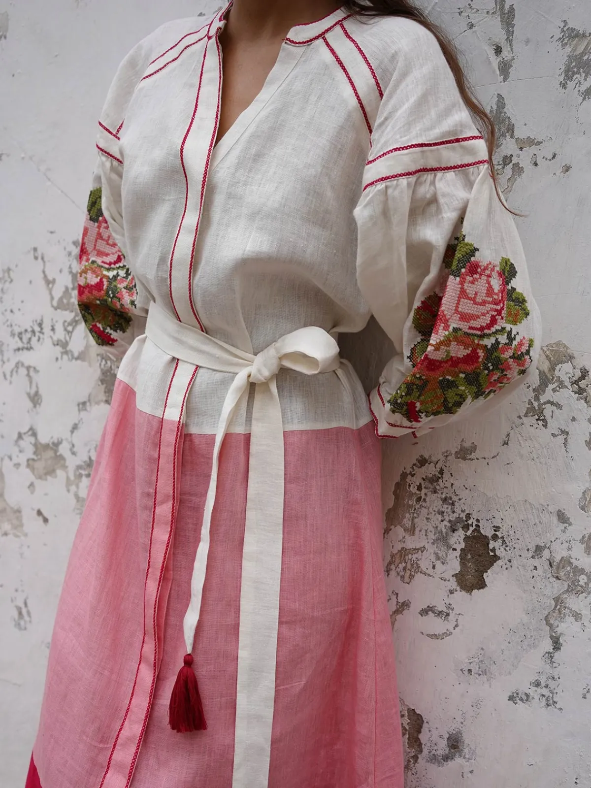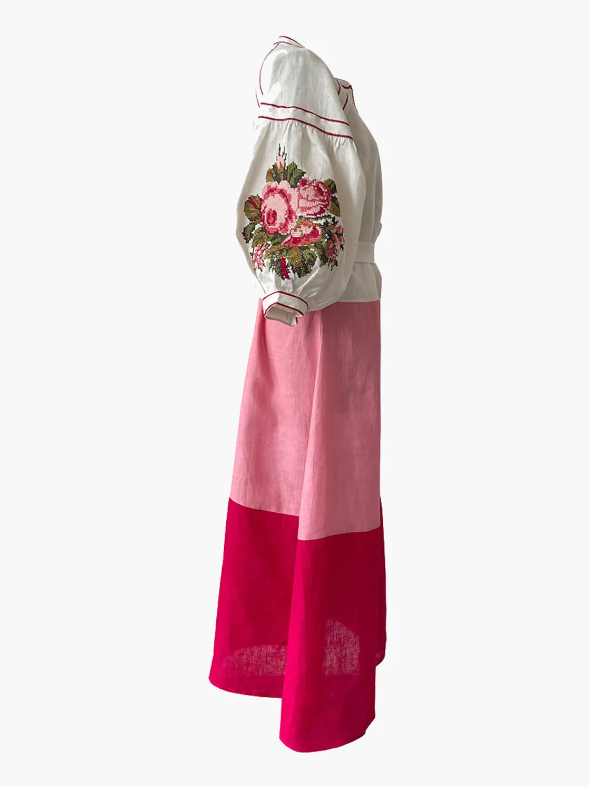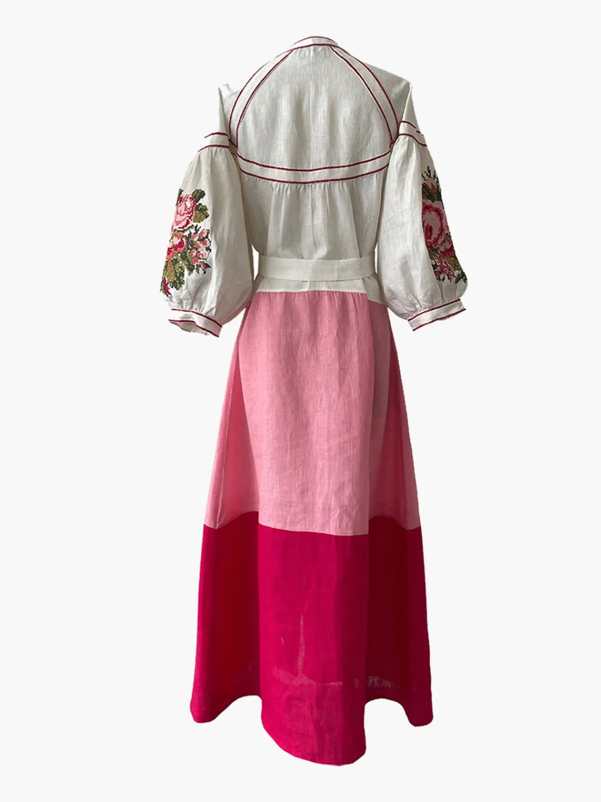 Our De Castro Lotus Dress boasts a colorblocked A-line silhouette in a maxi length with a V-neckline and puffed sleeves with embroidery. It’s finished with a button front placket and a tassel belt that ties at the waist. Handcrafted by artisans in India.