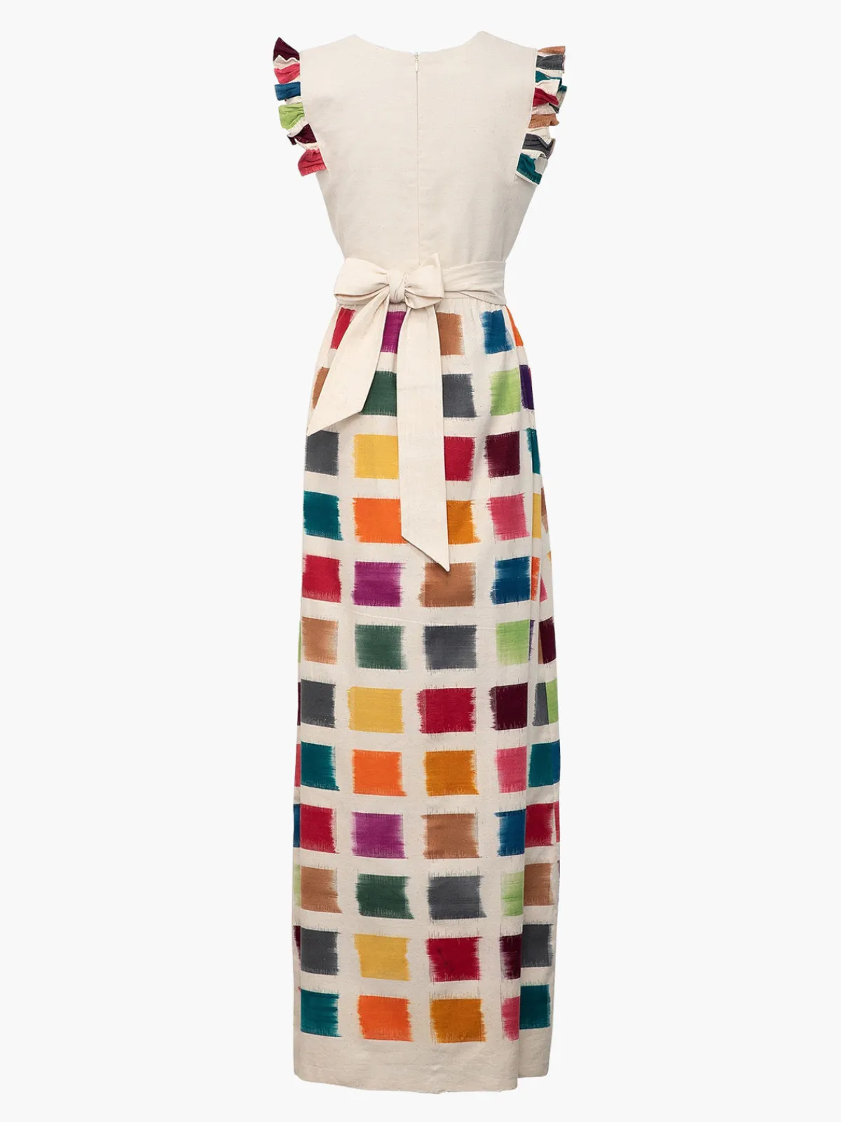 Our De Castro Multi Campesina Dress features a full length silhouette with a sleeveless bodice with ruffle trim, a deep V-neckline, and a flattering A-line skirt. It’s finished with a center back zipper and a sash that ties into a bow at the back of the waist. Handcrafted by artisans in India.