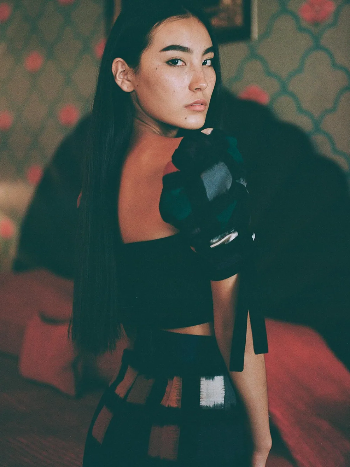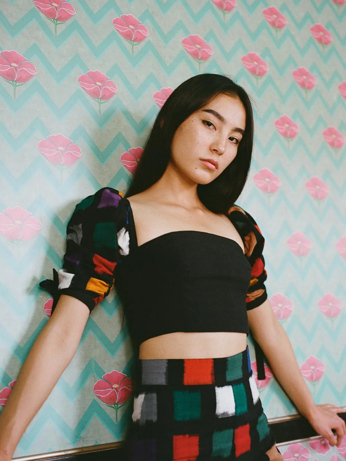 Our De Castro Parampara Set in Black boasts a bold geometric pattern in a wide leg silhouette with a high waist and a solid crop top with ruched geometric sleeves. It’s finished with hook closures and a back zipper. Handcrafted by artisans in India.