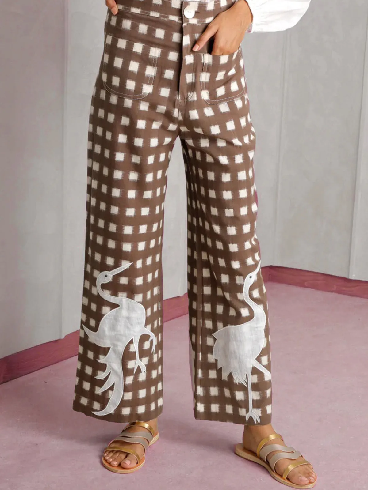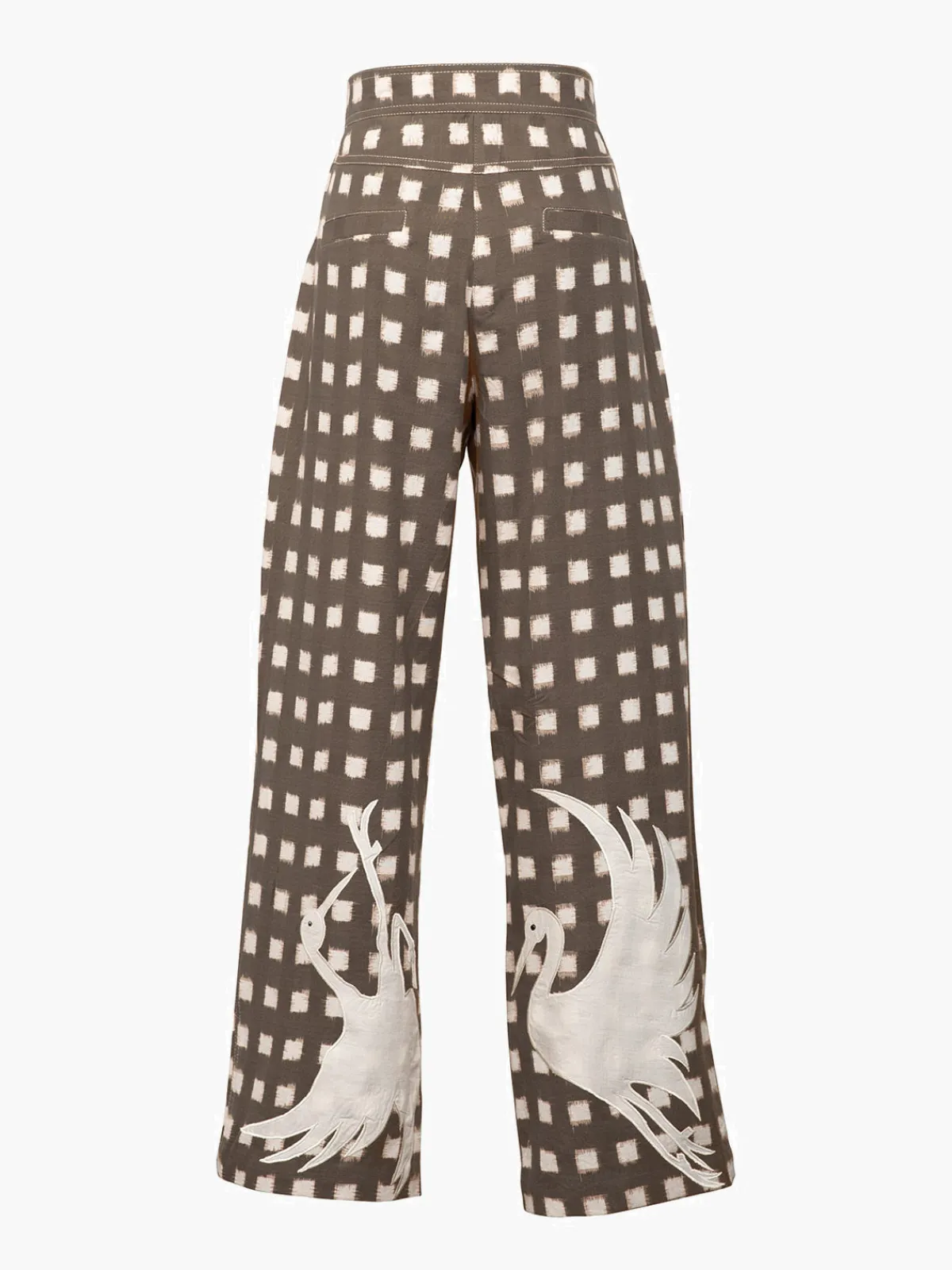 These high waisted trousers are made from handloom Ikat. They feature a square pattern in cream and patch embroidery. The silhouette is slightlyA with frontal pockets.