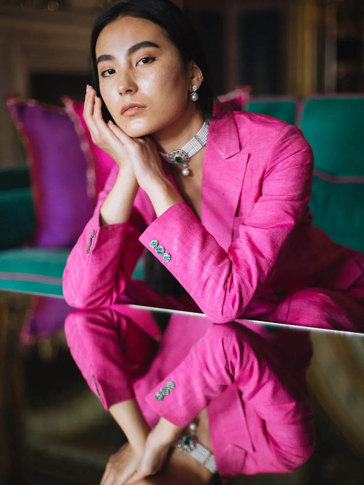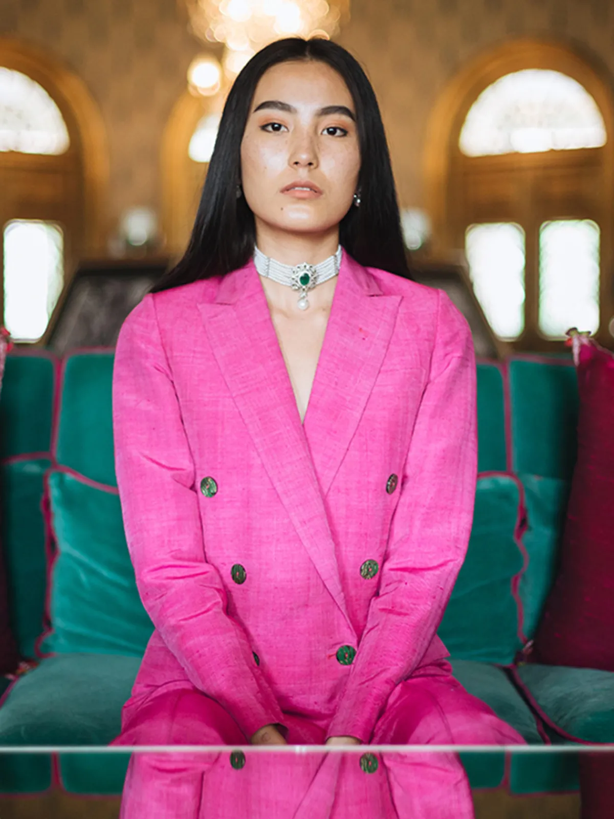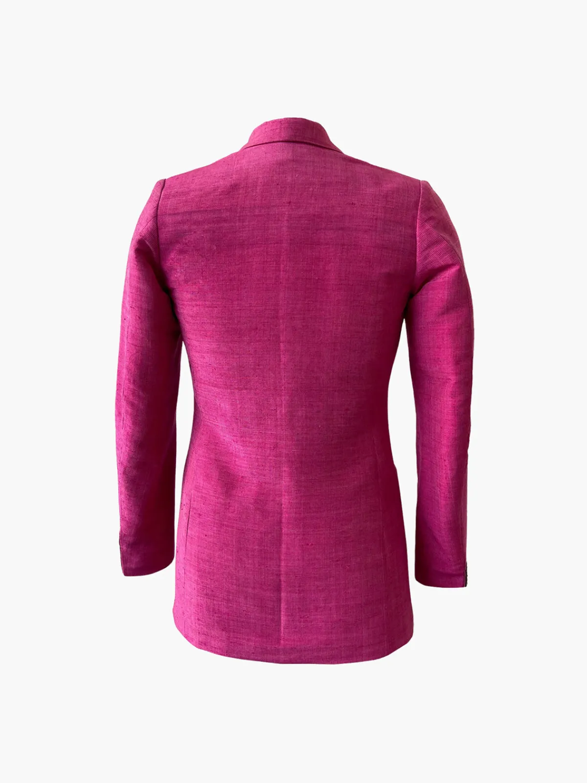 Our De Castro Pink Suit Jacket features a double breasted blazer silhouette with long sleeves, welt pockets, notched lapels, and handmade buttons. Handcrafted by artisans in India.