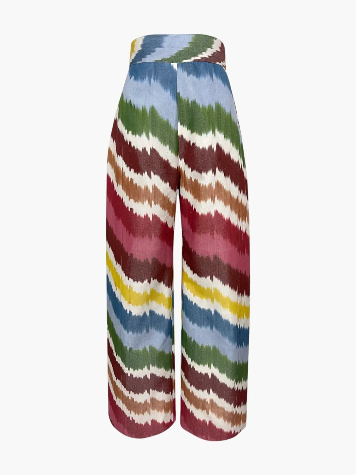 Our De Castro Rainbow Trousers are high-waisted pants made from handwoven silk Ikat fabric crafted by artisans in southern India. Featuring a slightly A-line silhouette, they are the perfect blend of comfort and style. Finished with an invisible zipper at back. Handcrafted by artisans in India.