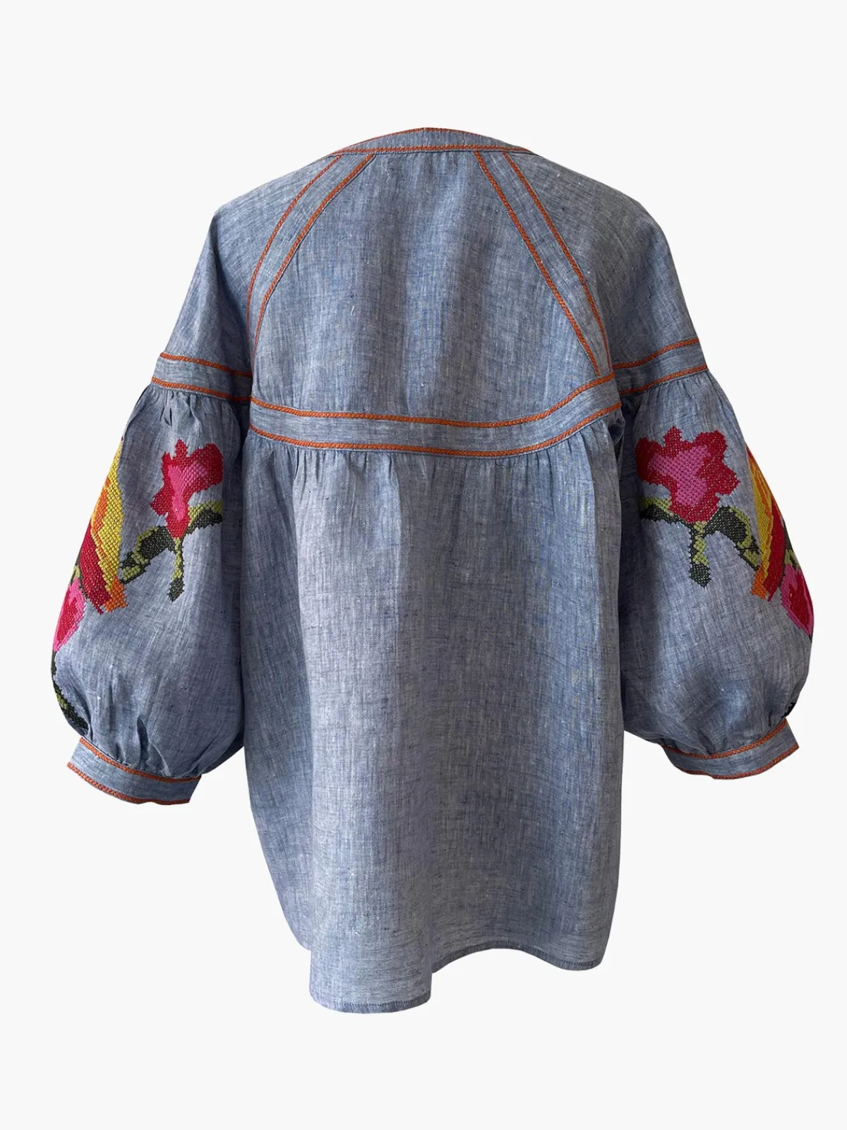 Our De Castro Rufous Blouse in Blue features a relaxed fit with puffed sleeves, embroidered details, a concealed button front placket, and a V-neckline. Handcrafted by artisans in India.