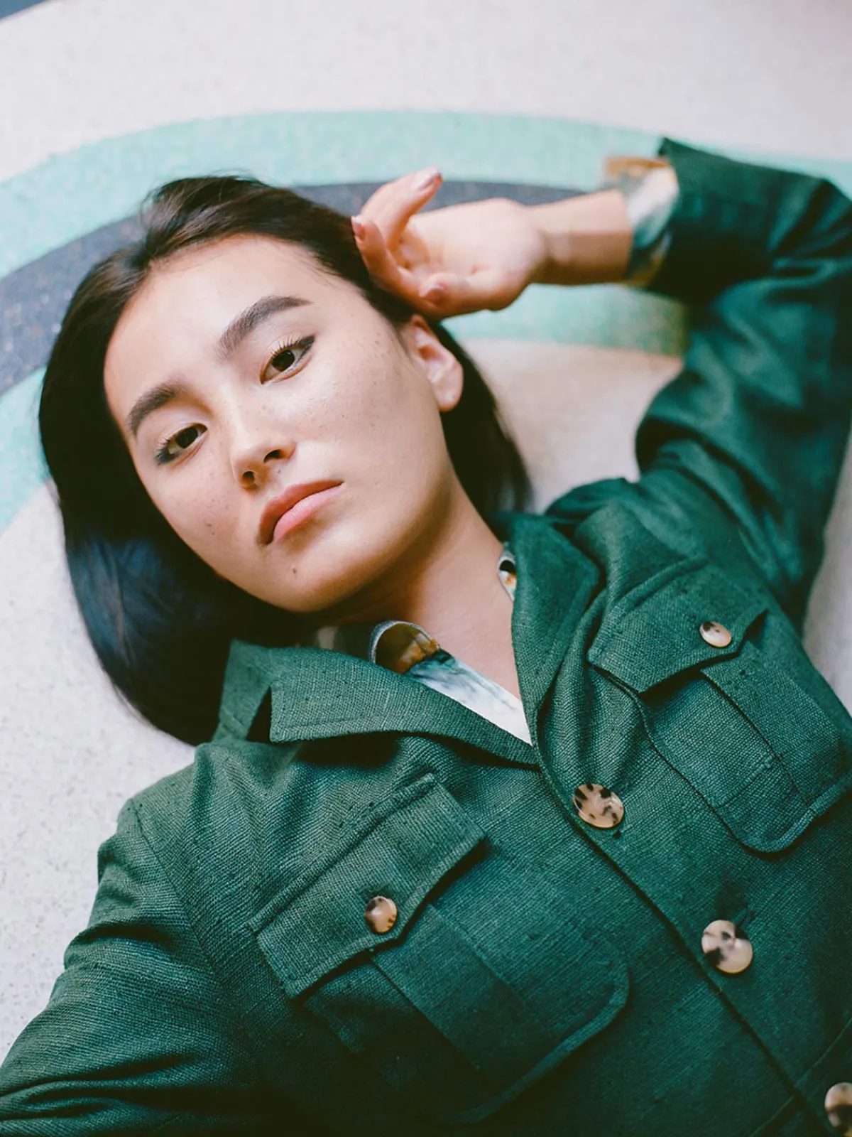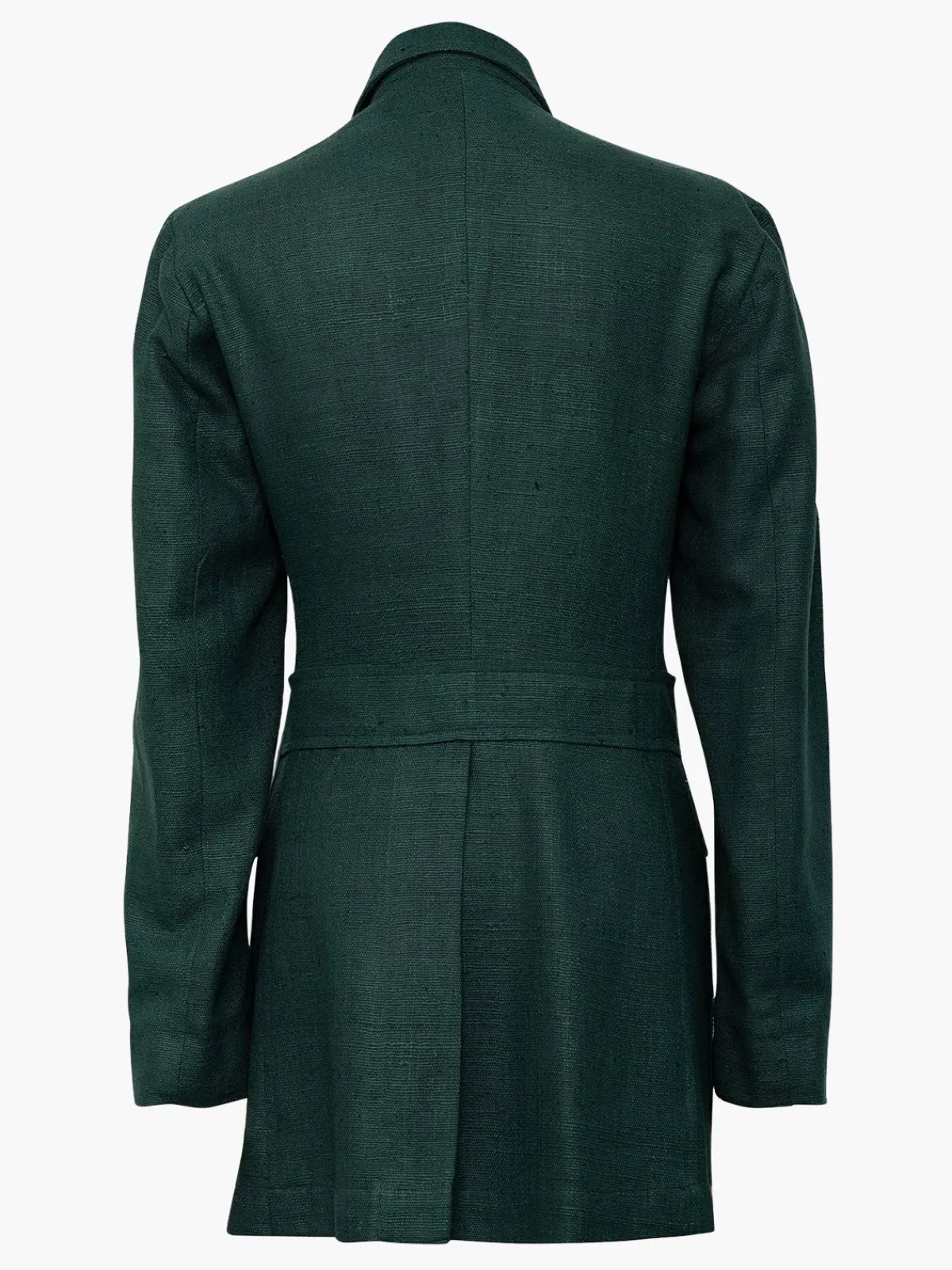 Our De Castro Safari Jacket in Green features a slender silhouette with long sleeves, notched lapels, and handmade horn button closures. It’s detailed with flap pockets and a center back split. Handcrafted by artisans in India.