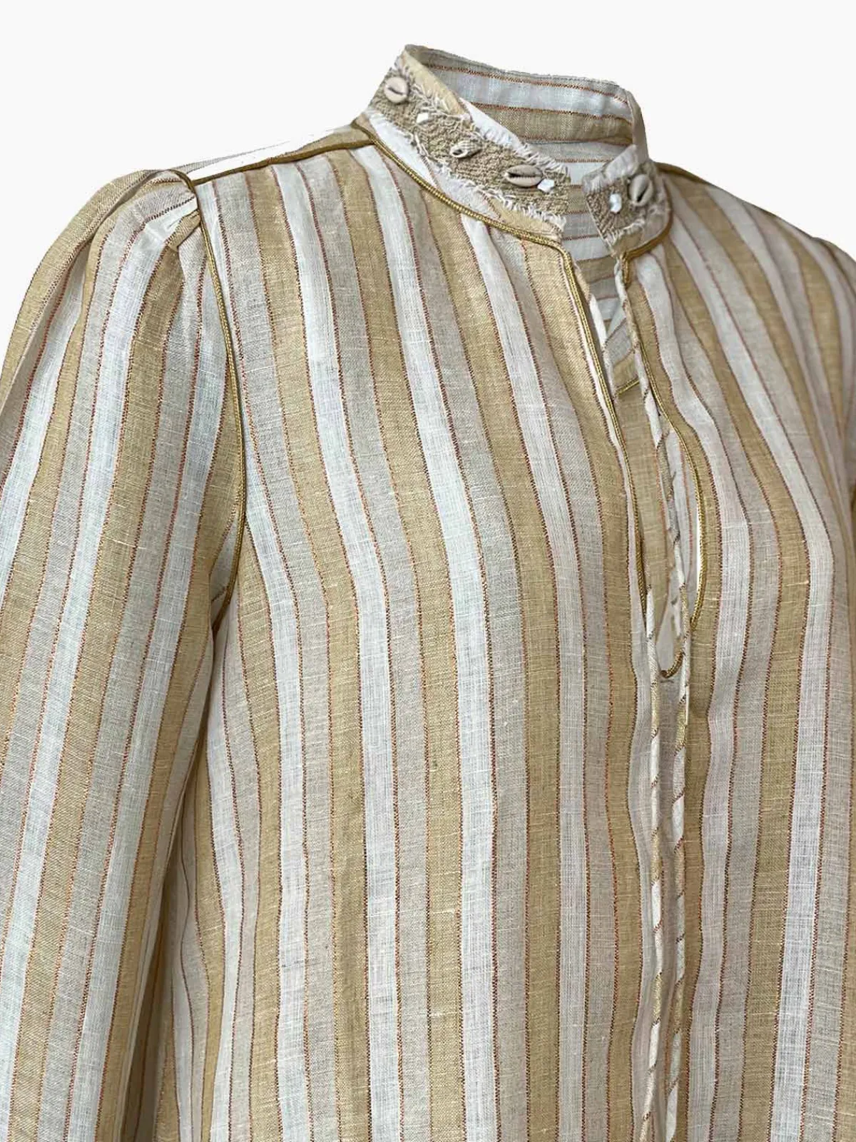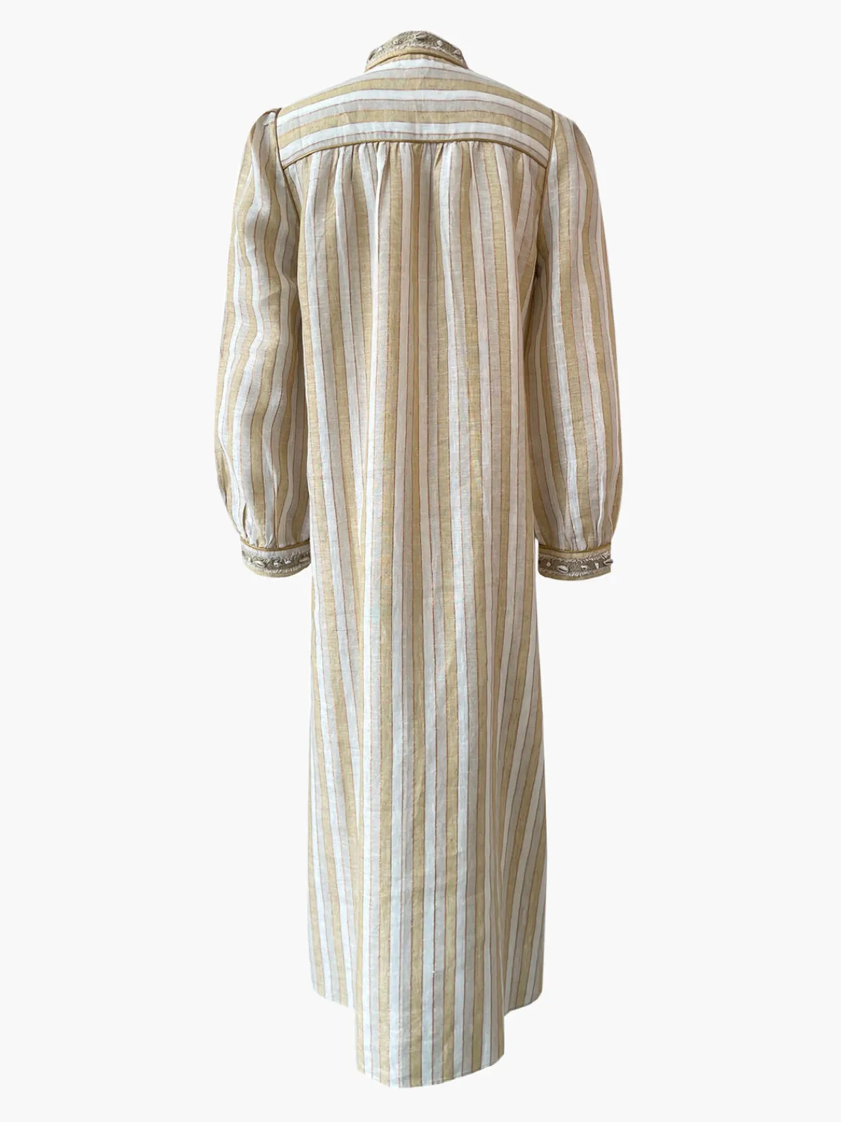 Our De Castro Shell Dress boasts a relaxed fit in a vertical stripe pattern with long sleeves, shells on the collar, a slit neck with tassel strings, and side slits. Handcrafted by artisans in India.