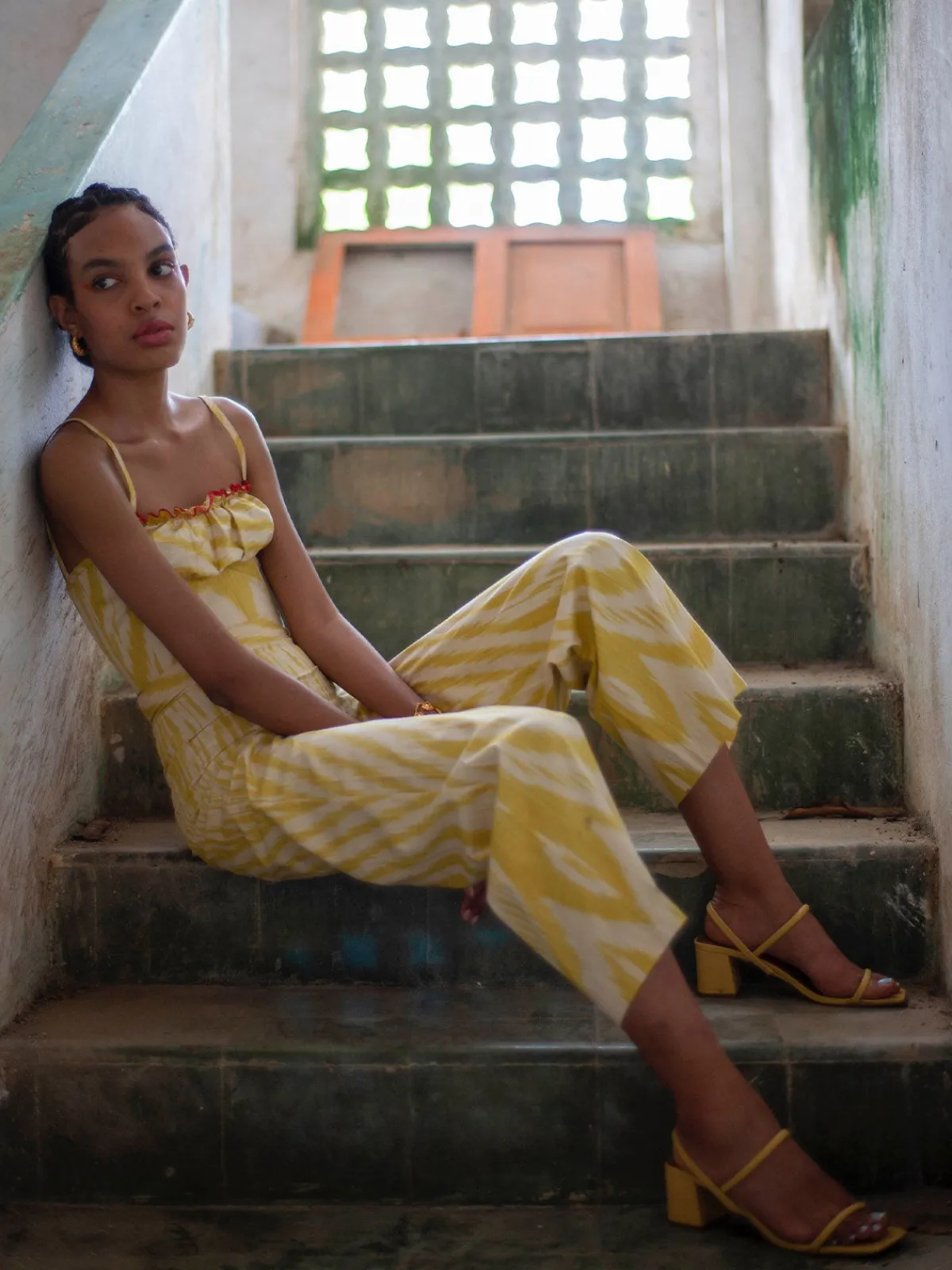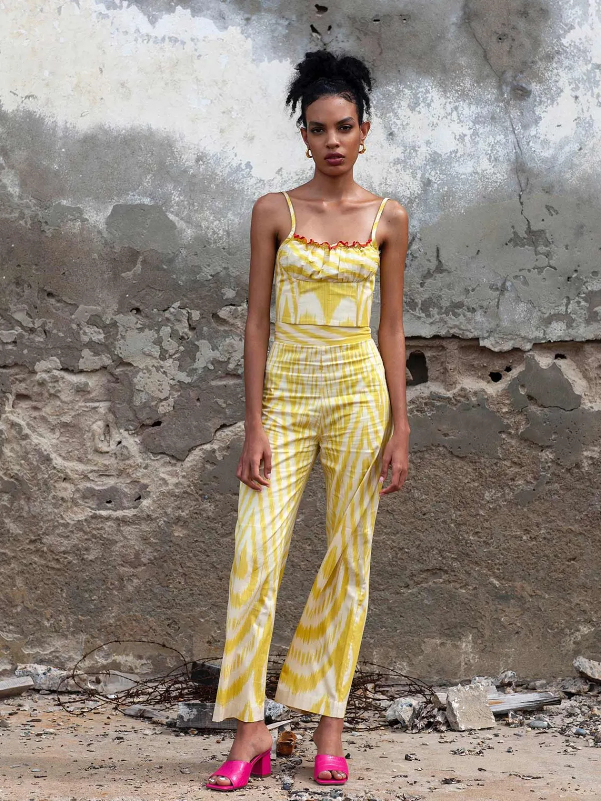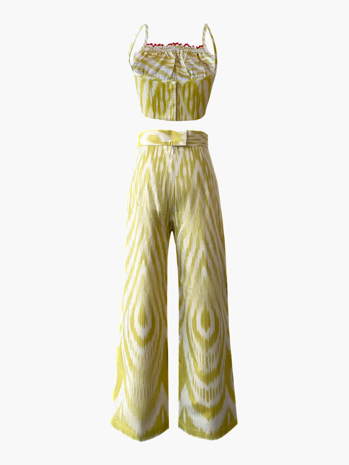 Our De Castro Sol Set flatters in a two-piece silhouette with a cropped corset top with spaghetti straps and high waisted wide leg pants. Finished with a back zipper closure. Handcrafted by artisans in India.