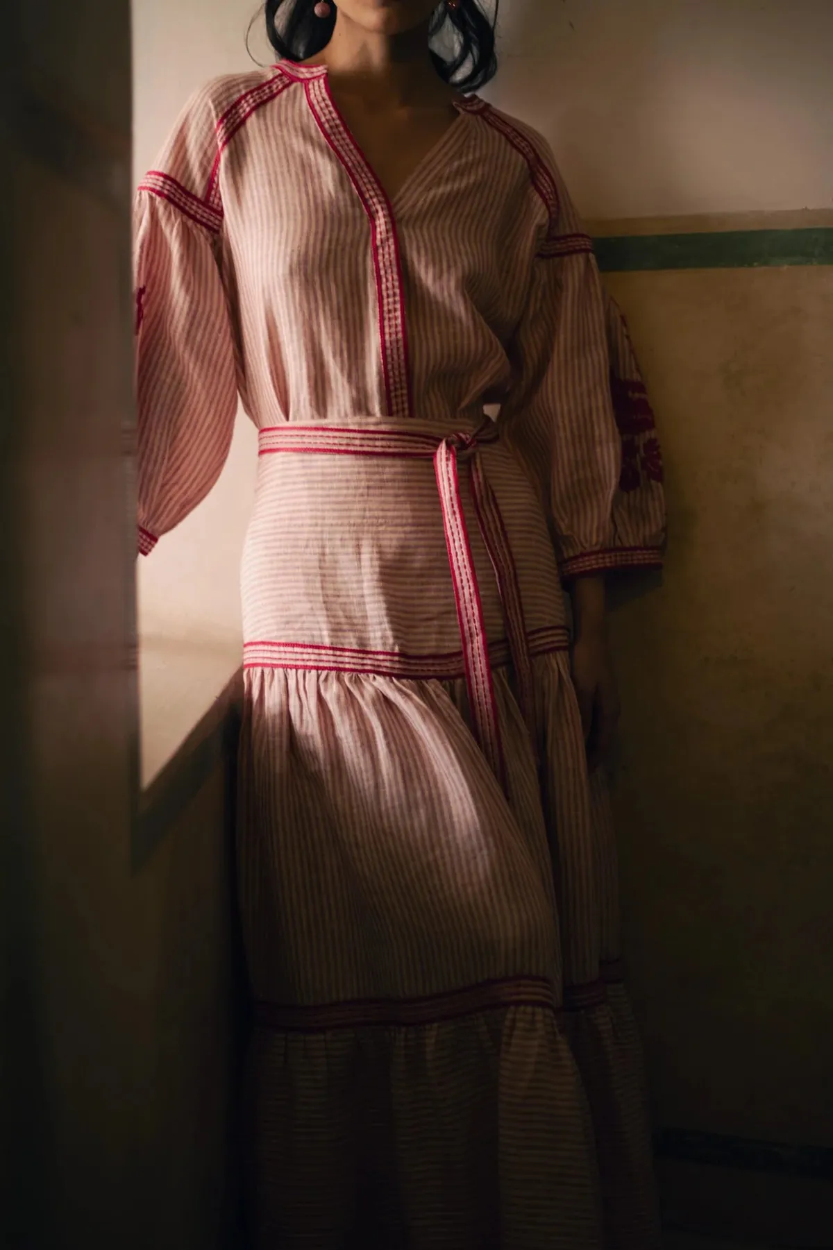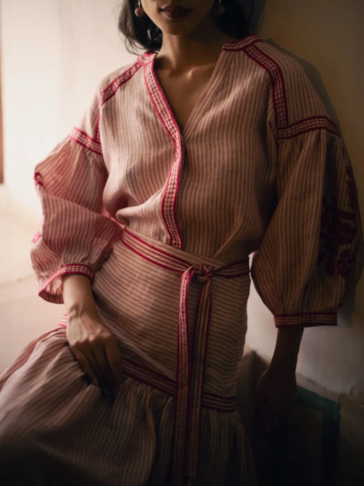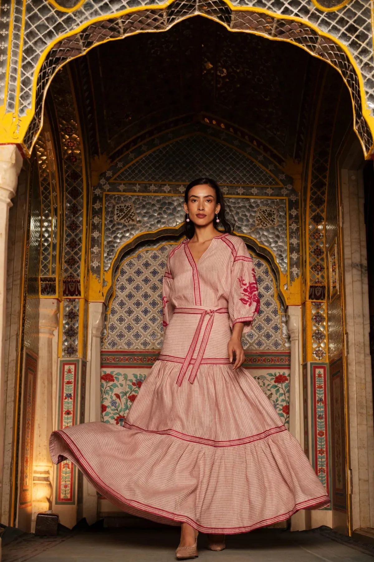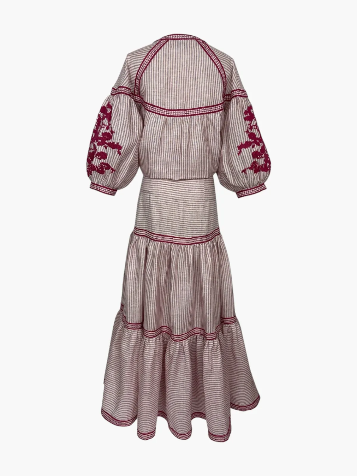 Our De Castro Pink Stripe Set features a maxi hip-hugging skirt and a blouse with puff sleeves and hand-embroidered floral motifs.Handcrafted by artisans in India.