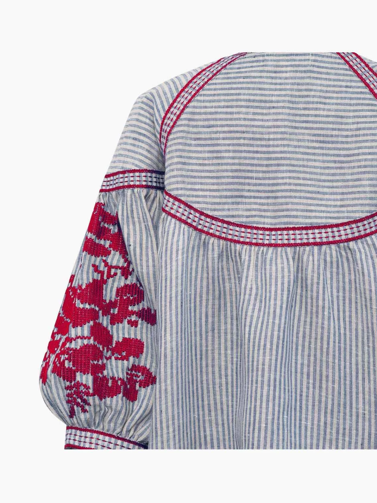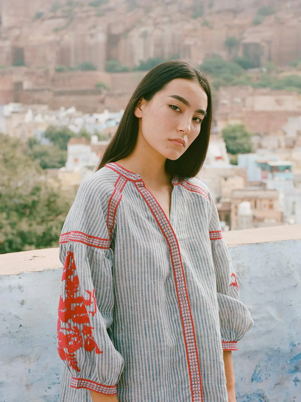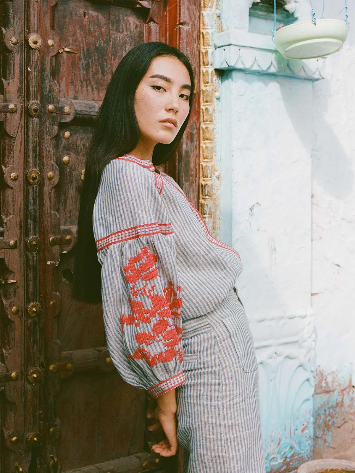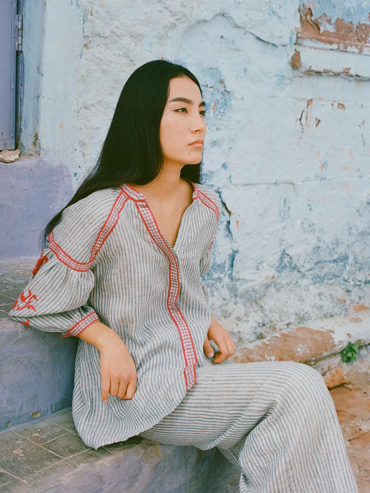 Our De Castro Stripes Set in Red features a puffed sleeve top with a V-neckline, hand-embroidered accents, and a relaxed fit. It’s teamed with matching wide leg pants with a high waist, patch pockets, and a zipper and button closure. Handcrafted by artisans in India.