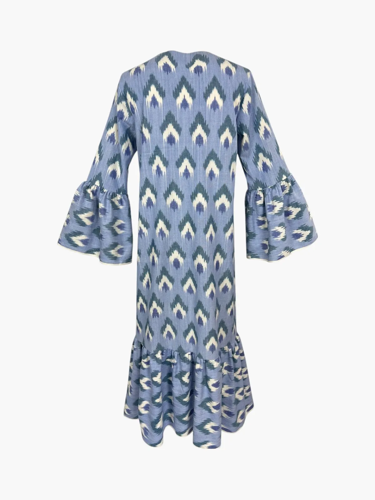 Our De Castro Viento Dress in Denim features an allover print, long sleeves with flared cuffs, a V-neckline, and a ruffle at the hem. Handcrafted by artisans in India.