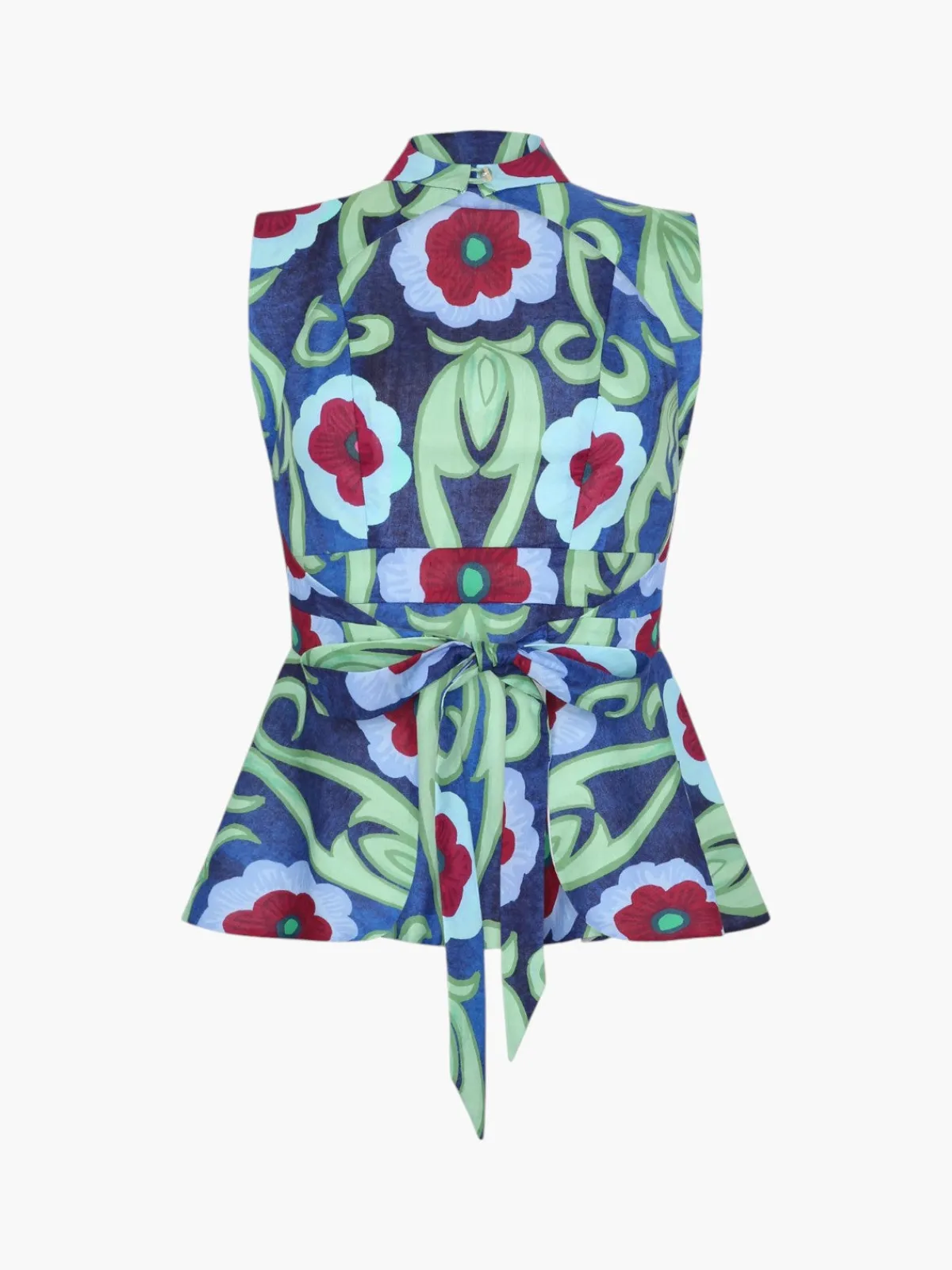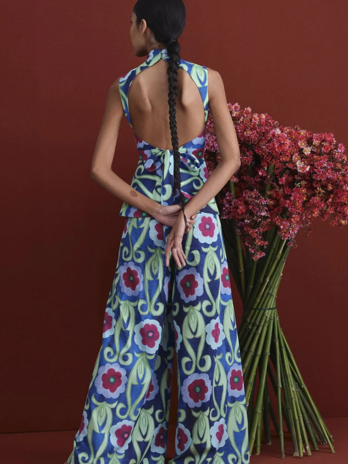 Our De Loreta Cacao Blouse in Geranios Print is a halter neck style top and has an open back. The top features a belt that ties in the back. Handcrafted by female heads of households in Peru.