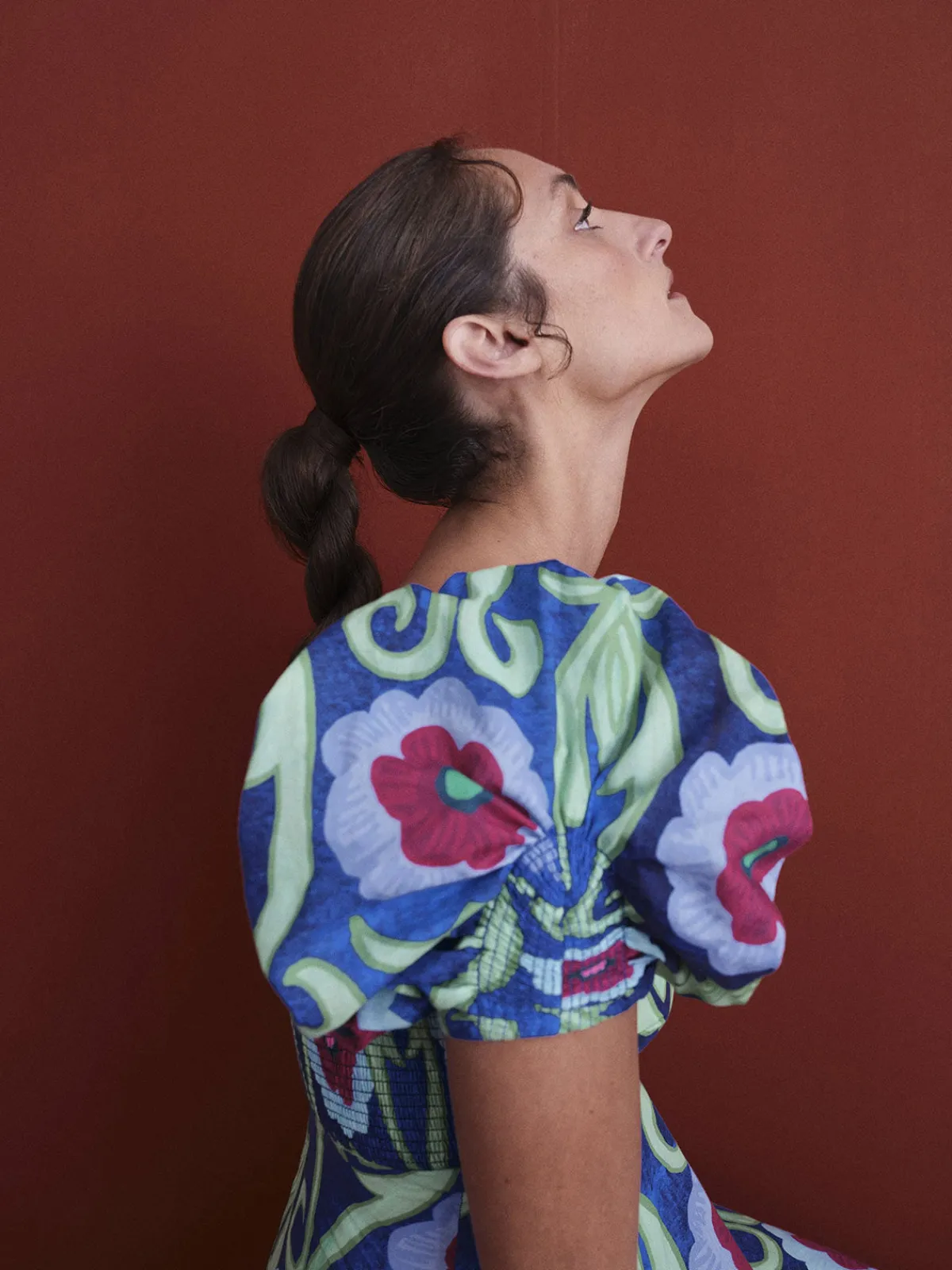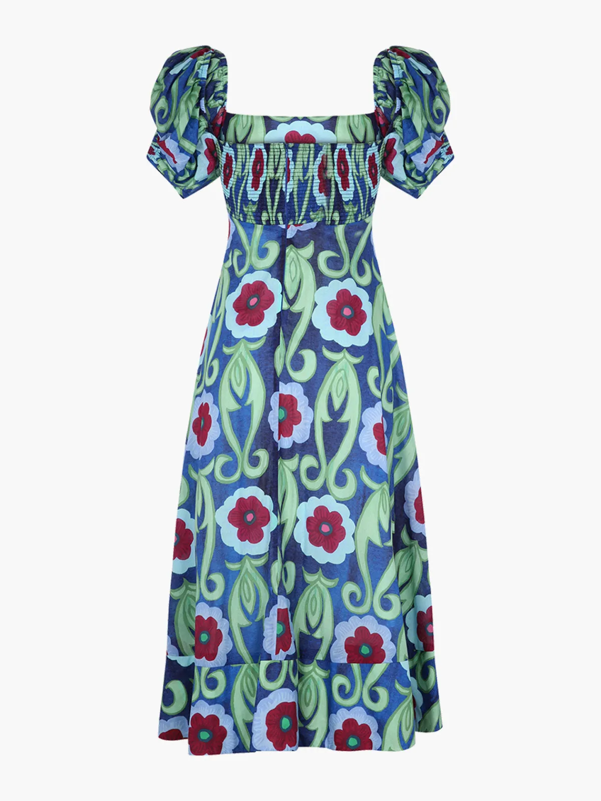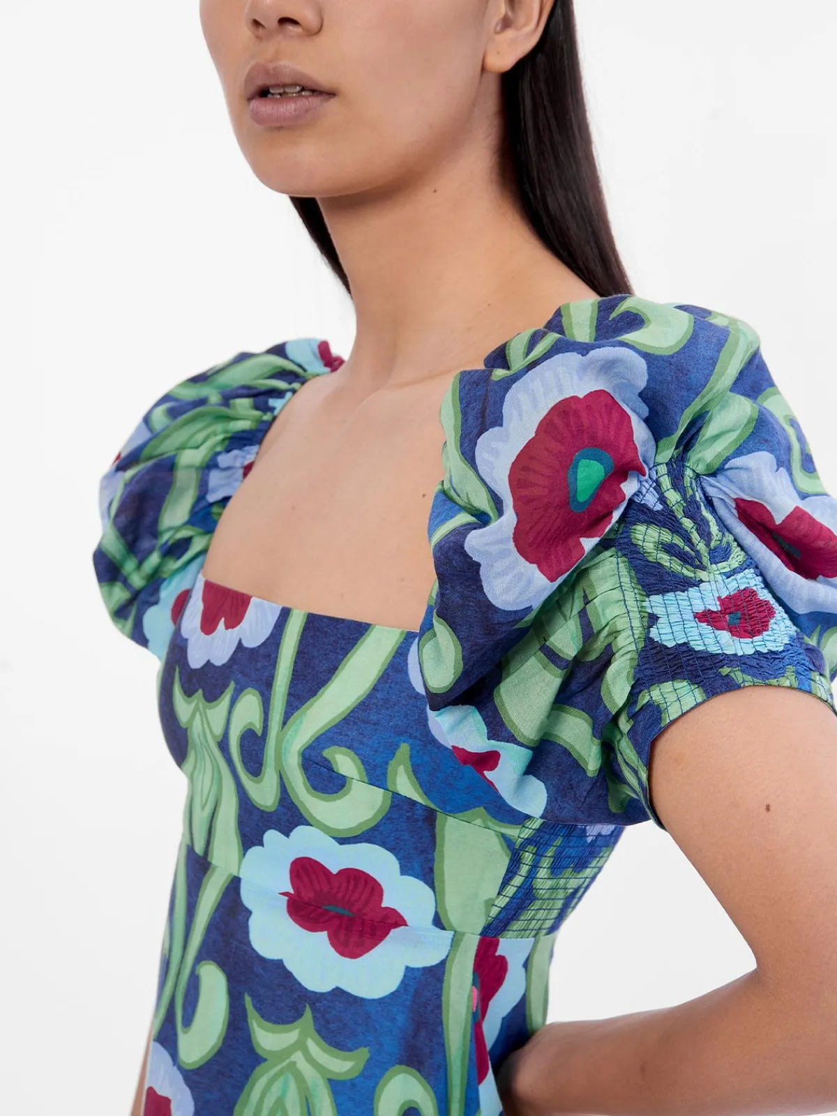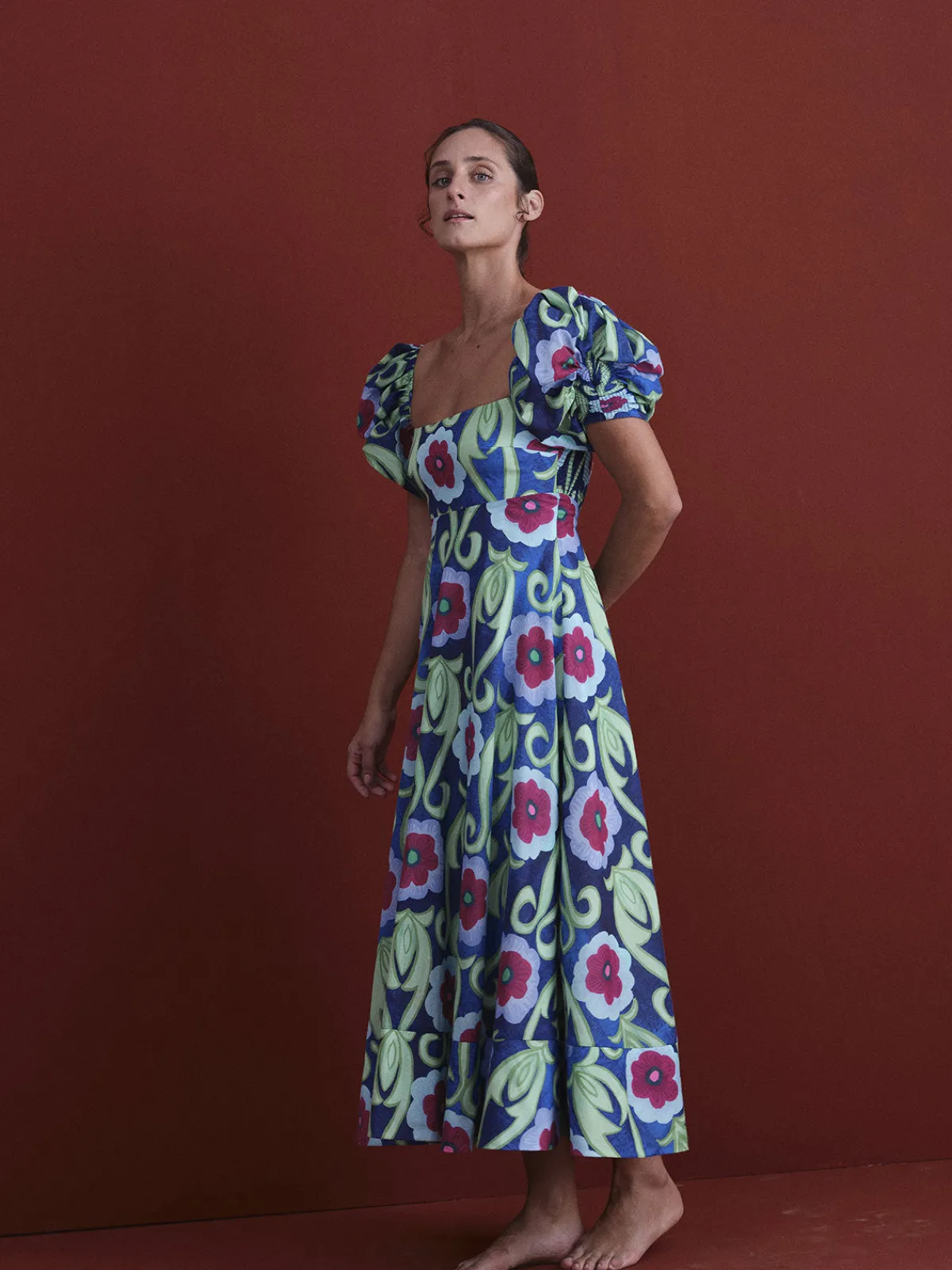 Our De Loreta Calla Dress in Geranios features an A-line silhouette in a maxi length with short puffed sleeves, a square neckline, and a center back zipper. Handcrafted by female heads of households in Peru.