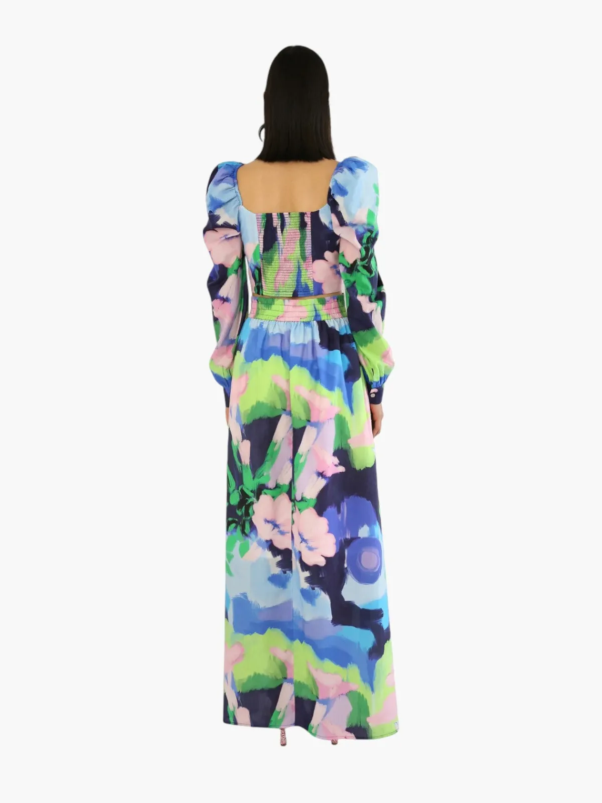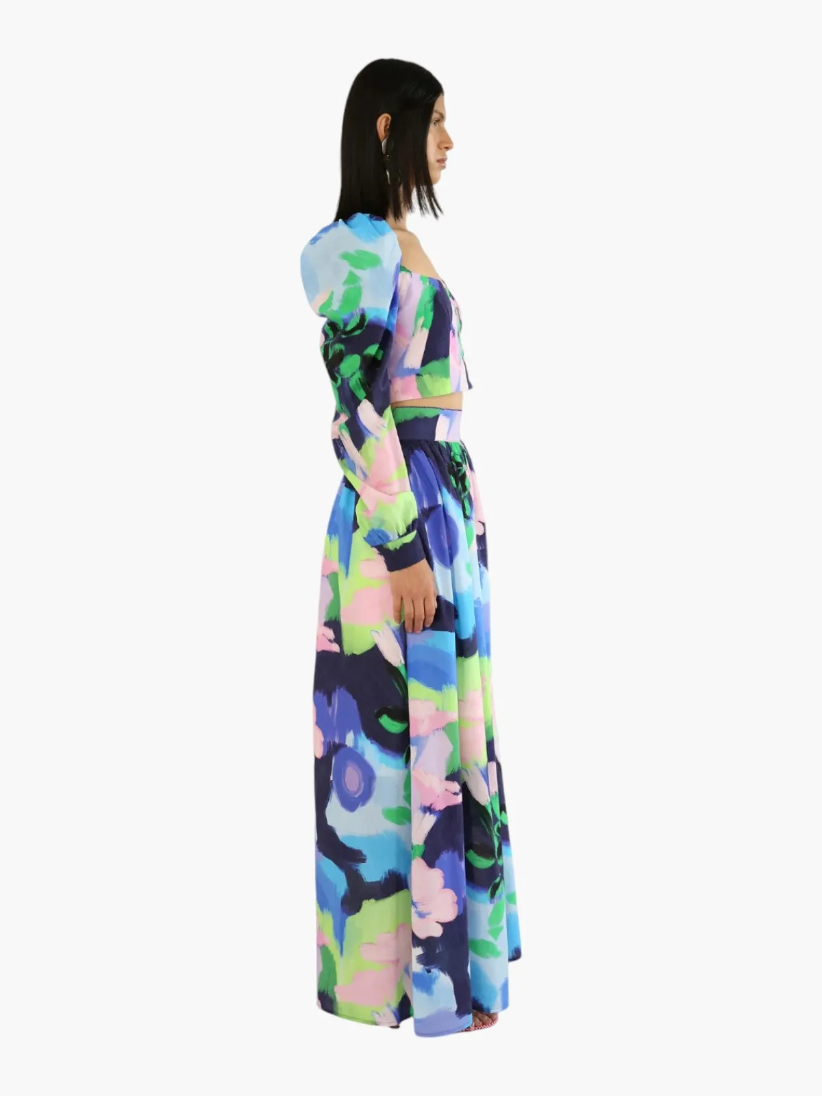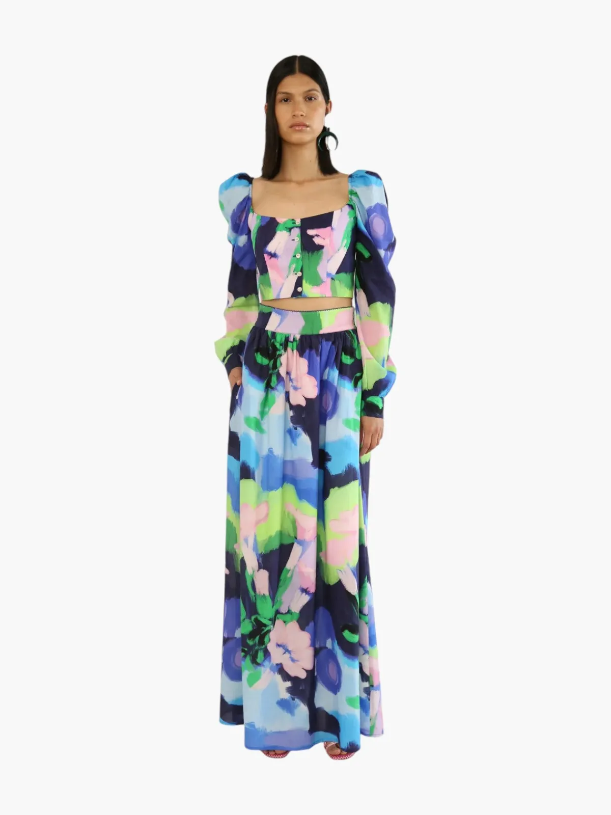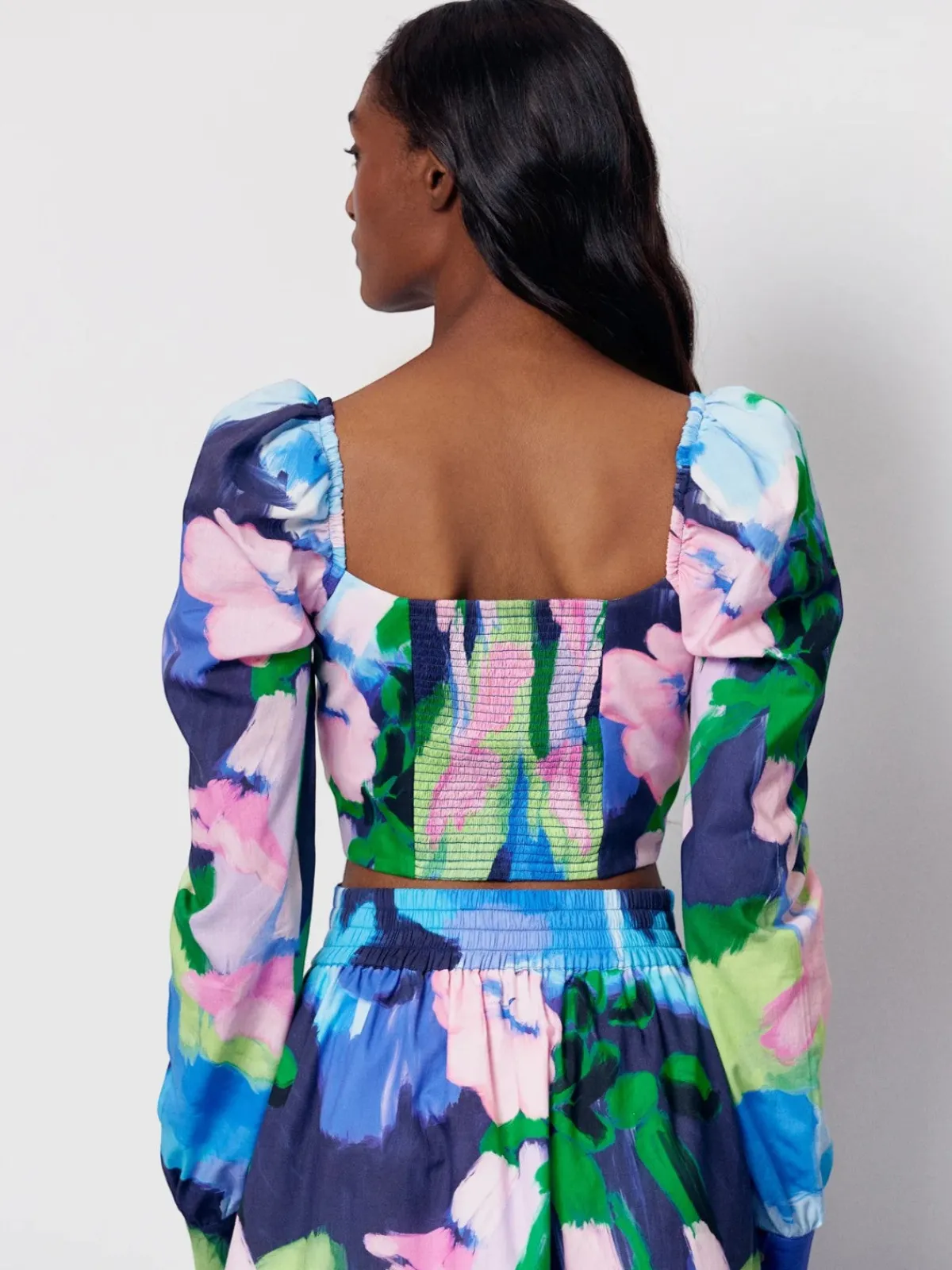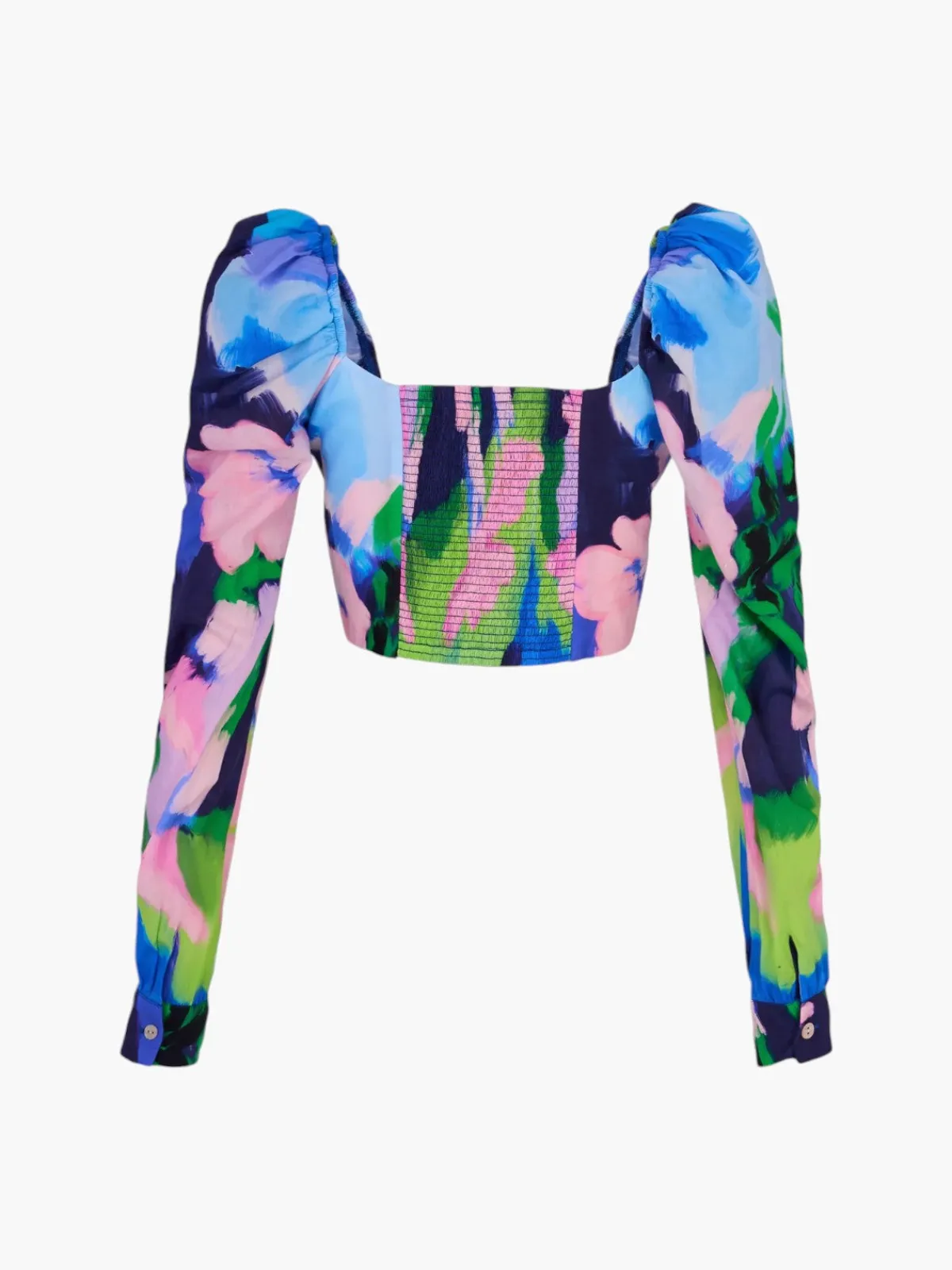 Our De Loreta Cocada Top in Oleo Azul is a long sleeve crop top with puff sleeve details. The top has buttons in the front. Handcrafted by female heads of households in Peru.