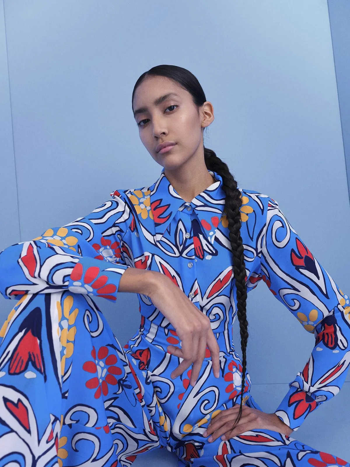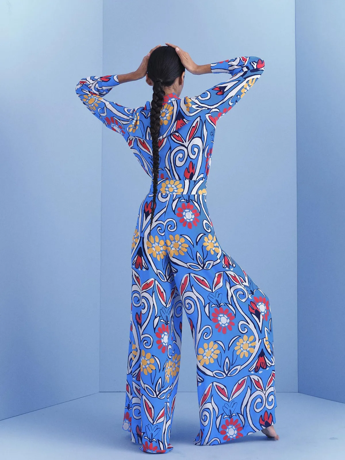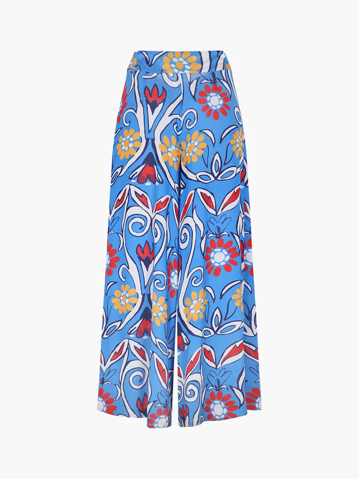 Our De Loreta Gaspar Pants in Roco Celeste boast vibrant style in a high waist silhouette with wide legs and a bold allover print. Handcrafted by female heads of households in Peru.