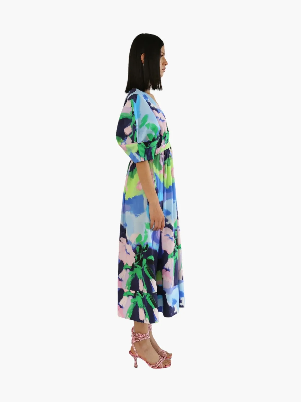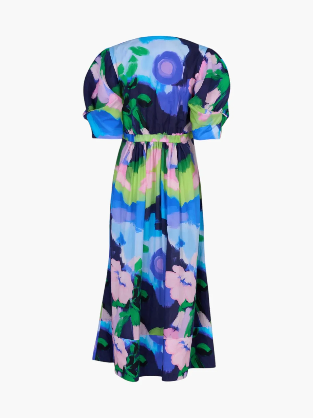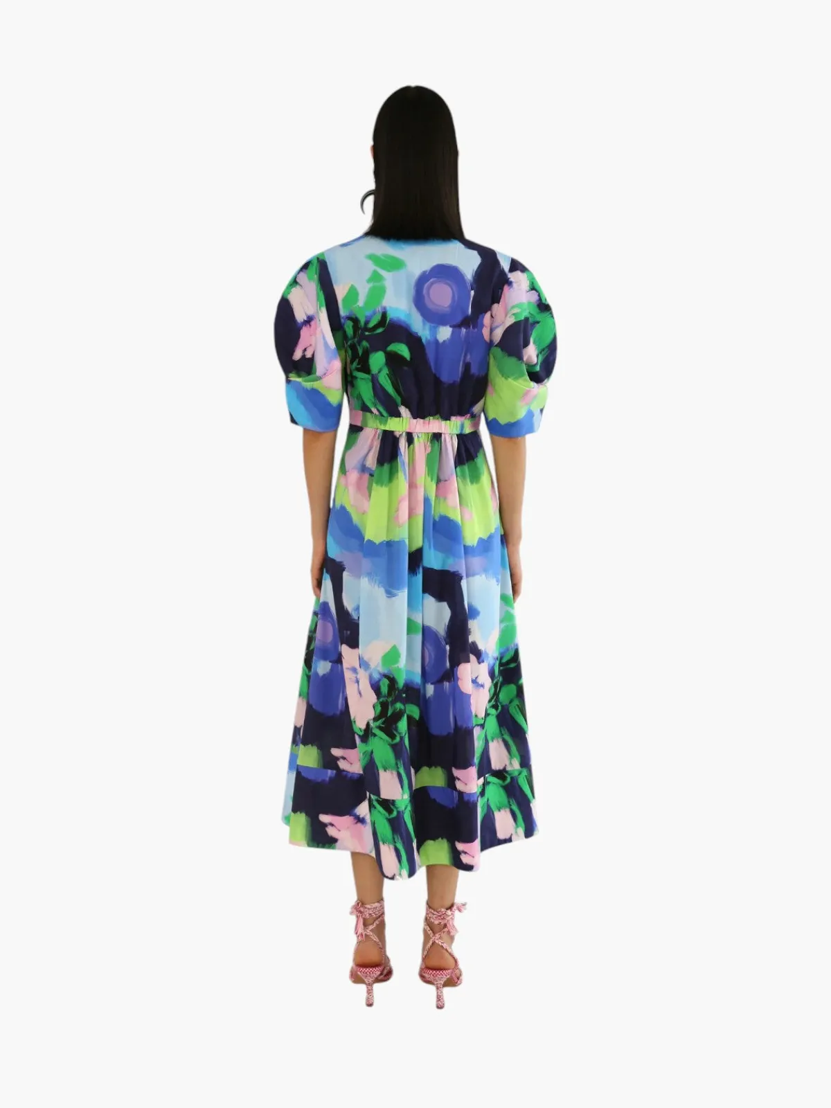 Our De Loreta Ita Dress in Oleo Azul is a midi length dress featuring a deep neckline and puffed sleeves. The dress is full of movement. Handcrafted by female heads of households in Peru.