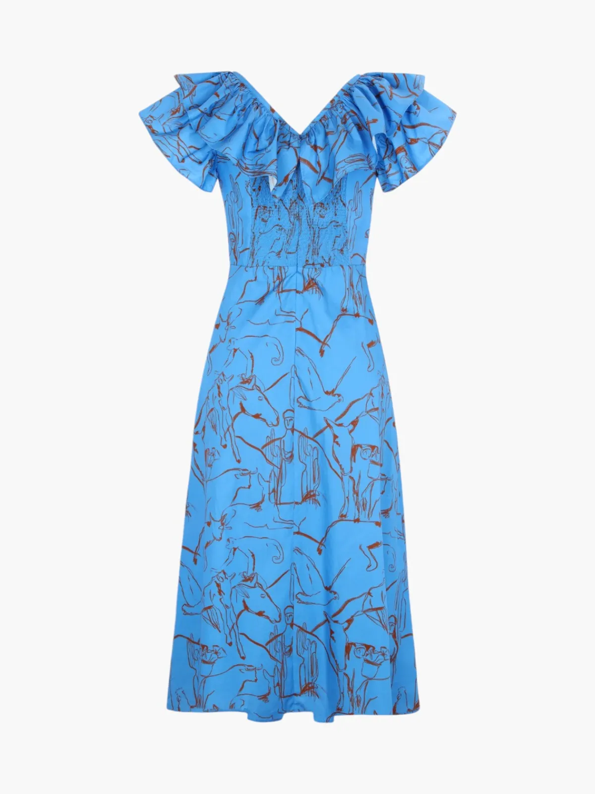 Our De Loreta Margarita Dress in Caballos Azul is a midi length dress with short sleeves and a ruffle detail in the front. Handcrafted by female heads of households in Peru.