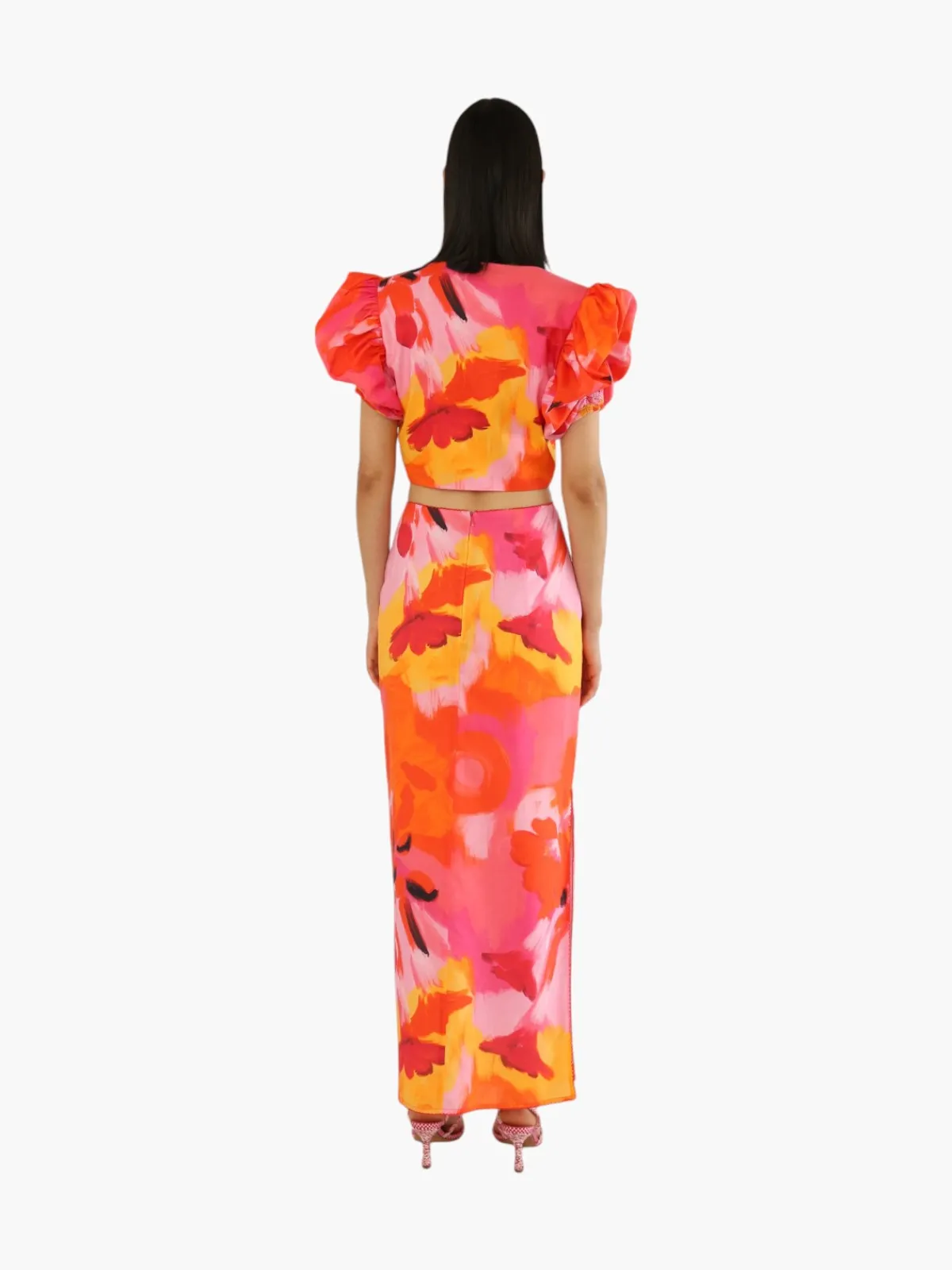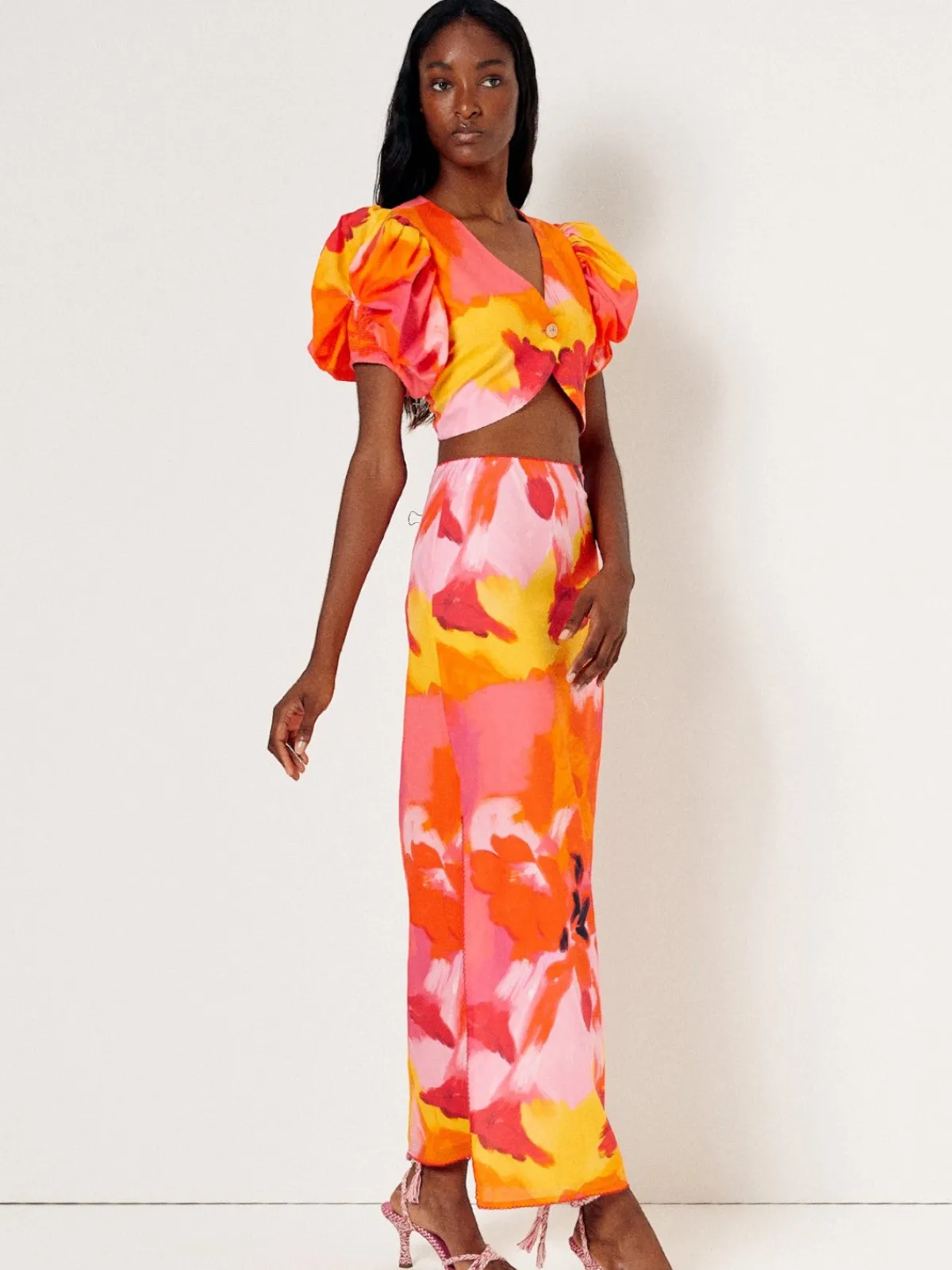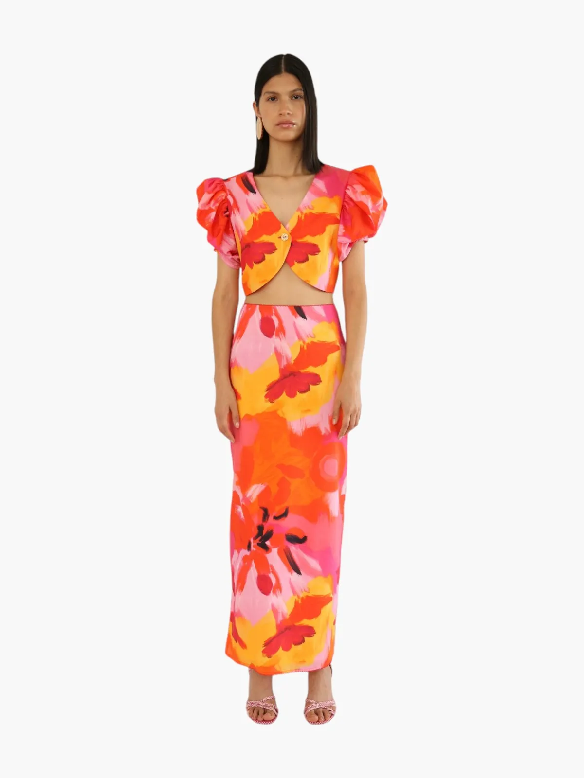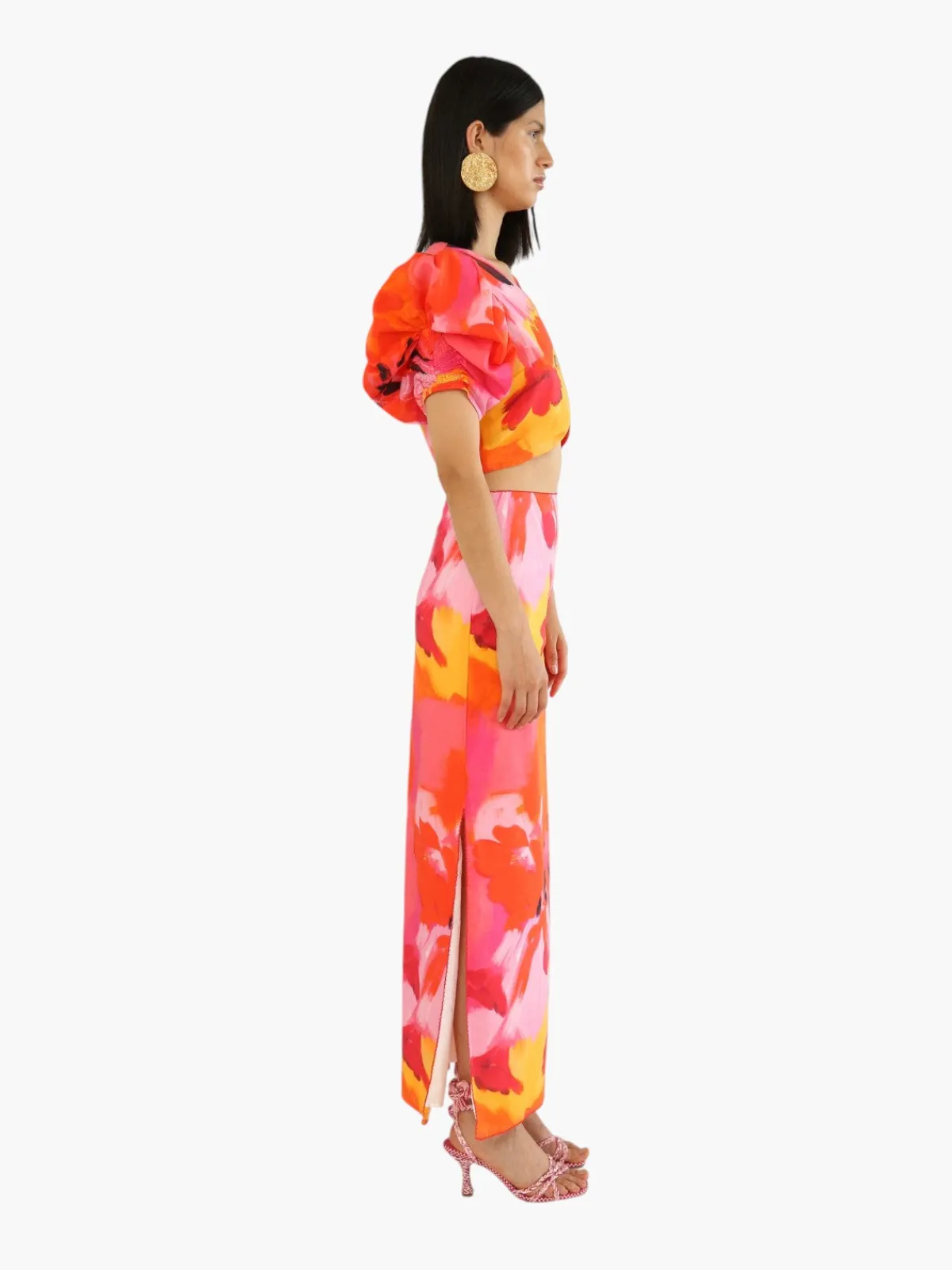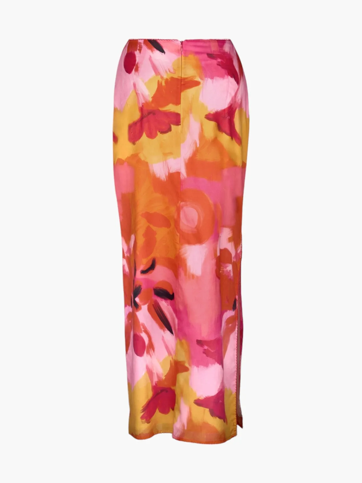 Our De Loreta Polen Skirt in Anturio boasts a bold print in a maxi length with a side slit. This skirt has a flattering fit with a concealed zipper in the back.Handcrafted by female heads of households in Peru.
