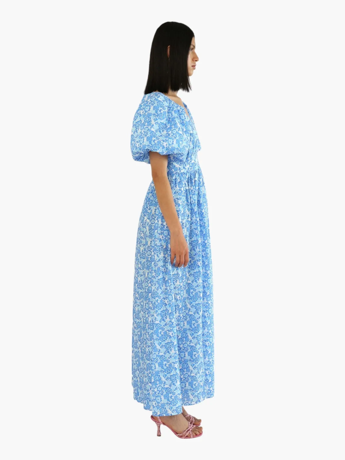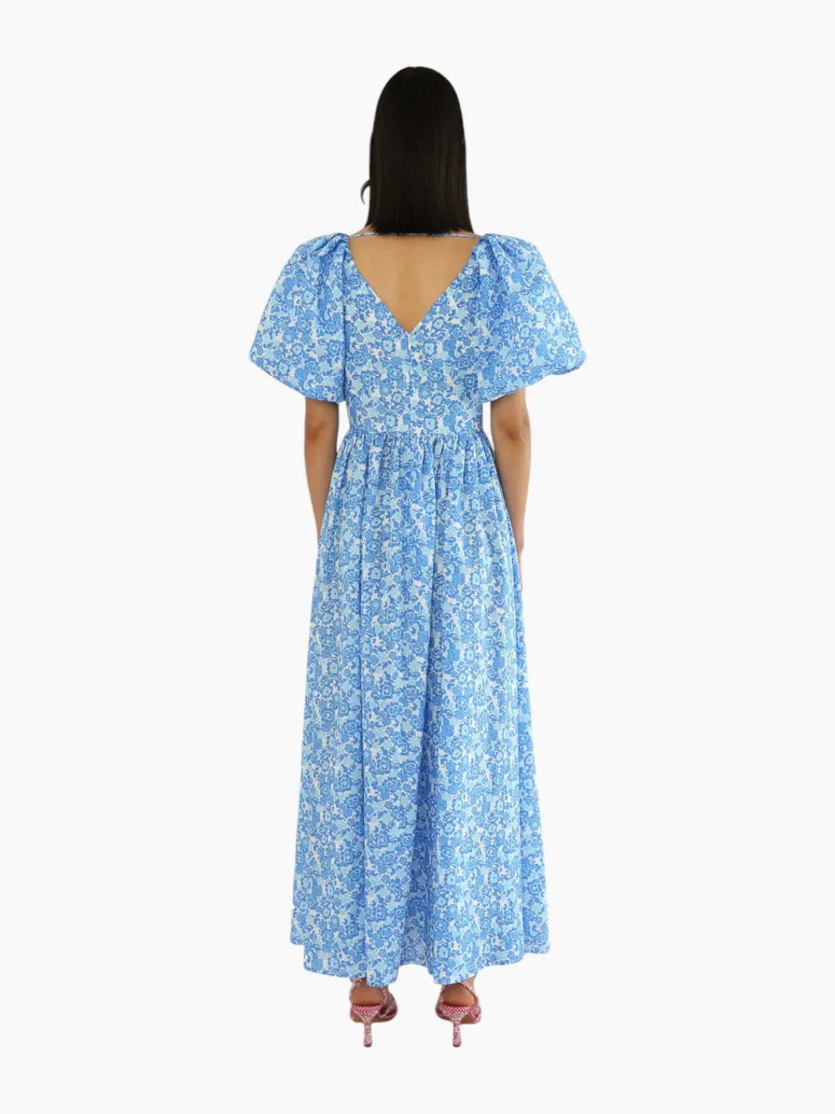 Our De Loreta Rococo Dress in Lavanda is a maxi length dress with a fitted bodice and flowy skirt. The top of the dress has puff sleeves and deep neckline. Handcrafted by female heads of households in Peru.