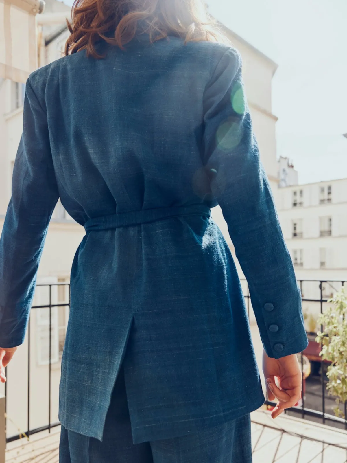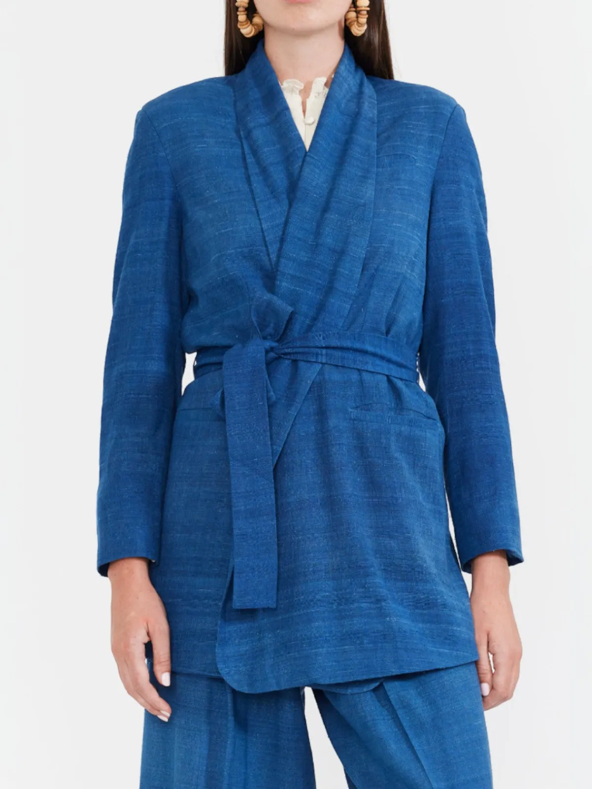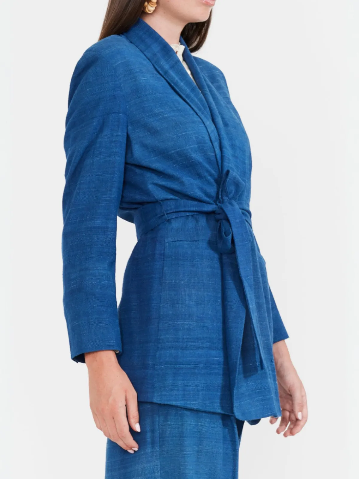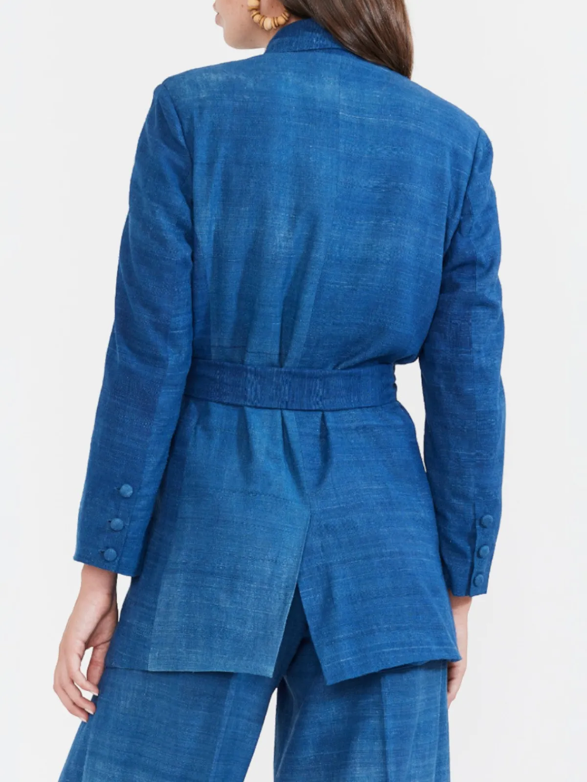 Our EDDY Blazer With Waist Tie in Maati Indigo Silk is a tailored blazer with a longer length and more fluid fit lend a laid-back air, while the structured shoulder pads, fabric-covered bold button details, and handkerchief pocket at the left breast maintain an undeniable sense of authority. A removable waist belt offers versatile styling options. Handcrafted by artisans in India.