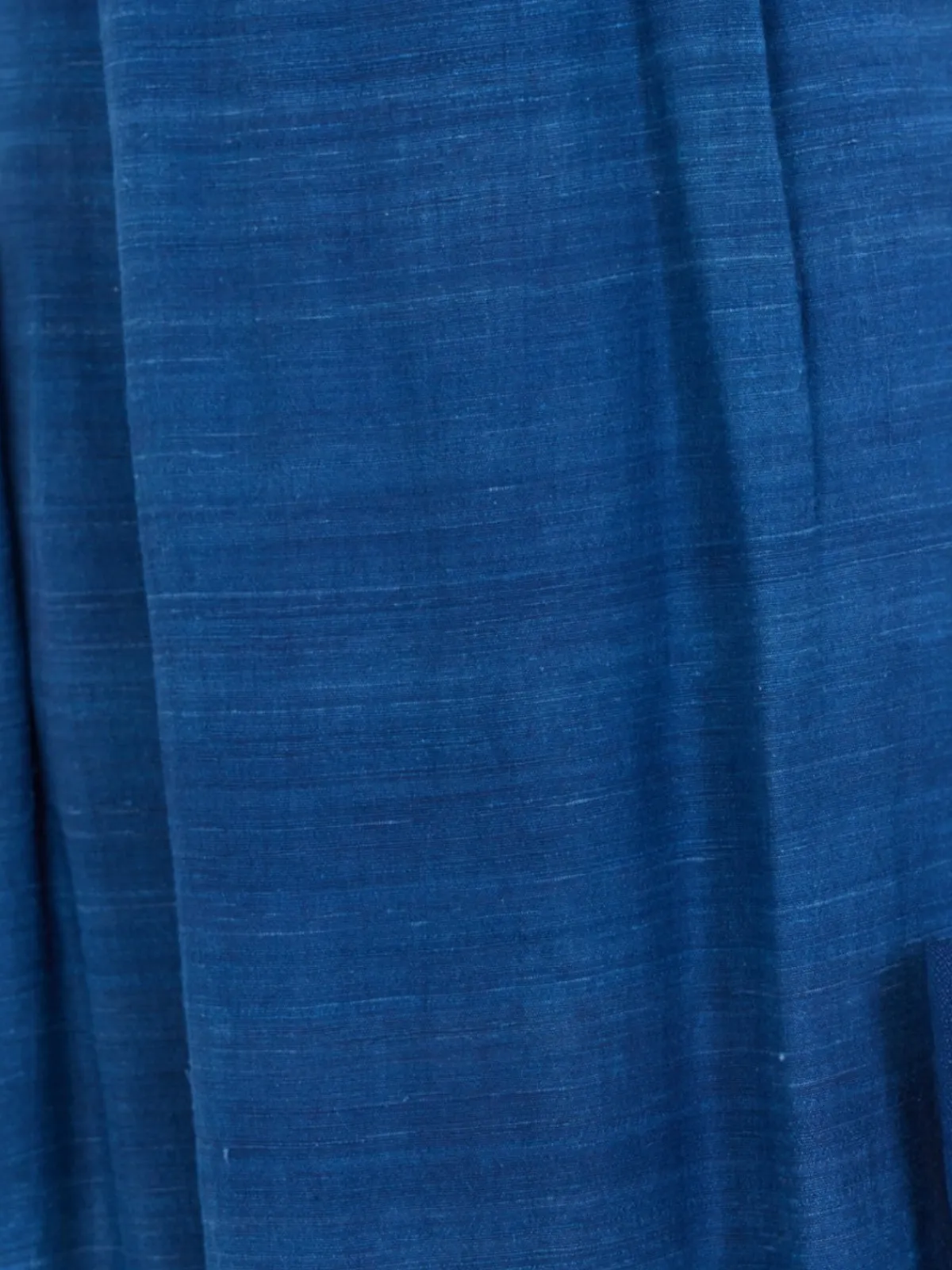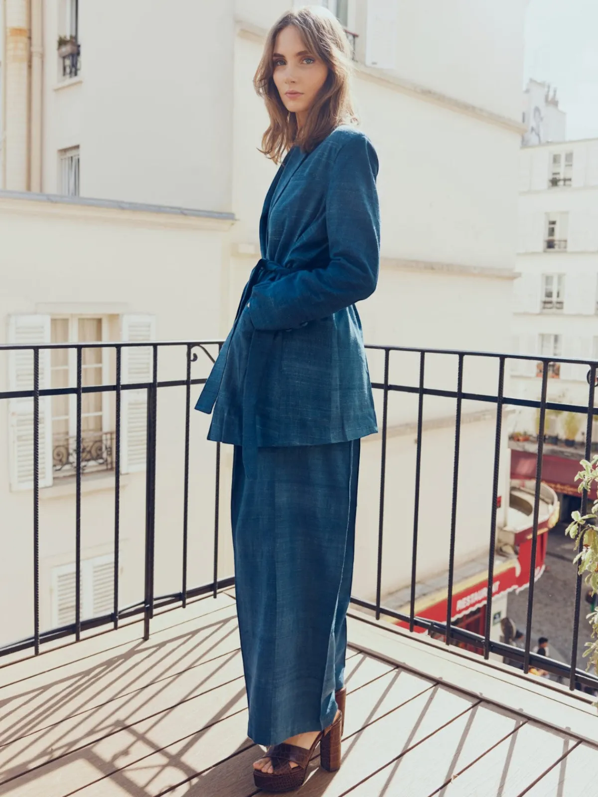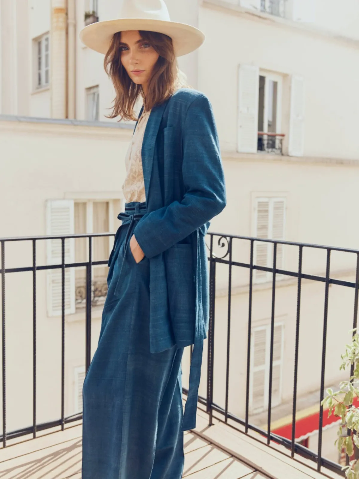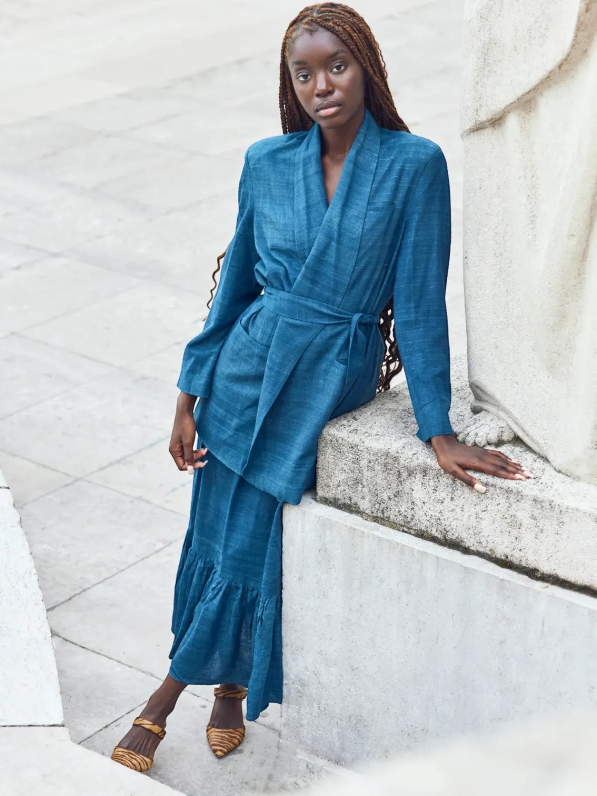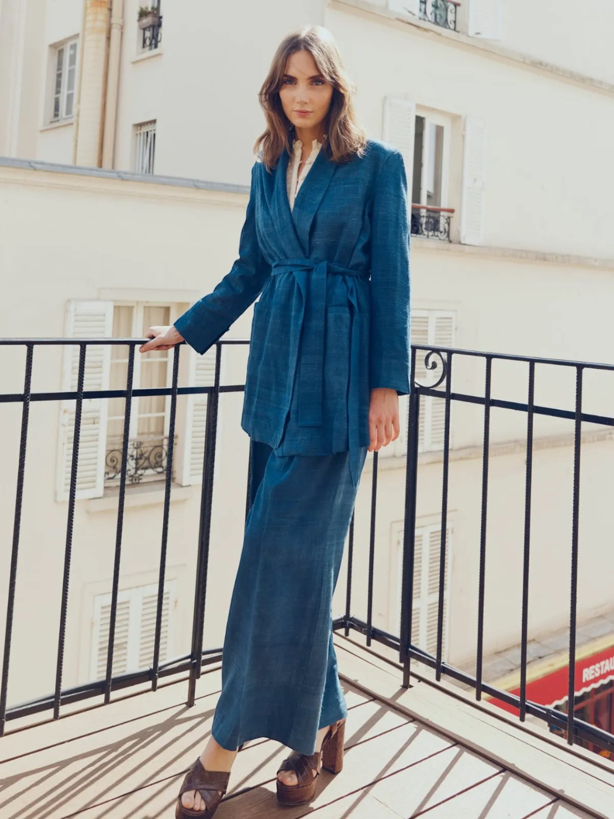 Our EDDY Blazer With Waist Tie in Maati Indigo Silk is a tailored blazer with a longer length and more fluid fit lend a laid-back air, while the structured shoulder pads, fabric-covered bold button details, and handkerchief pocket at the left breast maintain an undeniable sense of authority. A removable waist belt offers versatile styling options. Handcrafted by artisans in India.