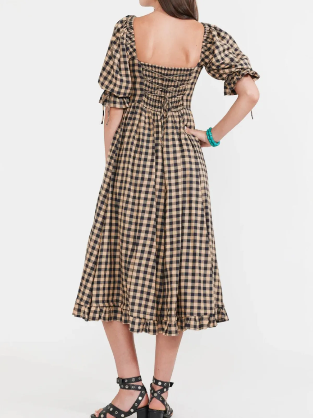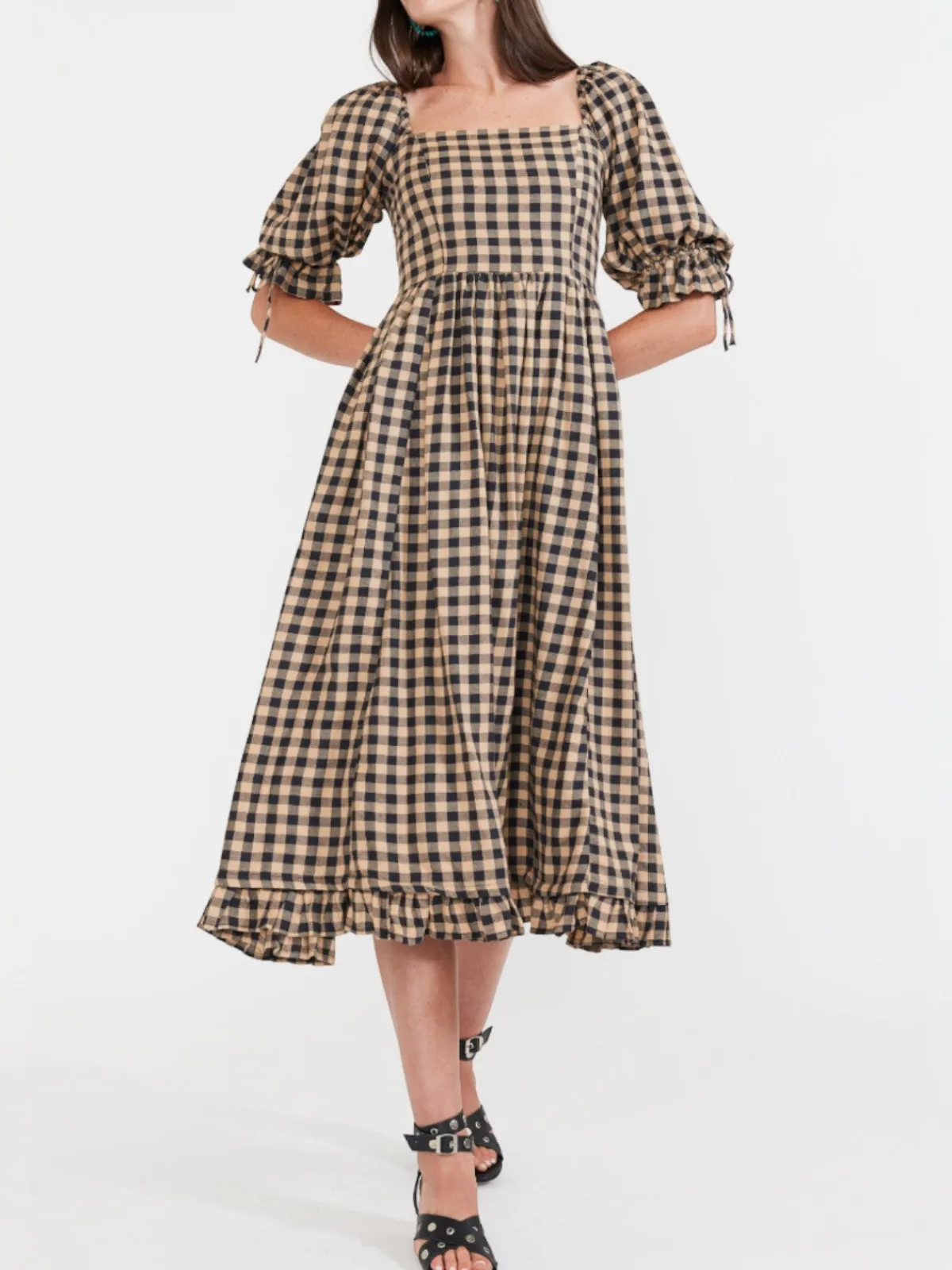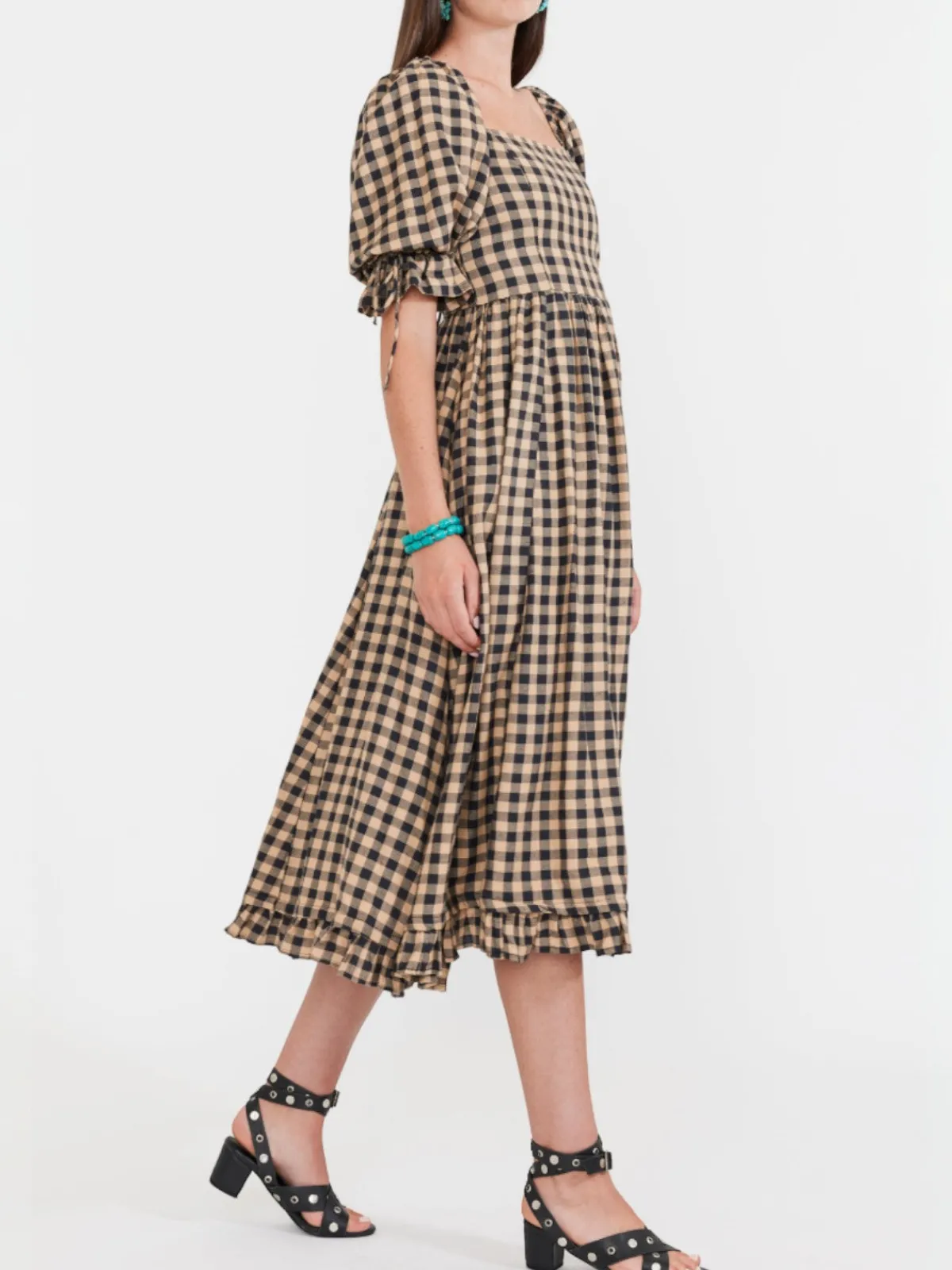 Our EDDY Grace Midi Dress in Black u0026amp; Tan Check is an empire waist midi dress featuring an elasticized back and shoulders, along with adjustable corset ties at the back, it allows for a tailored fit that flatters every figure. Romantic details abound, with soft bubble sleeves, a delicately ruffled hemline, and hidden side pockets that blend practicality with charm. Handcrafted by artisans in India.