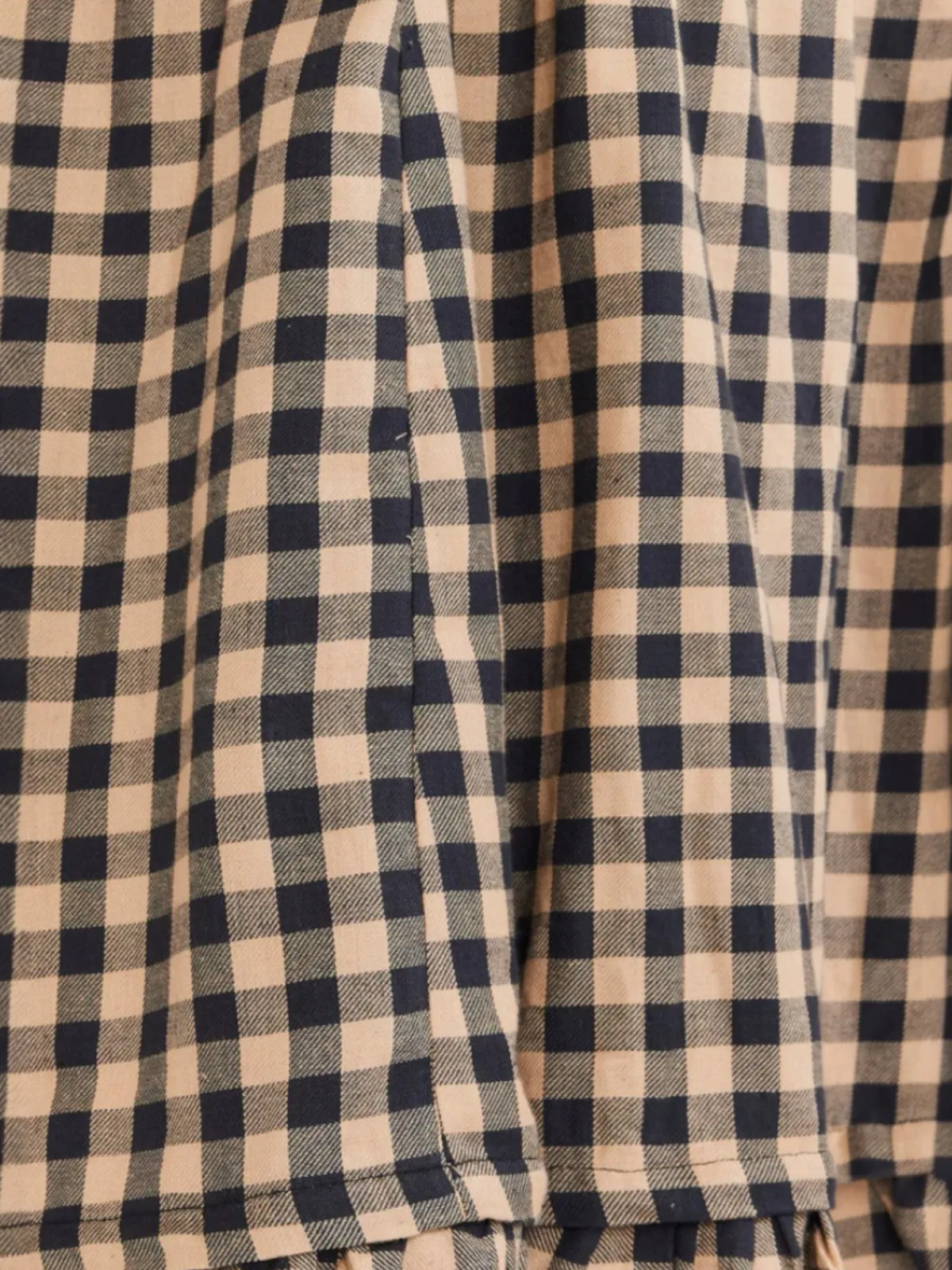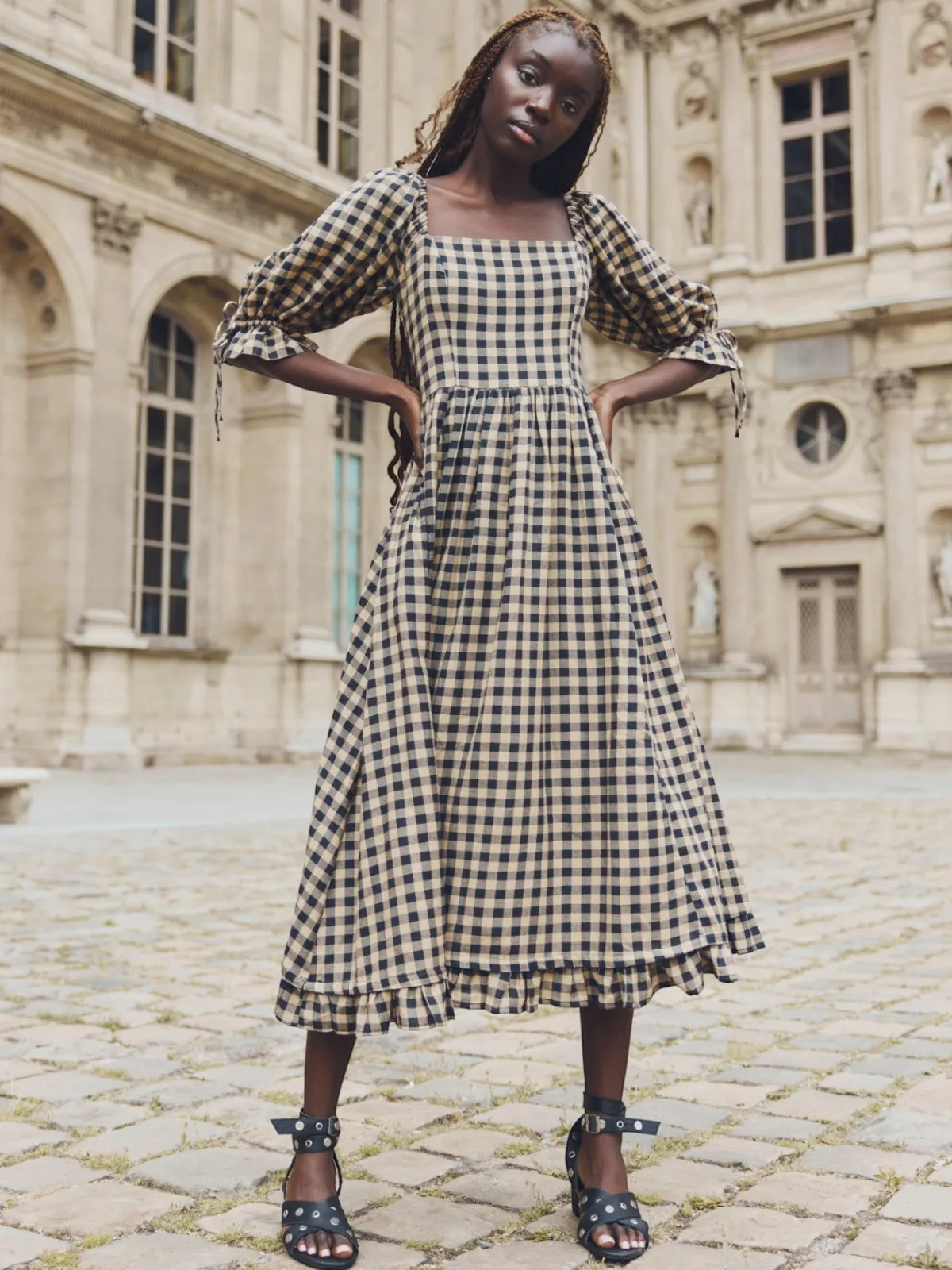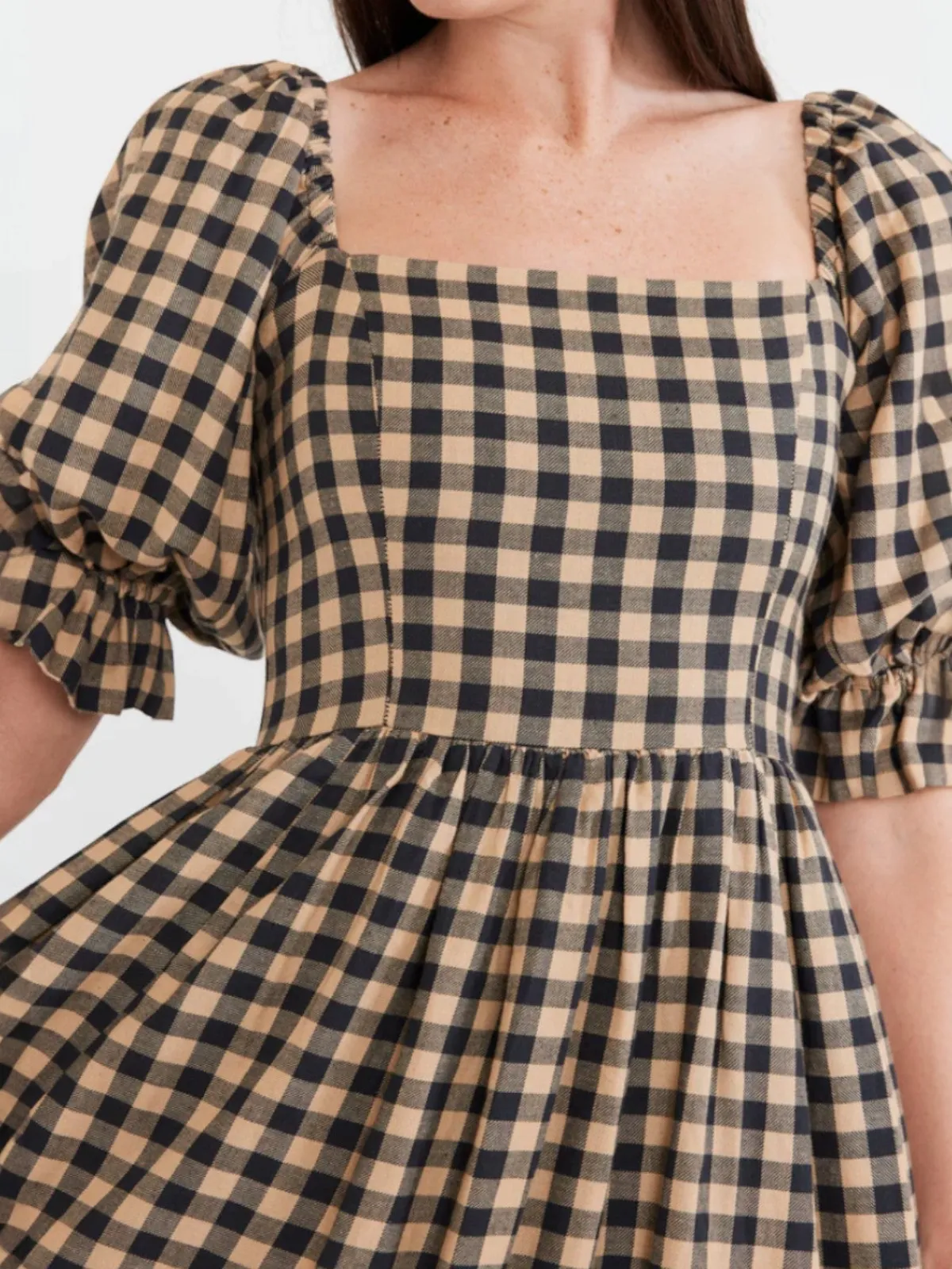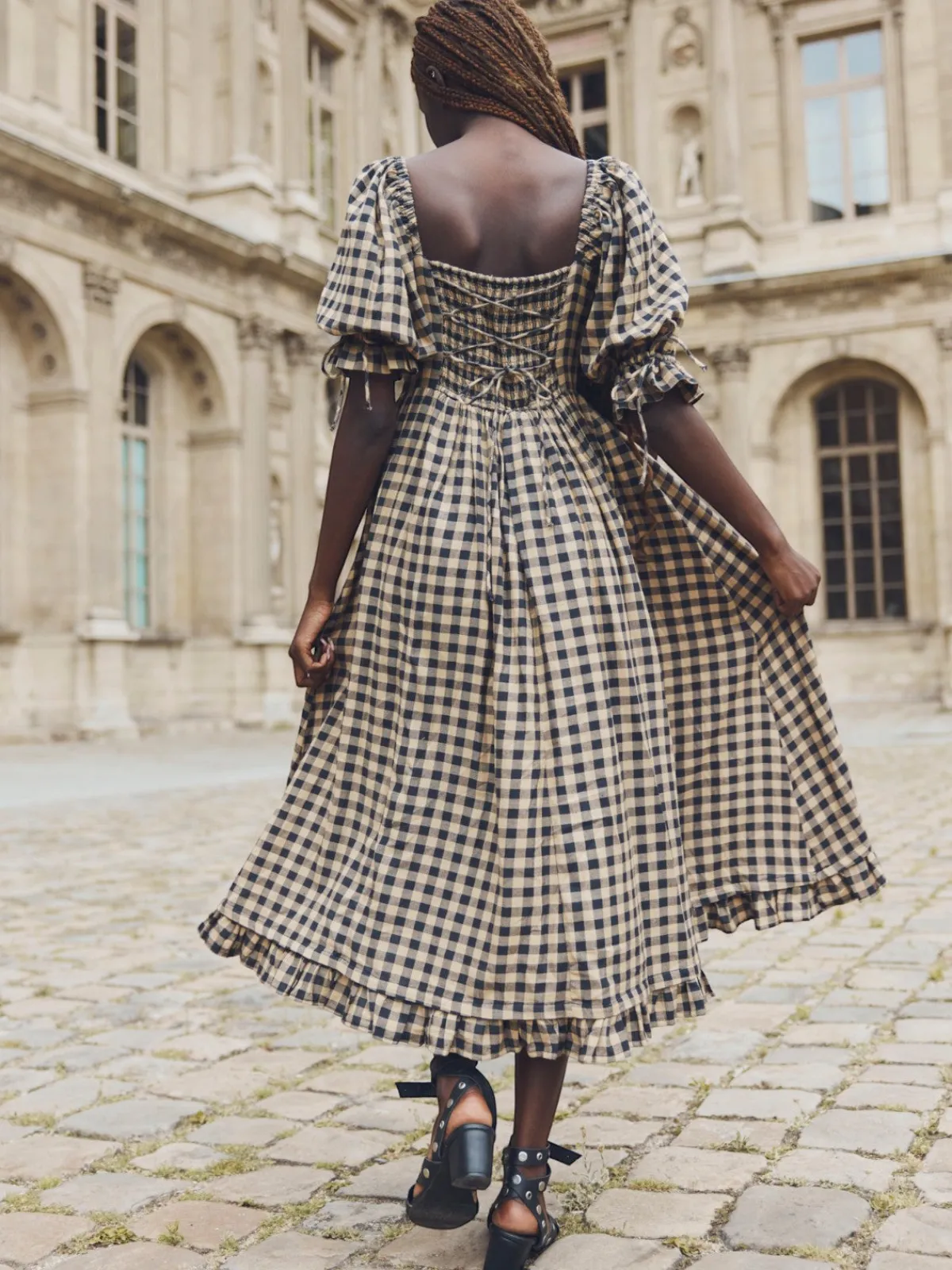 Our EDDY Grace Midi Dress in Black u0026amp; Tan Check is an empire waist midi dress featuring an elasticized back and shoulders, along with adjustable corset ties at the back, it allows for a tailored fit that flatters every figure. Romantic details abound, with soft bubble sleeves, a delicately ruffled hemline, and hidden side pockets that blend practicality with charm. Handcrafted by artisans in India.
