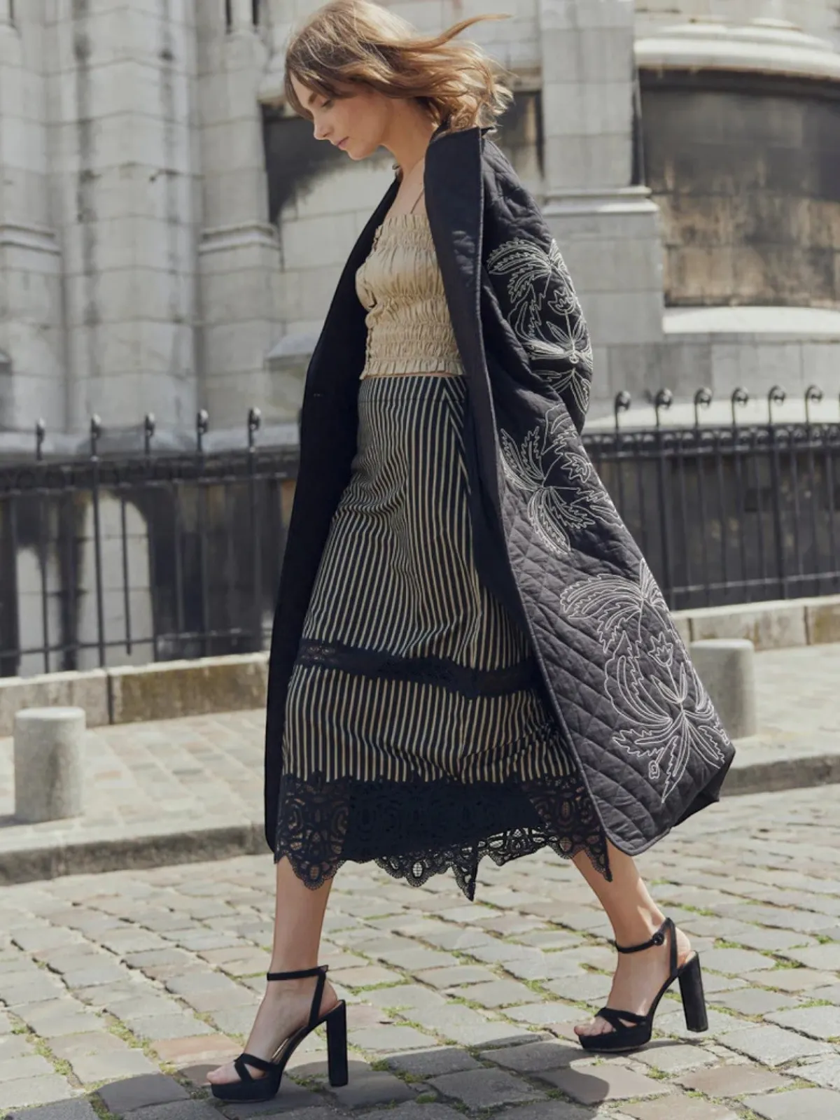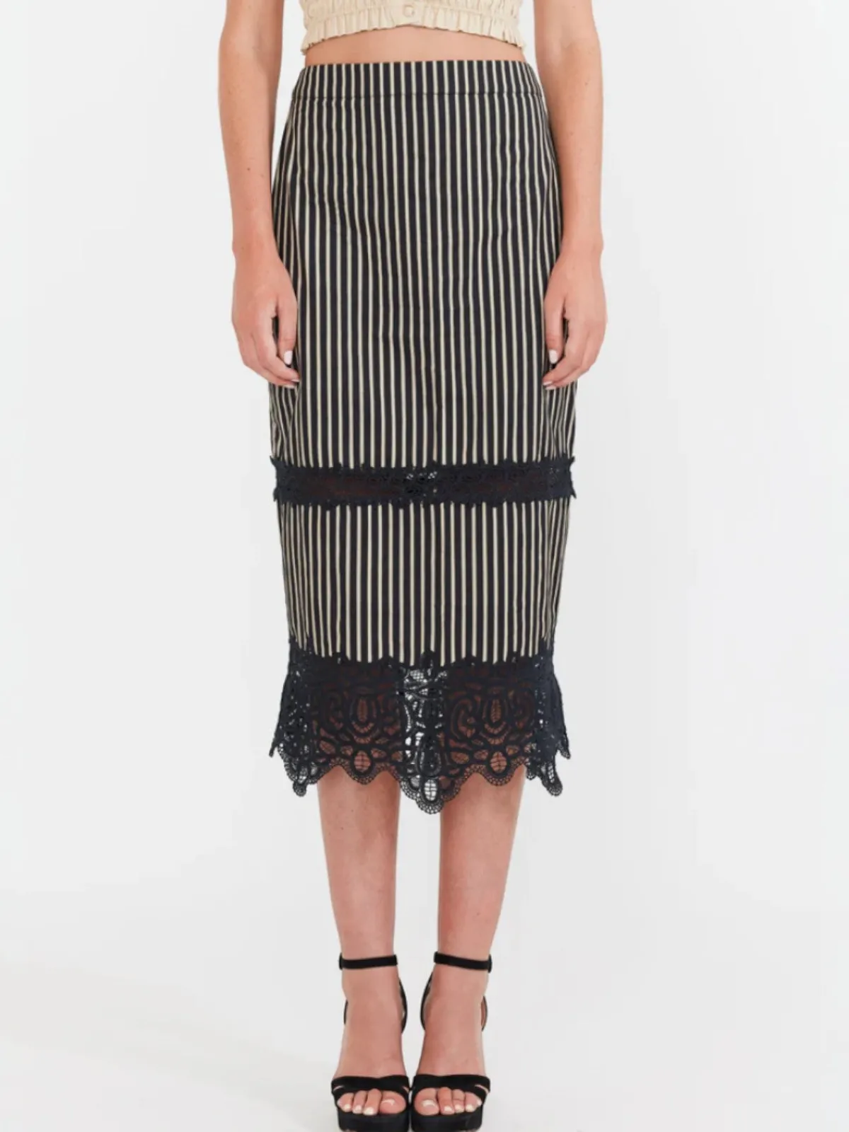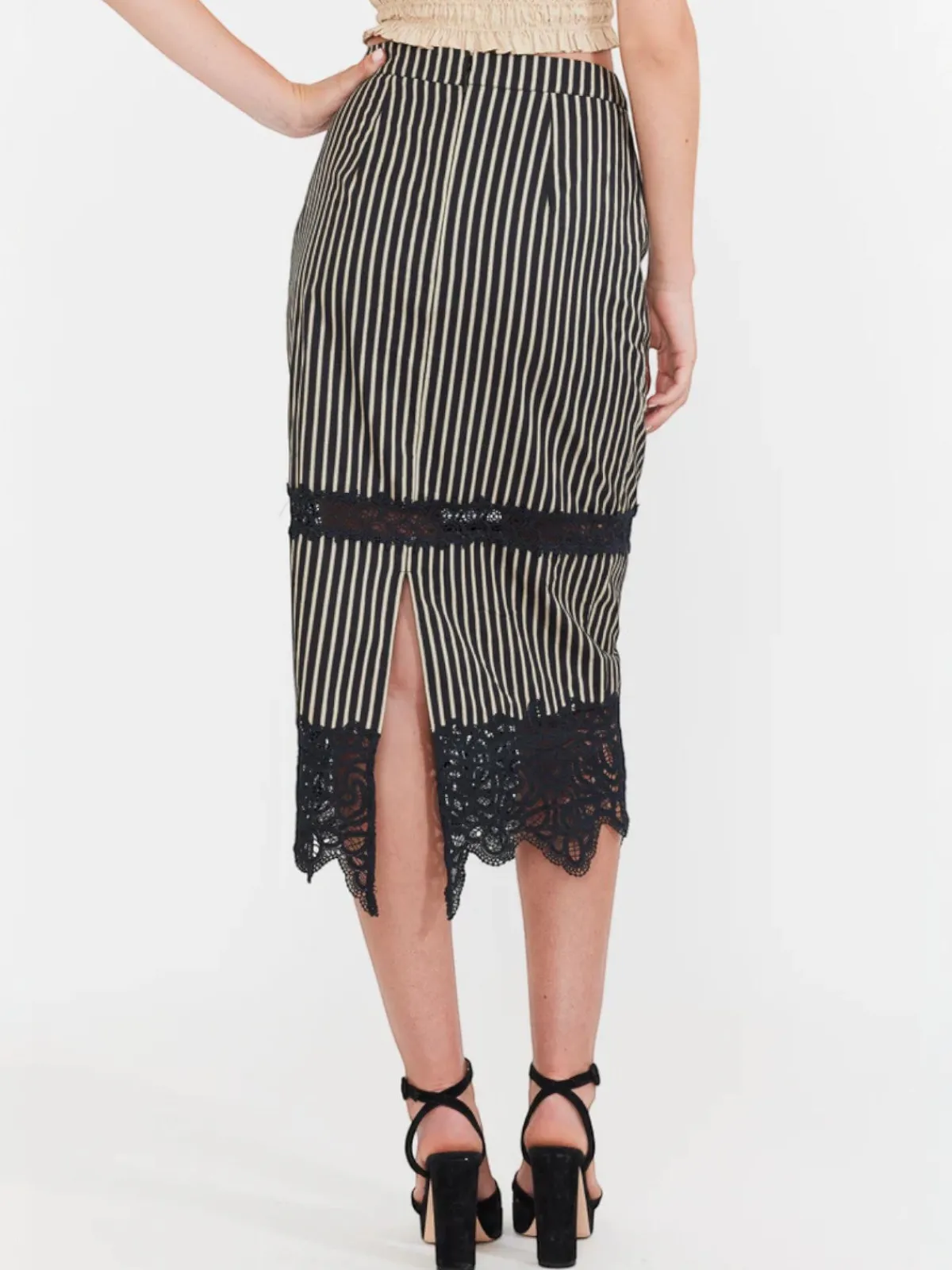 Our EDDY Lacey Midi Skirt in Black u0026amp; Khaki Stripe is a sophisticated fusion of bold design and tailored elegance, rendered in a striking black and khaki vertical stripe. This ultra-high-rise, pencil midi skirt is expertly crafted to hug the contours of the body, with a flawless fit secured by an invisible back zipper. A dramatic deep V-slit at the back adds a touch of allure, while semi-sheer black lace inset detailing at the thigh and hem introduces an element of intricate, sensual texture. Handcrafted by artisans in India.