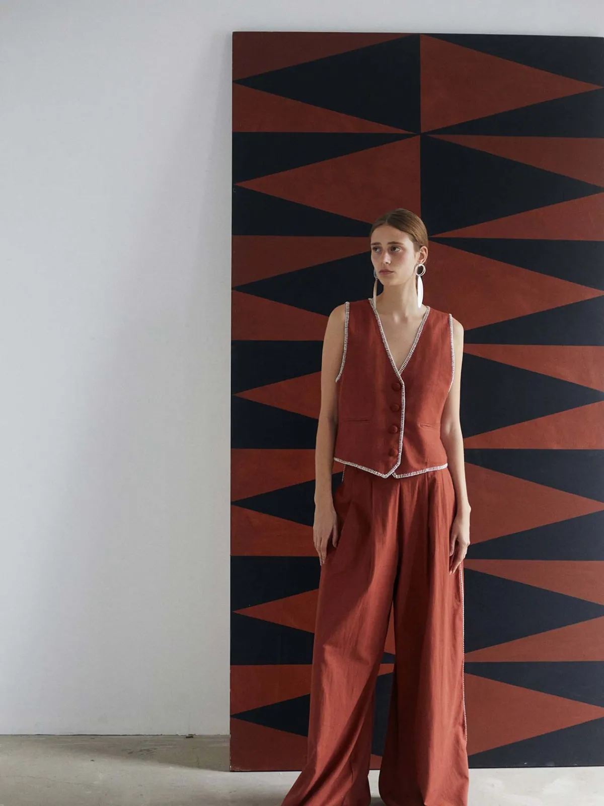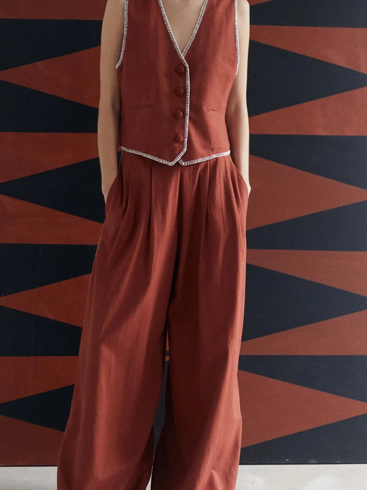 Our ESCVDO Amalia Pants in Brown are high waisted made from organic cotton and linen. The pants feature backstitching on the sides, hems, and pockets. Made by Delicia Vargas in her workshop in Lima, Peru.