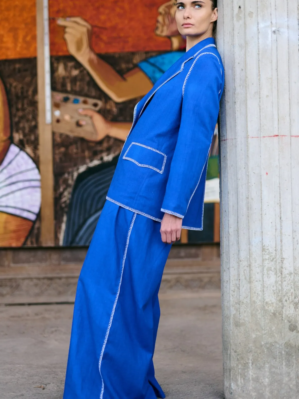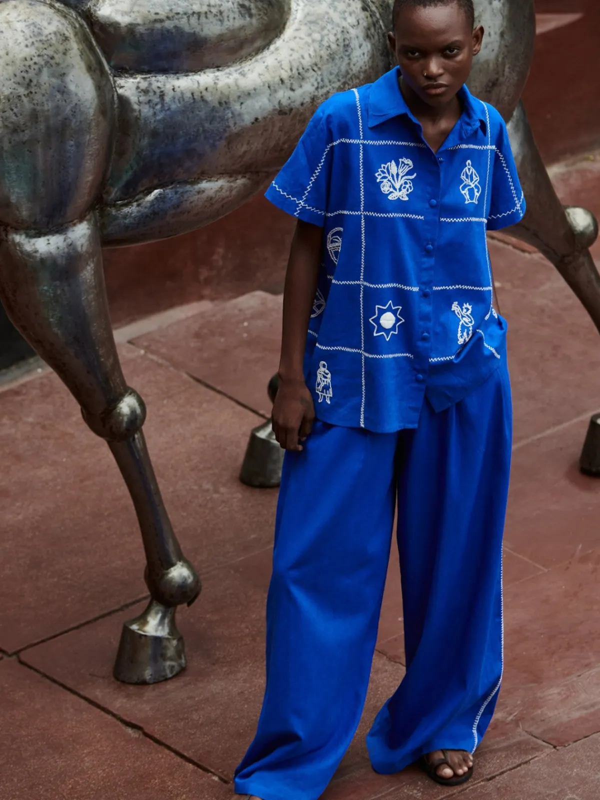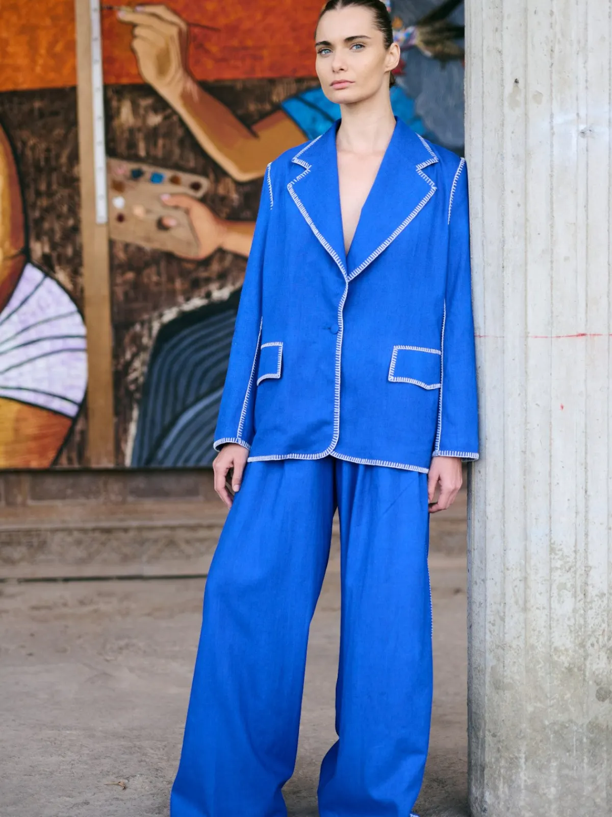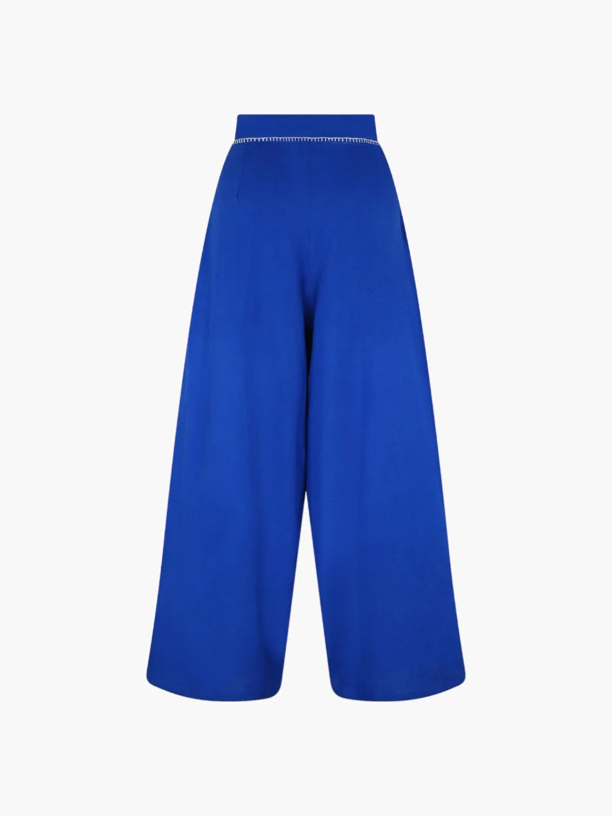 Our ESCVDO Amalia Pants in Electric Blue/Ivory is made from cotton and linen. These high waist pants feature a loose fit through the legs. Made by Delicia Vargas in her workshop in Lima, Peru.