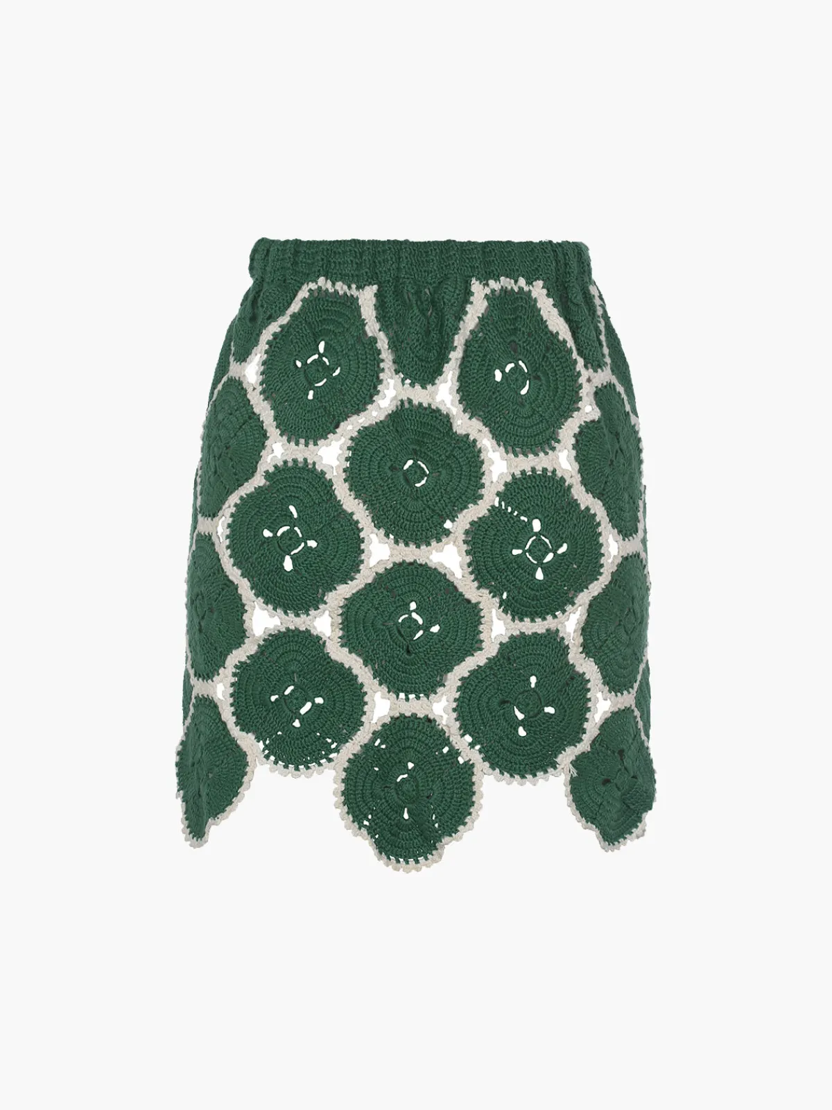 Our ESCVDO Azucena Skirt in Green is crafted by knitting together different crocheted pieces, many inspired by the flower motives present in Andean art. Handcrafted by female artisans in Peru.