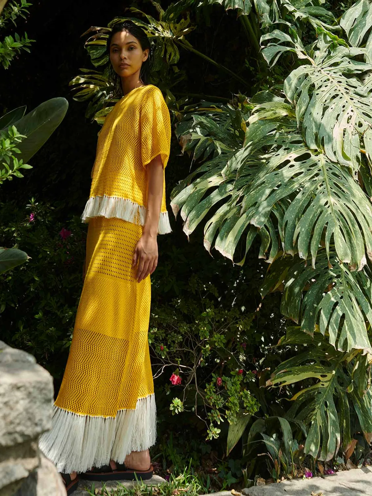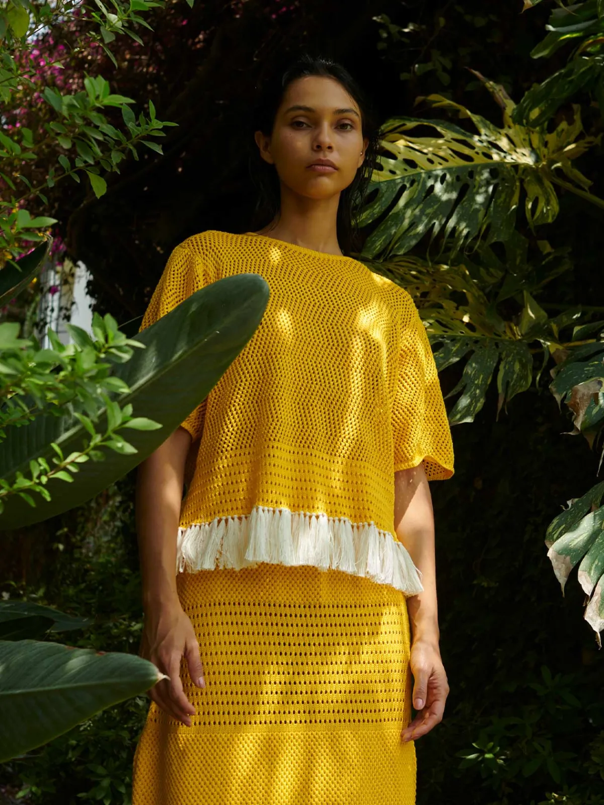 Our ESCVDO Carisa Blouse in Yellow features a loose crewneck silhouette with short sleeves. Finished with fringes at the hem. Made by Vilma Bautista in her workshop in Lima, Peru.