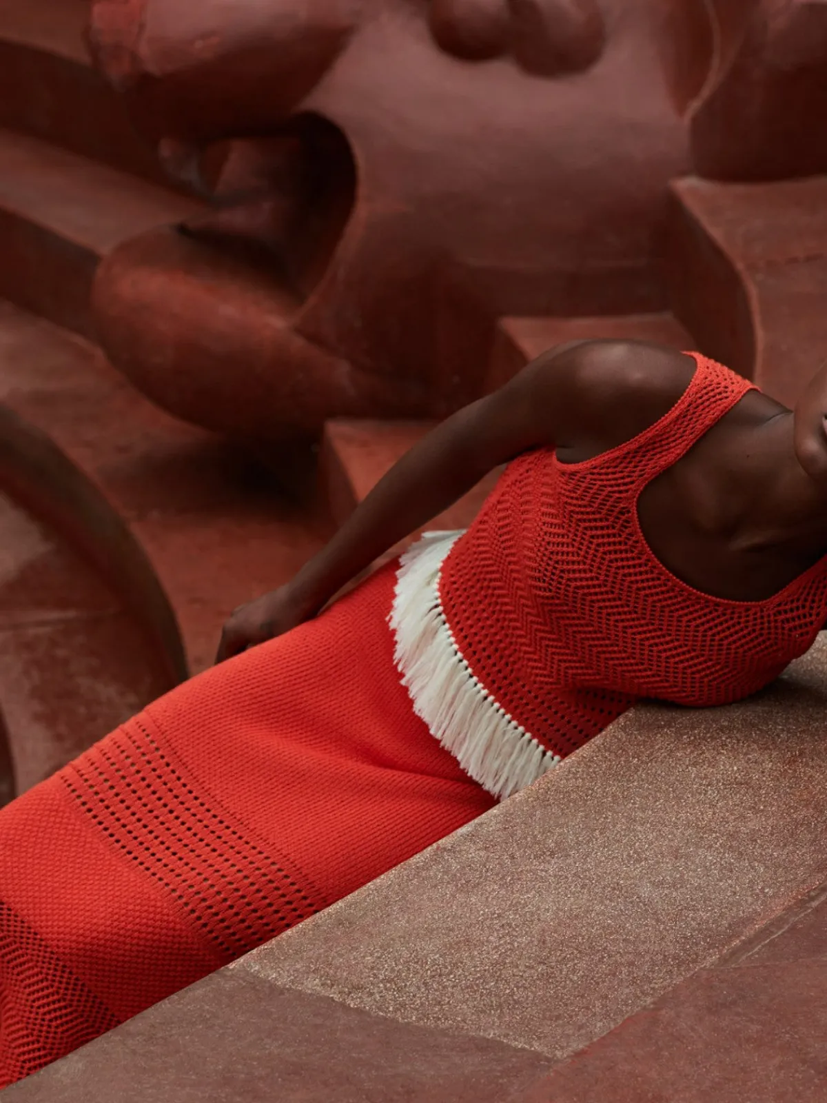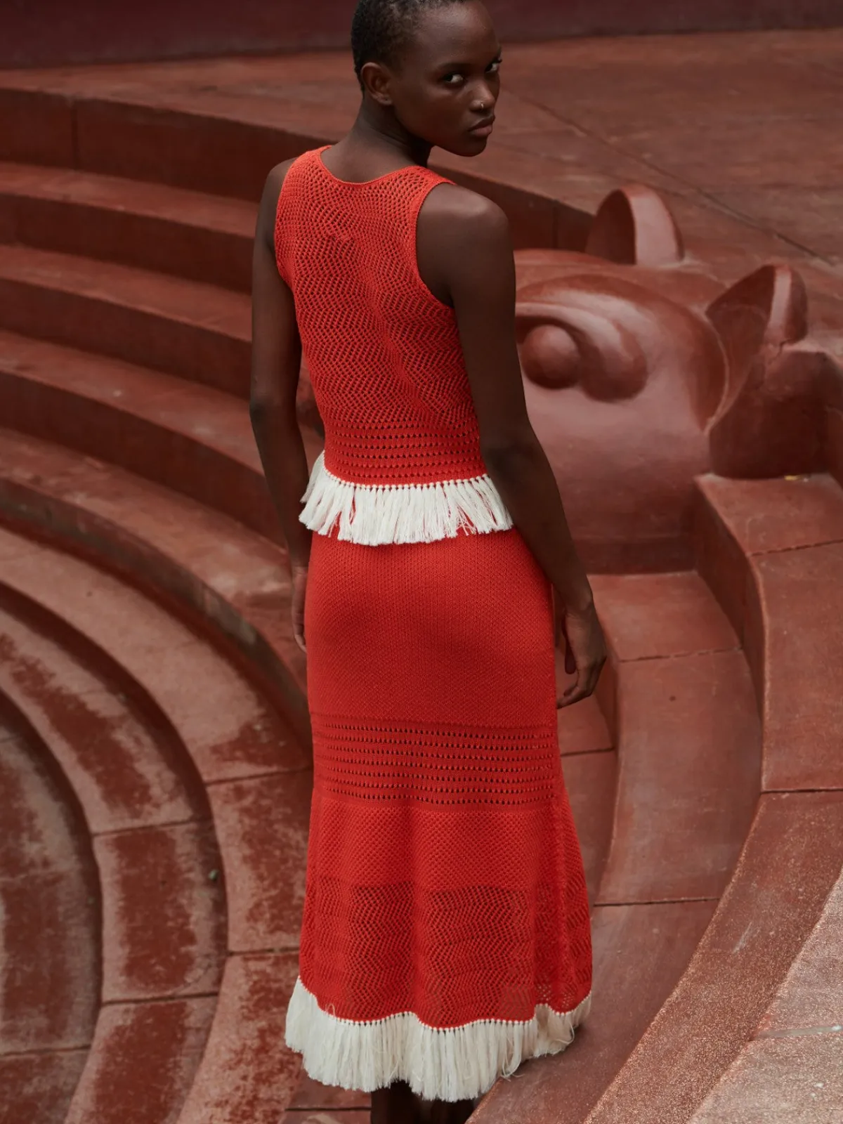 Our ESCVDO Carisa Top in Tangerine is asquare neckline with a fringe hemline.Handcrafted by Vilma Bautista in her workshop in Lima – Peru.