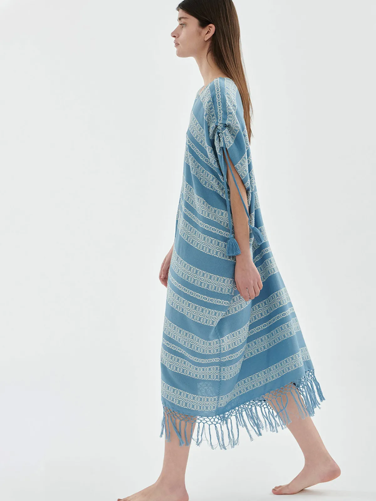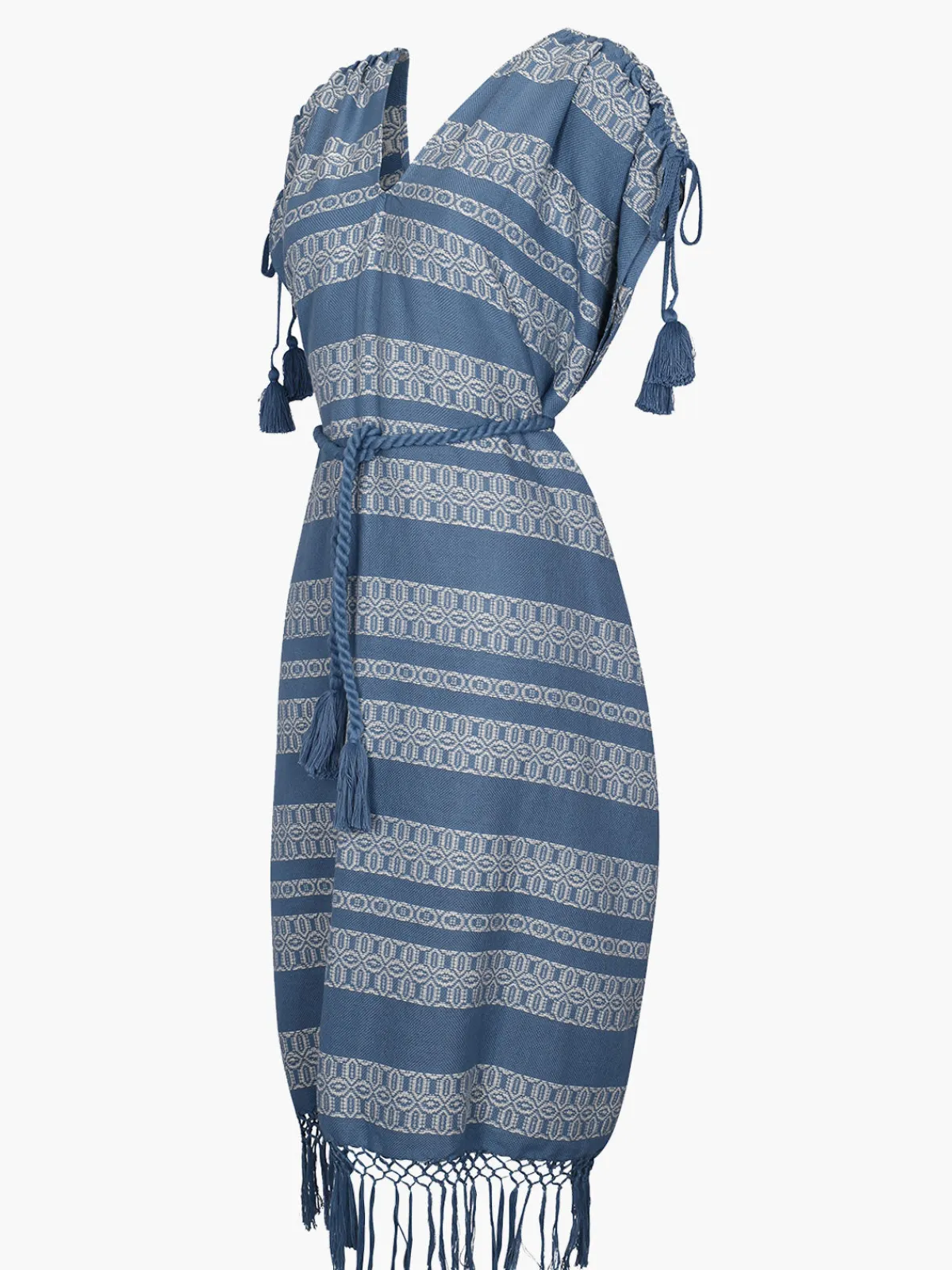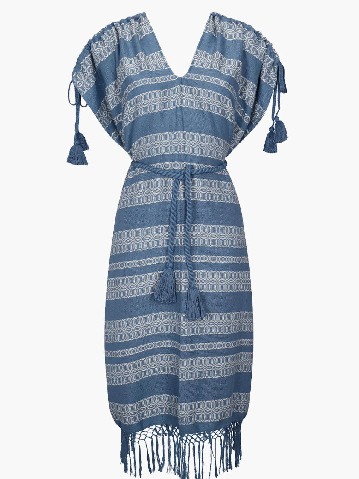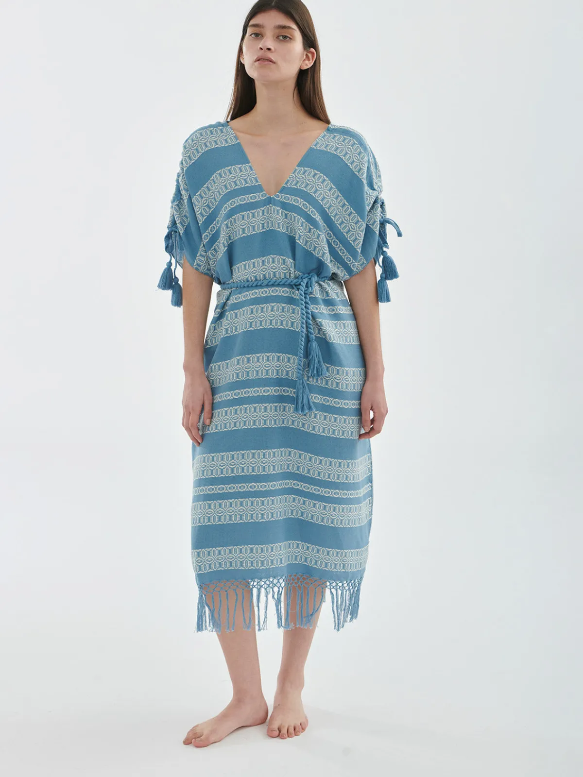 Our ESCVDO Enea Tunic in Sky Blue is a relaxed fit pull-on tunic that features a short v at neck and back and short sleeves with adjustable tassels. Finished with a removable braided cotton belt and fringe at hem. Handcrafted by female artisans in Peru.