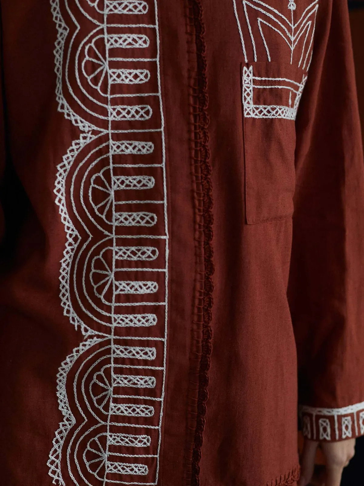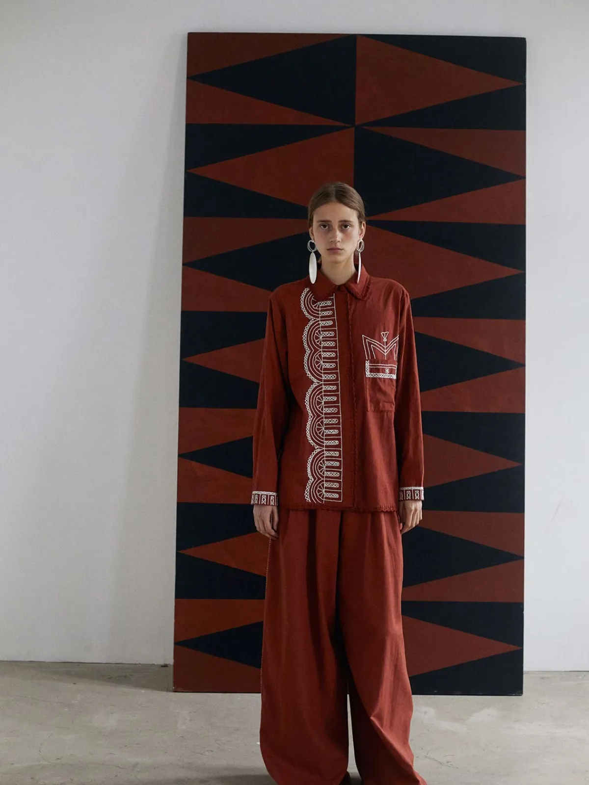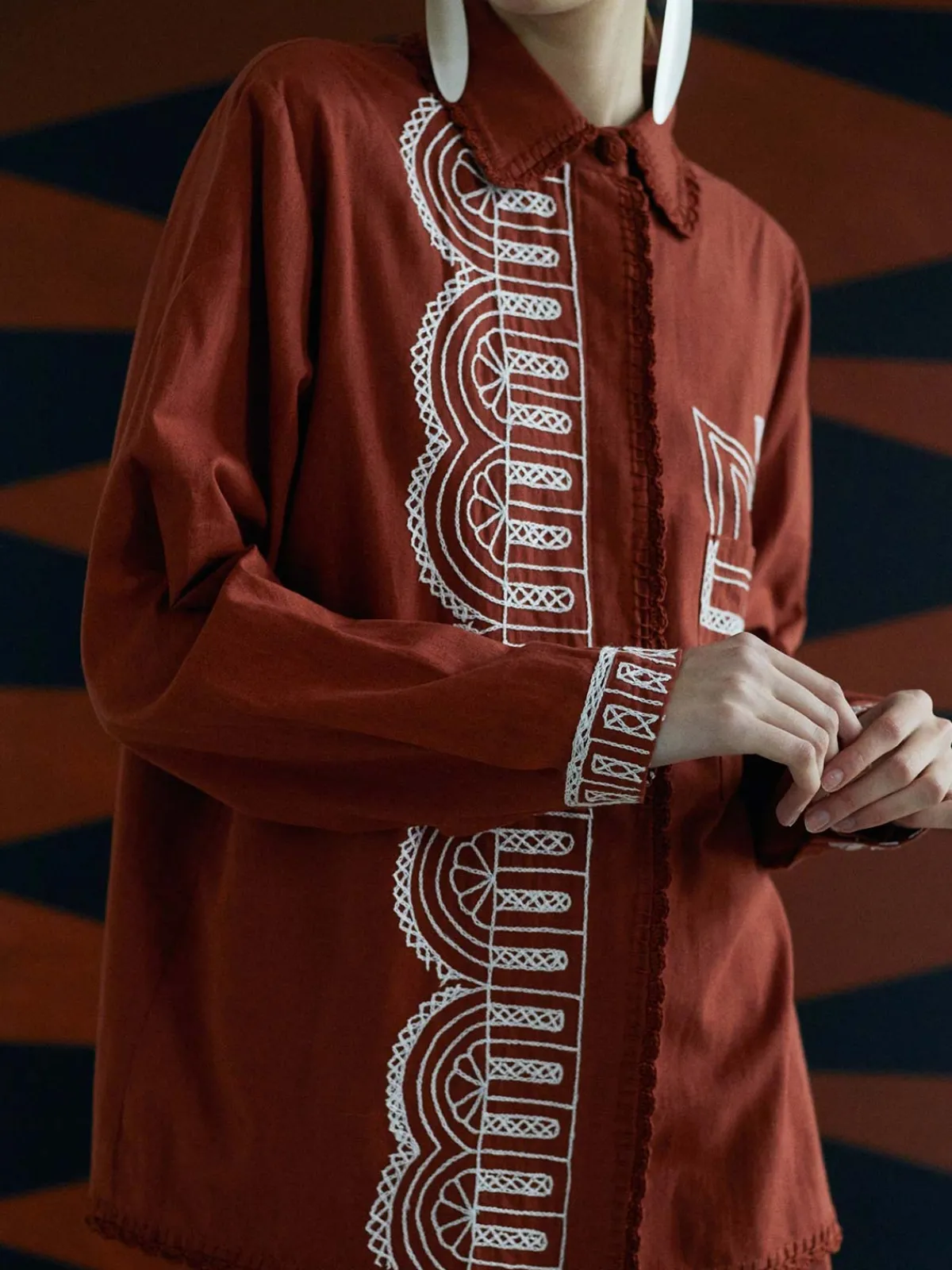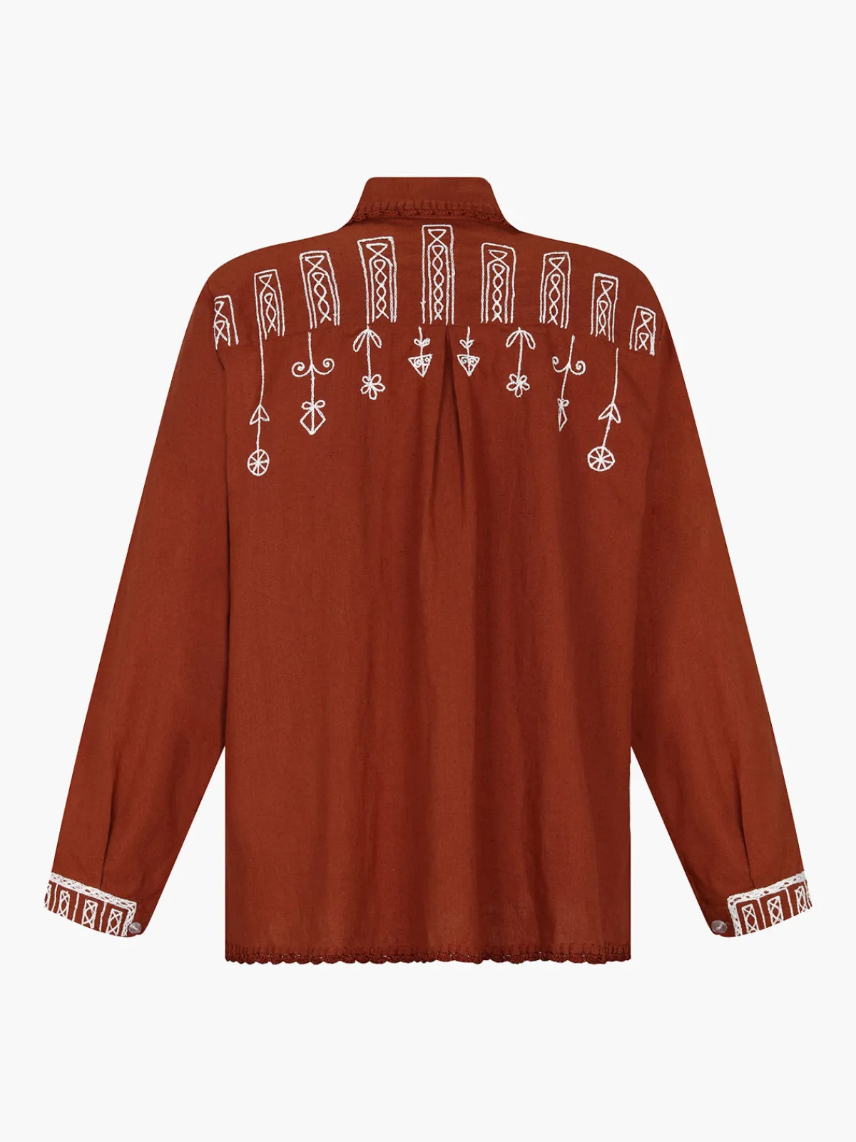 Our ESCVDO Esperanza Shirt is a unisex button down featuring hand embroidered detailing. Crafted by Maria Pía Montenegro and embroidered by Matilde Sánchez in her workshop in Lima, Peru.