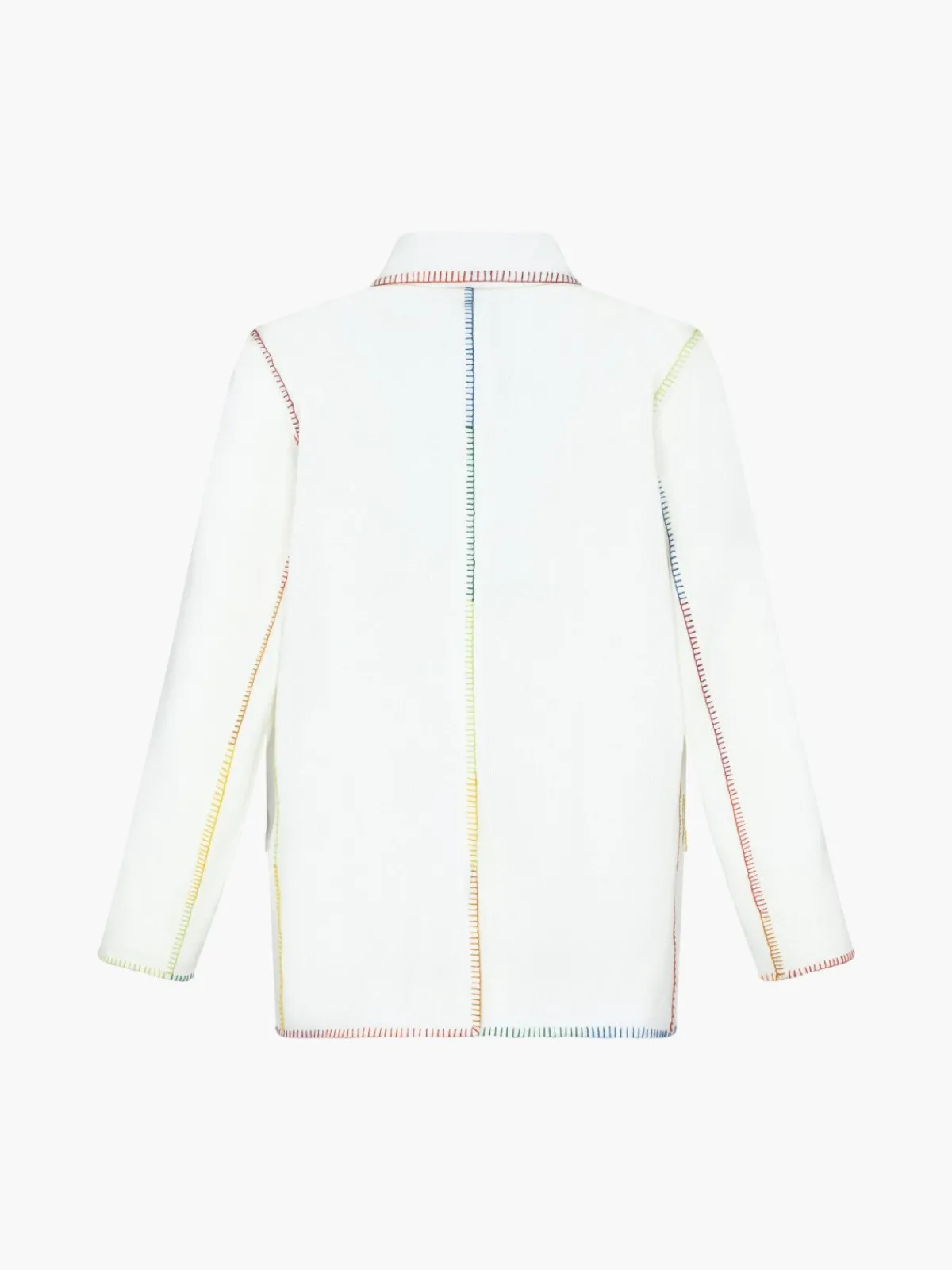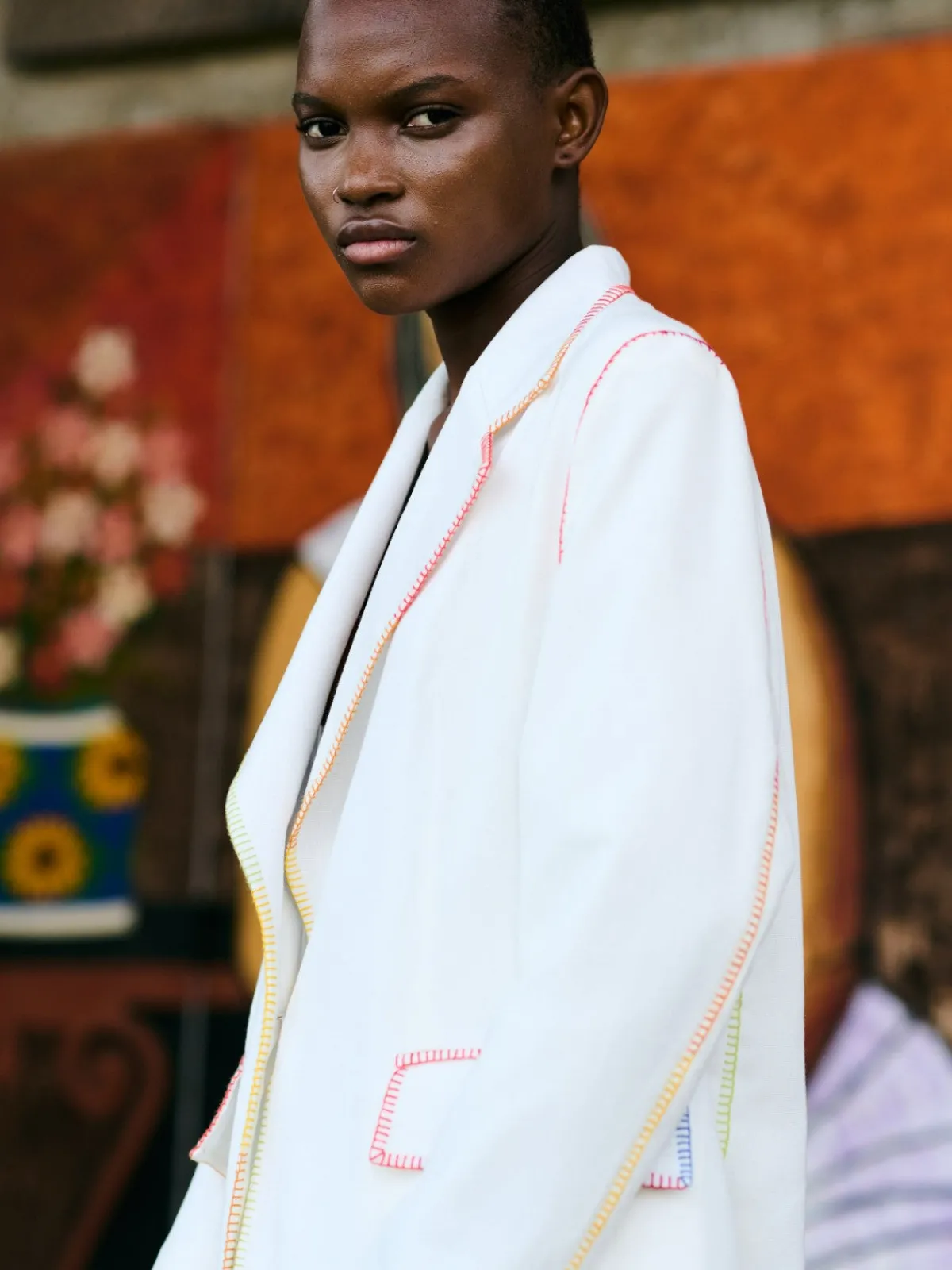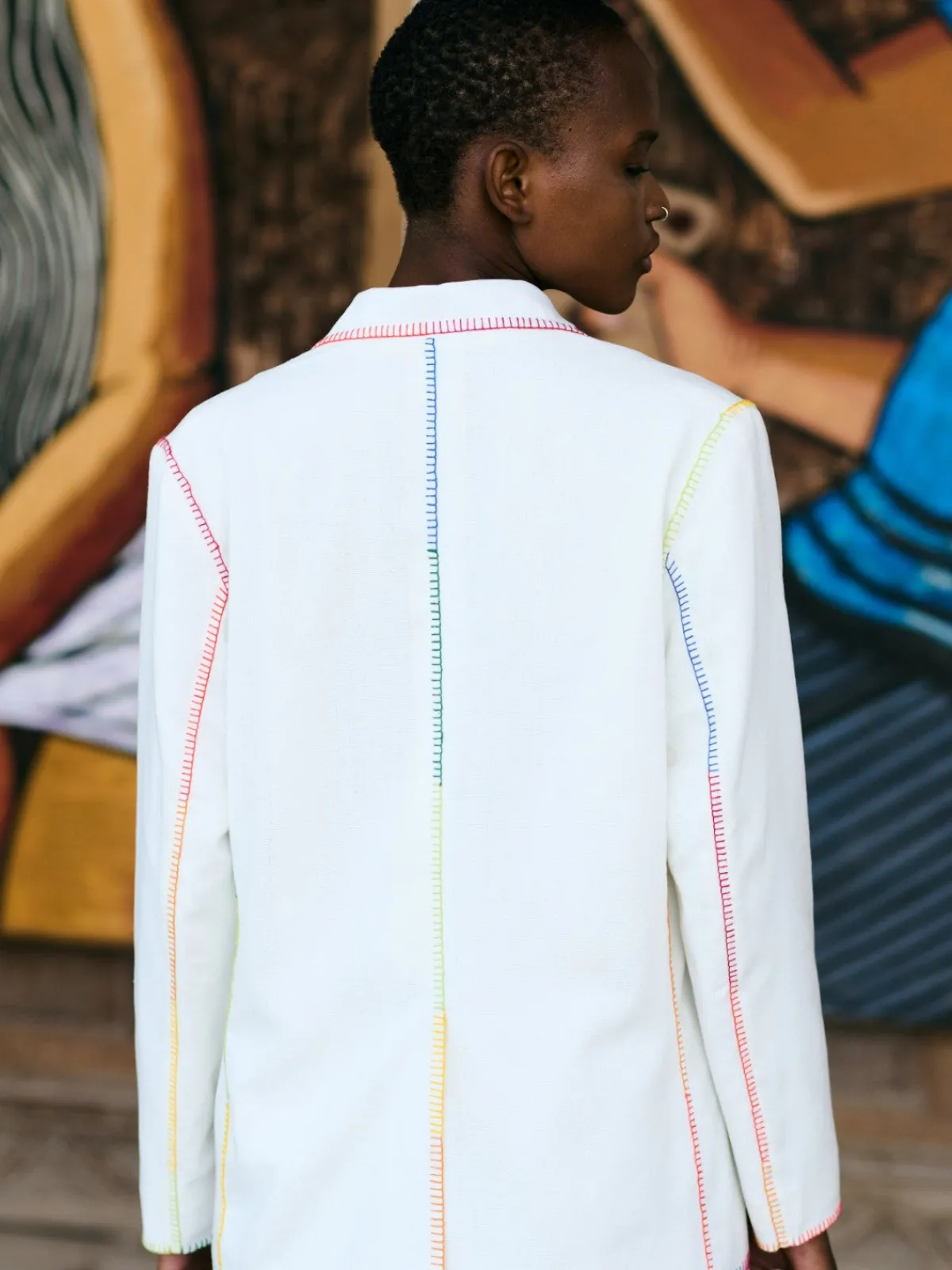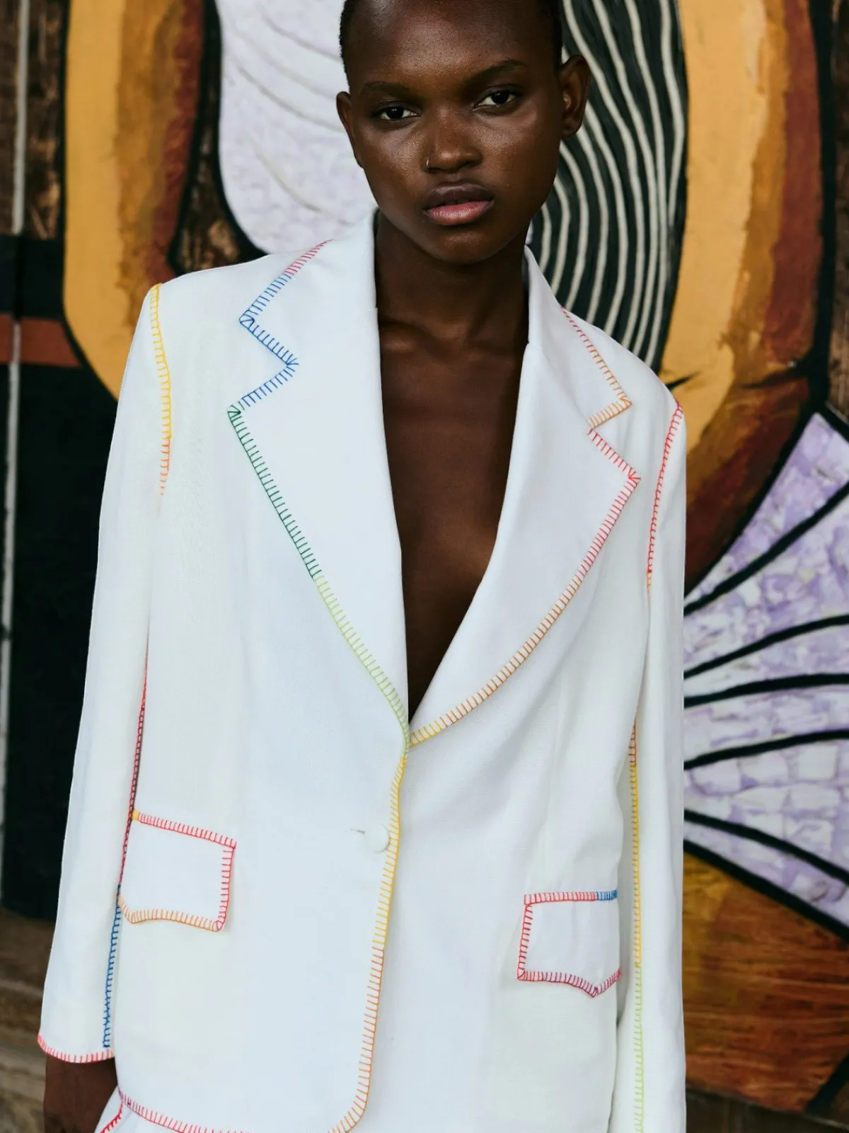 Our ESCVDOJarana Blazer inIvory is a straight blazer with embroidered detailing along the trims of the blazer. The blazer has front pockets with a front button. Handcrafted by Fidel Esquiche and embroidered by Matilde Sanchez in a workshop in Lima – Peru.