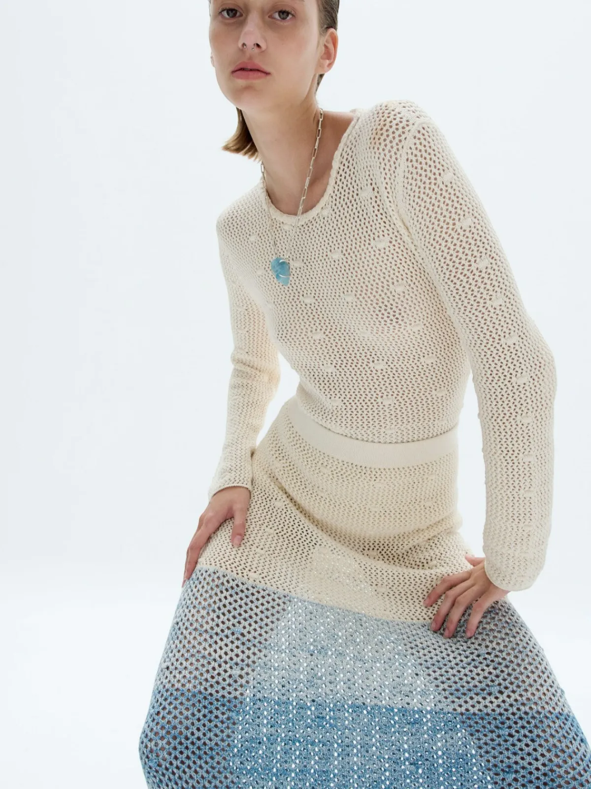 Our Escvdo Litoral Skirt in Sky Blue is a maxi a line skirt made from a soft Peruvian cotton. The skirt has a dip dye effect going from ivory to a sky blue. This item was handcrafted by Miriam Garay in her workshop in Huarochirí, Peru.