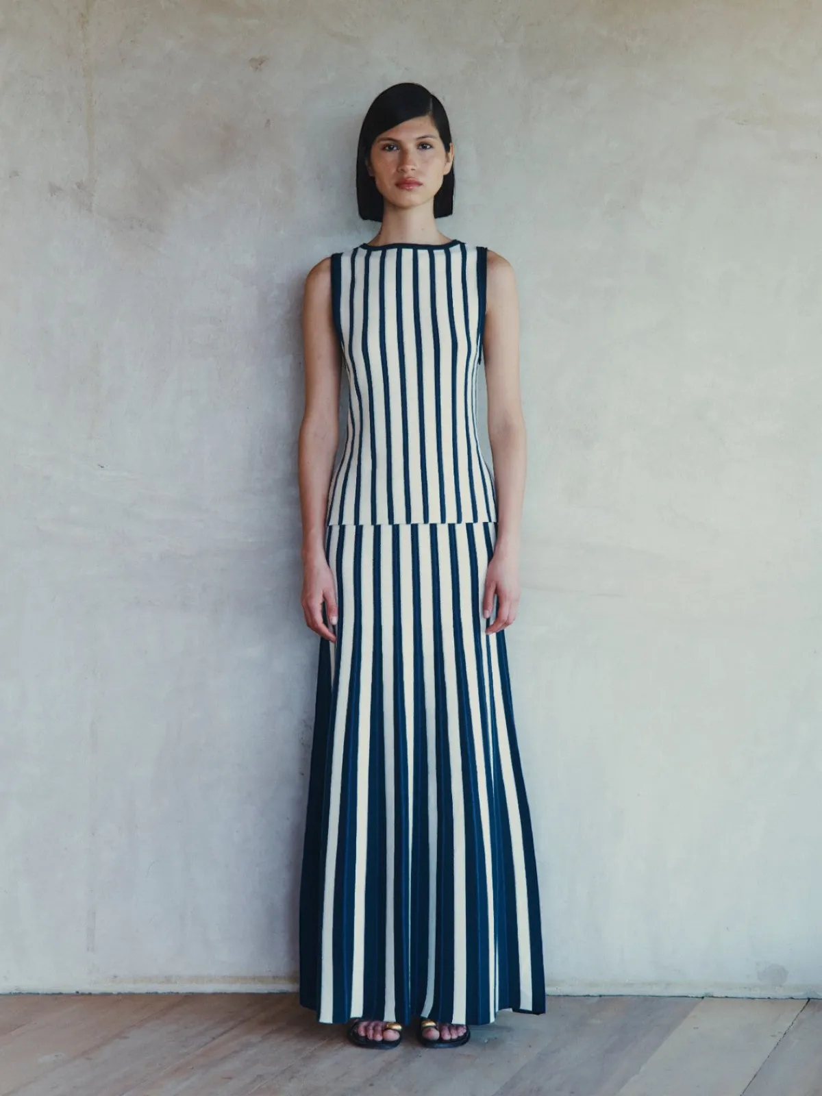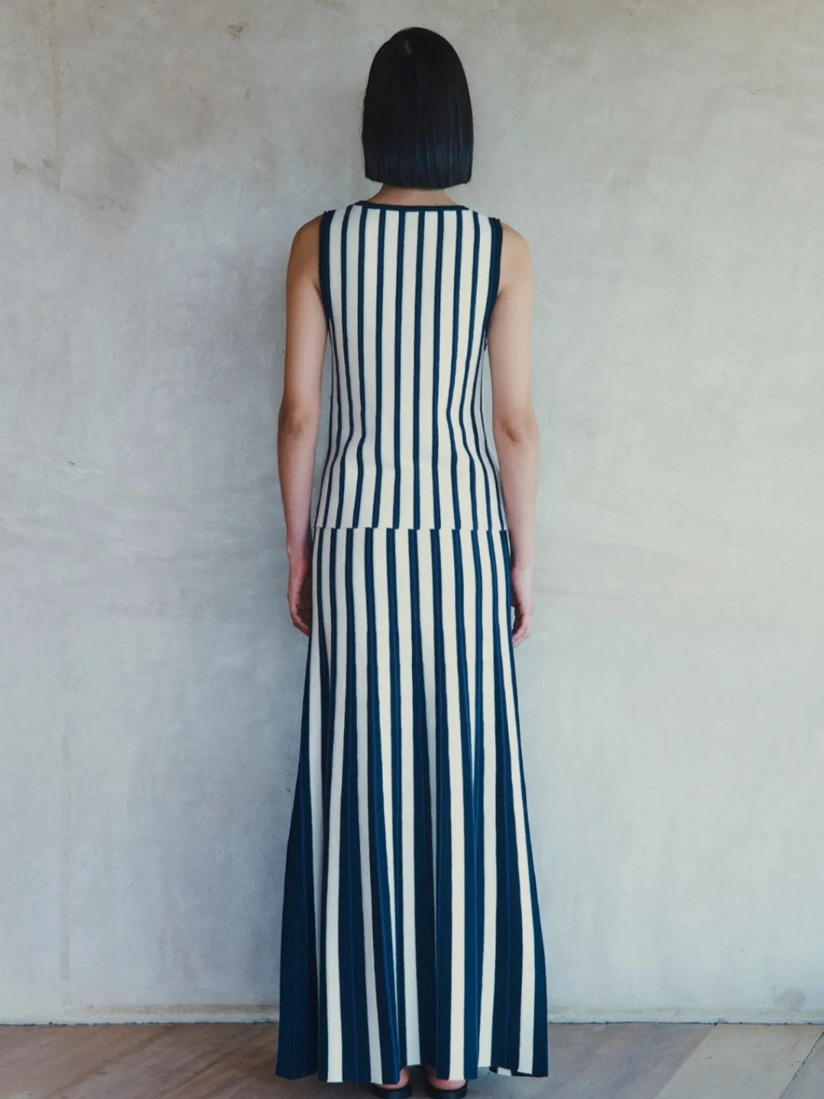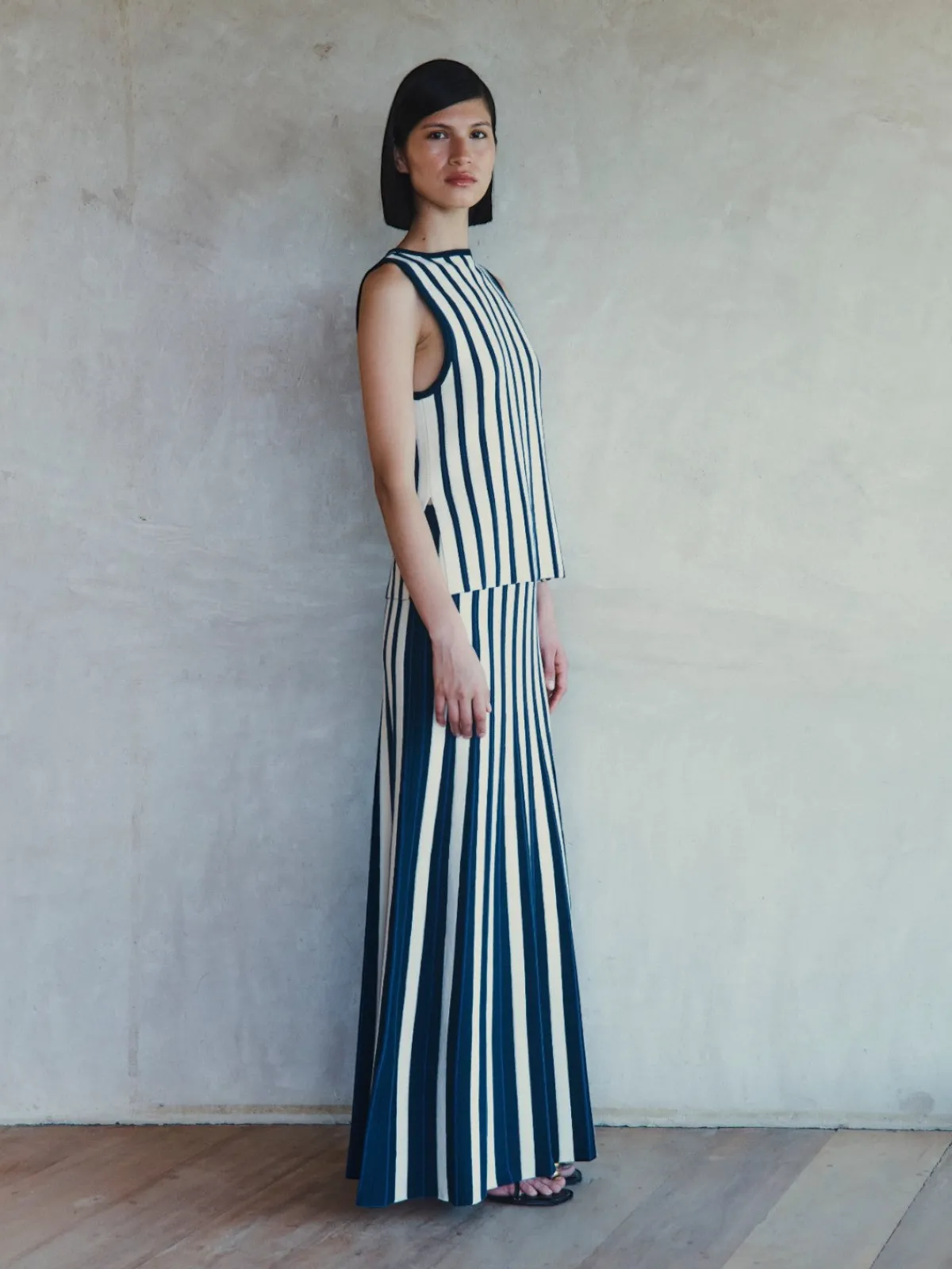 Our ESCVDO Manglar Sleeveless Top in Blues is a sleeveless top in a striped print with slits on the side. This piece was made by Jessica Huamán, at her workshop in Villa Maria del Triunfo, Lima, Peru.