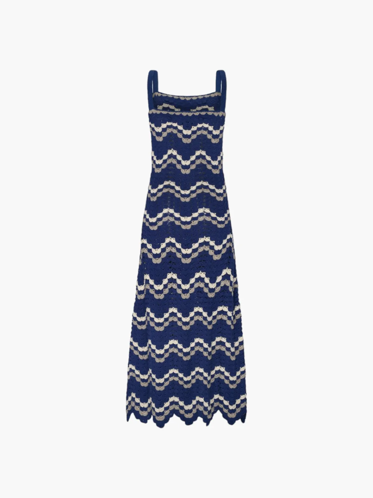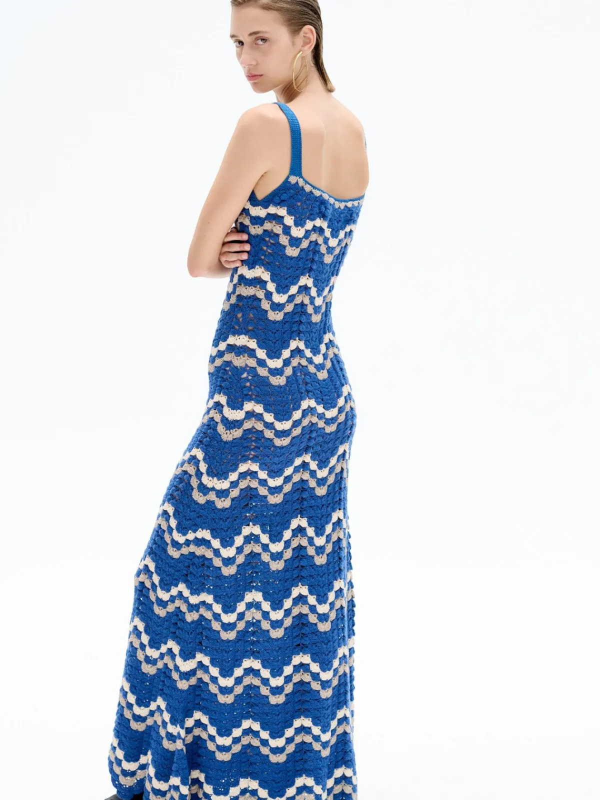 Our Escvdo Marea Dress in Blue is a maxi length dress with a mermaidsilhouette. This dress features a chevron print and scalloped hem. This item was handcrafted by Miriam Garay in her workshop in Huarochirí, Peru.