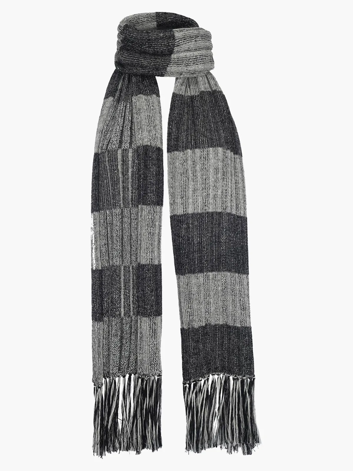 Our ESCVDO Marini Scarf boasts a slender rectangular shape in a two-tone pattern with horizontal stripes, a vertical rib knit texture, and fringe trim. Handcrafted by female artisans in Peru.